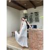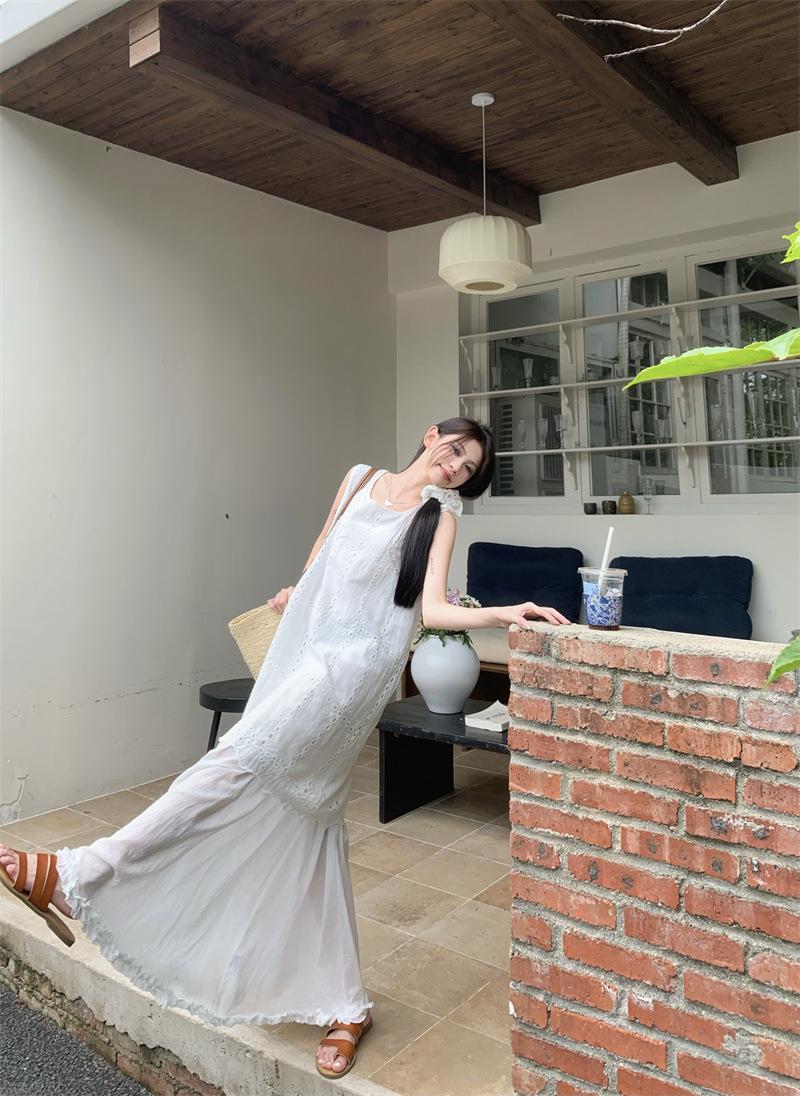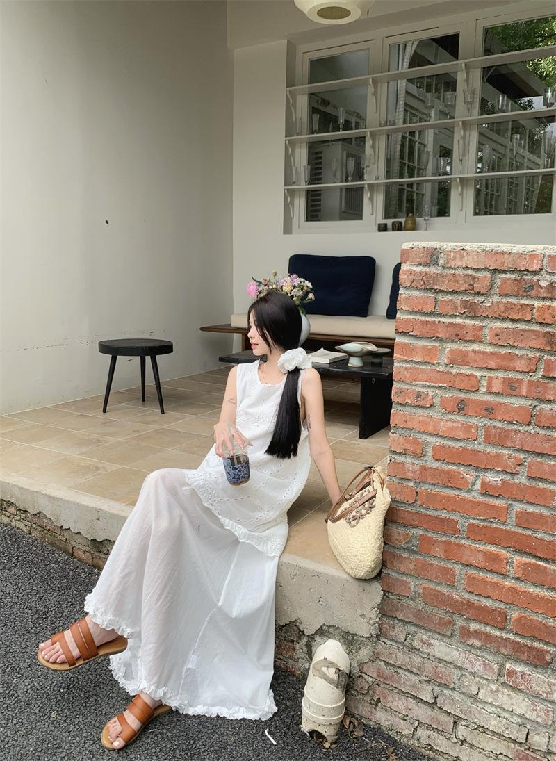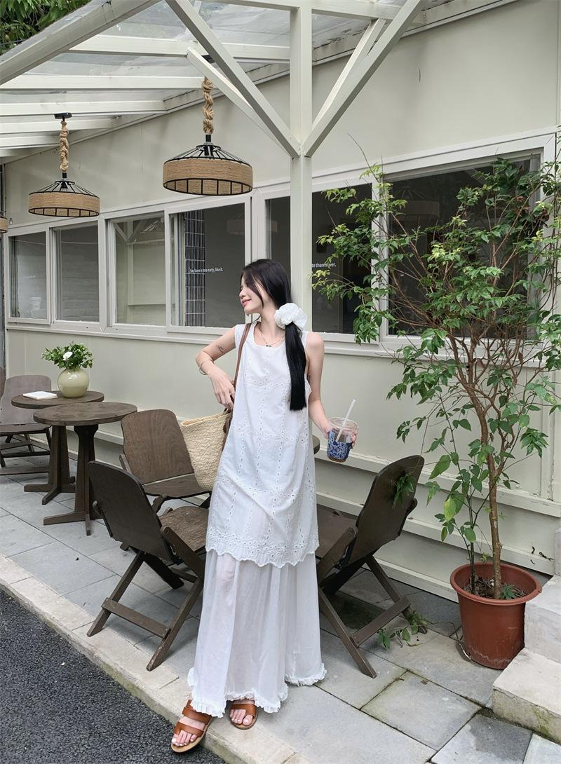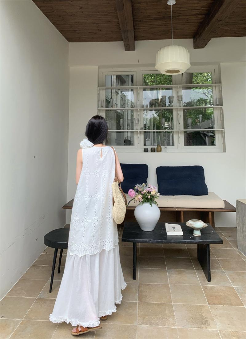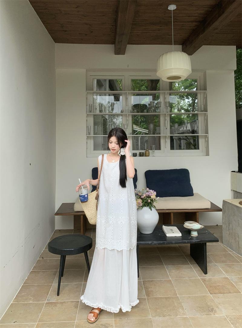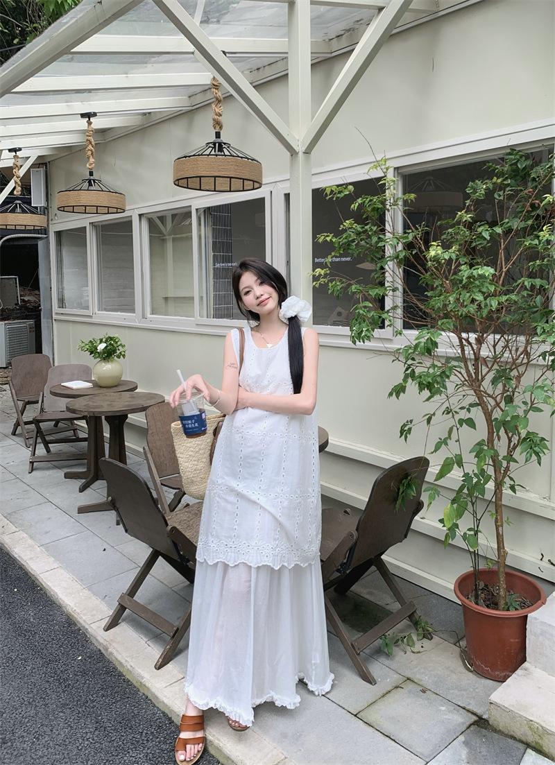 Vestido Perezoso de Estilo Falso de Dos Piezas con Empalme para Mujer Verano 2025 Nuevo Falda Larga Jacquard Blanca Sin Mangas Ceñida a la Cintura