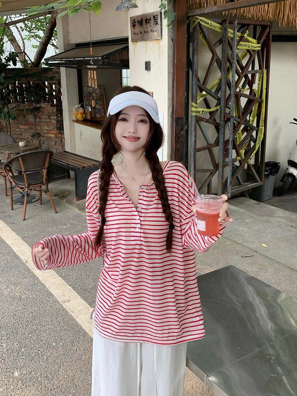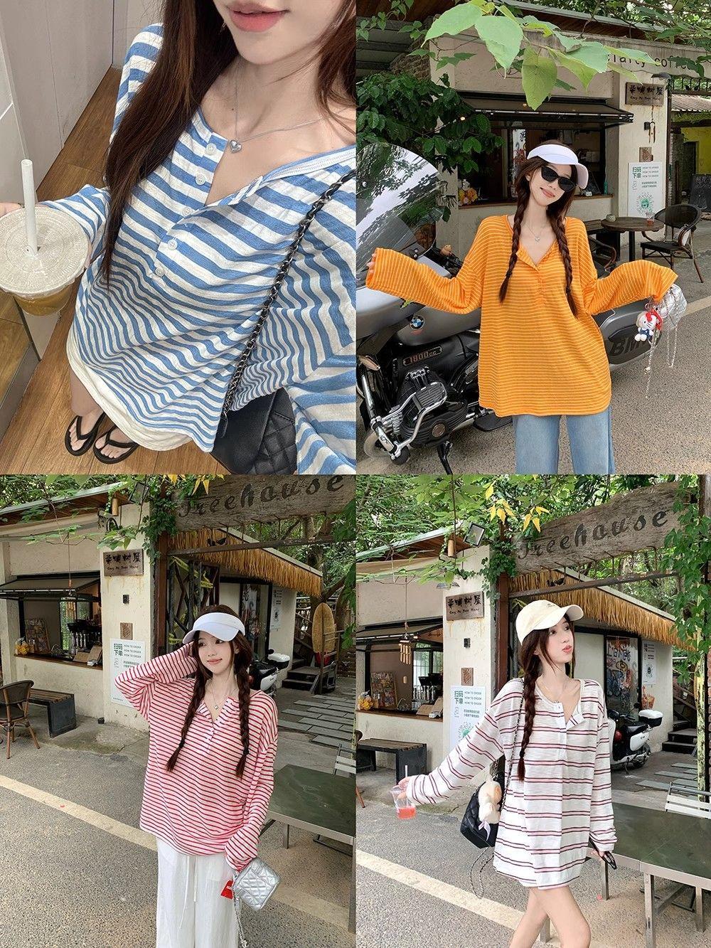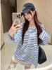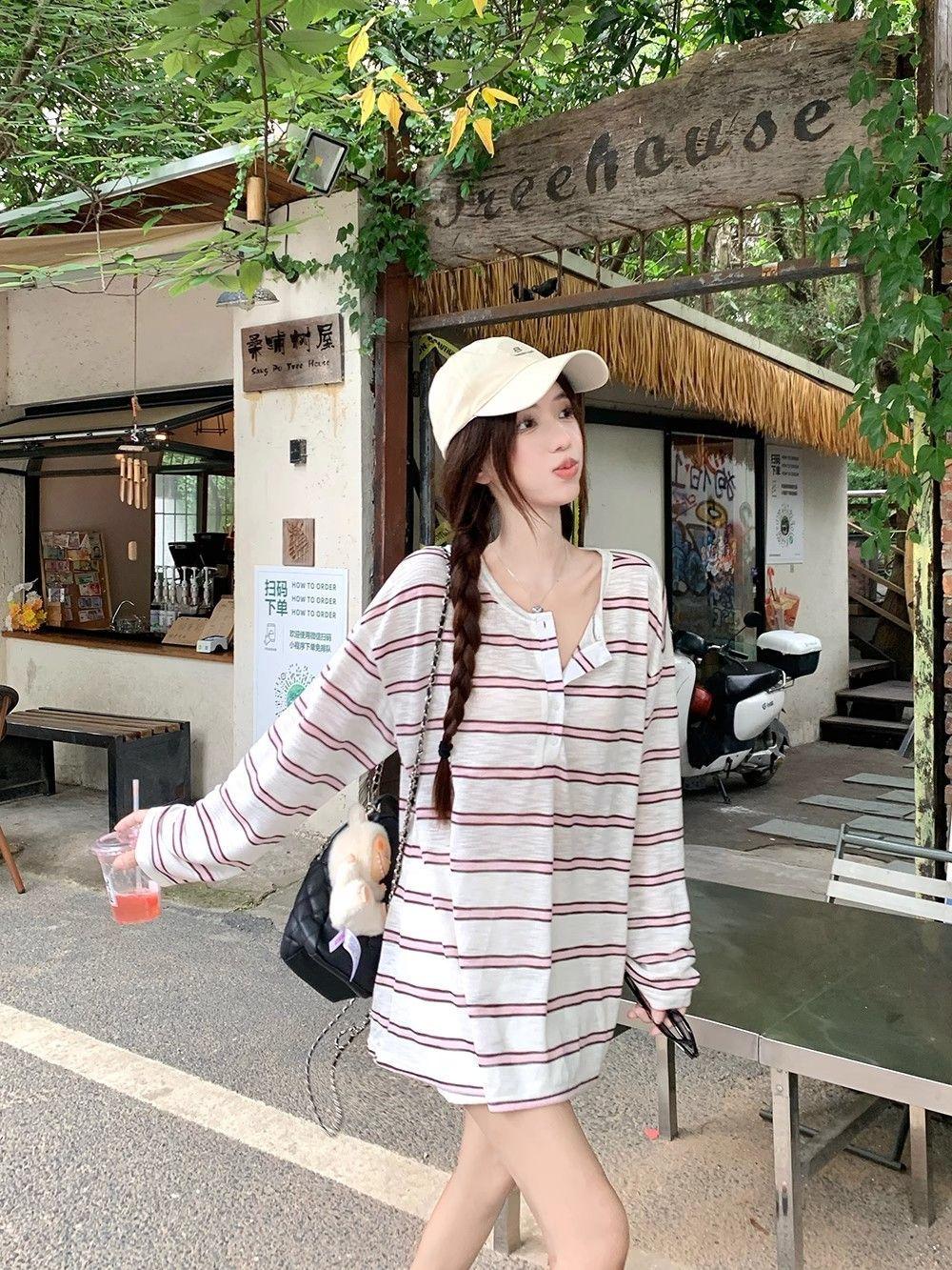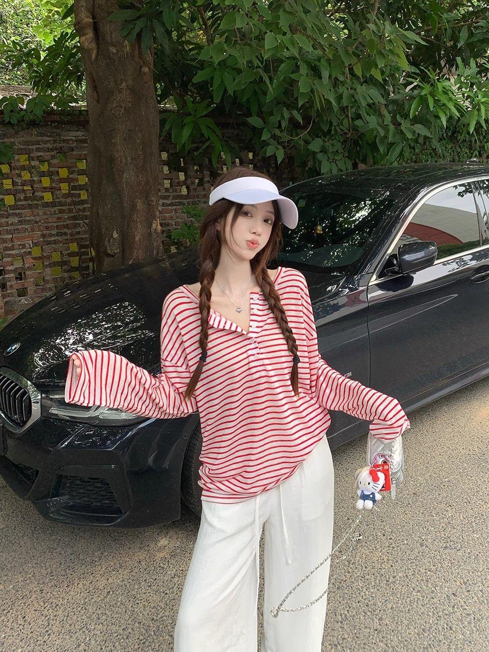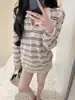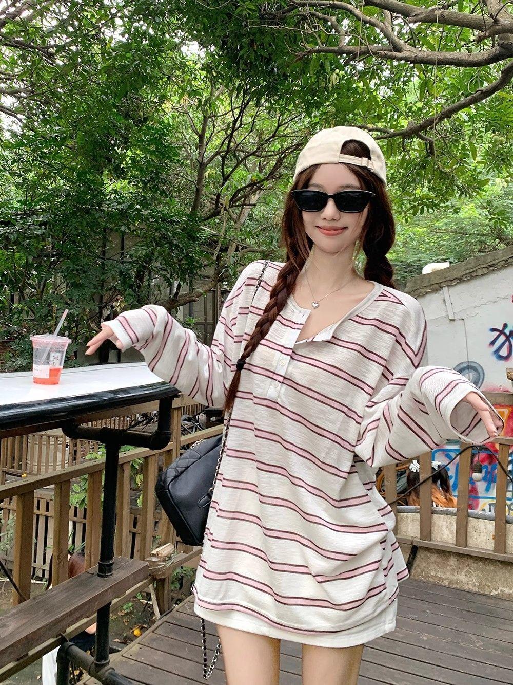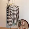 ¡En stock! Camiseta de manga larga a rayas con bloques de color drapeada estilo coreano para mujer, otoño nueva holgada delgada perezosa top cárdigan