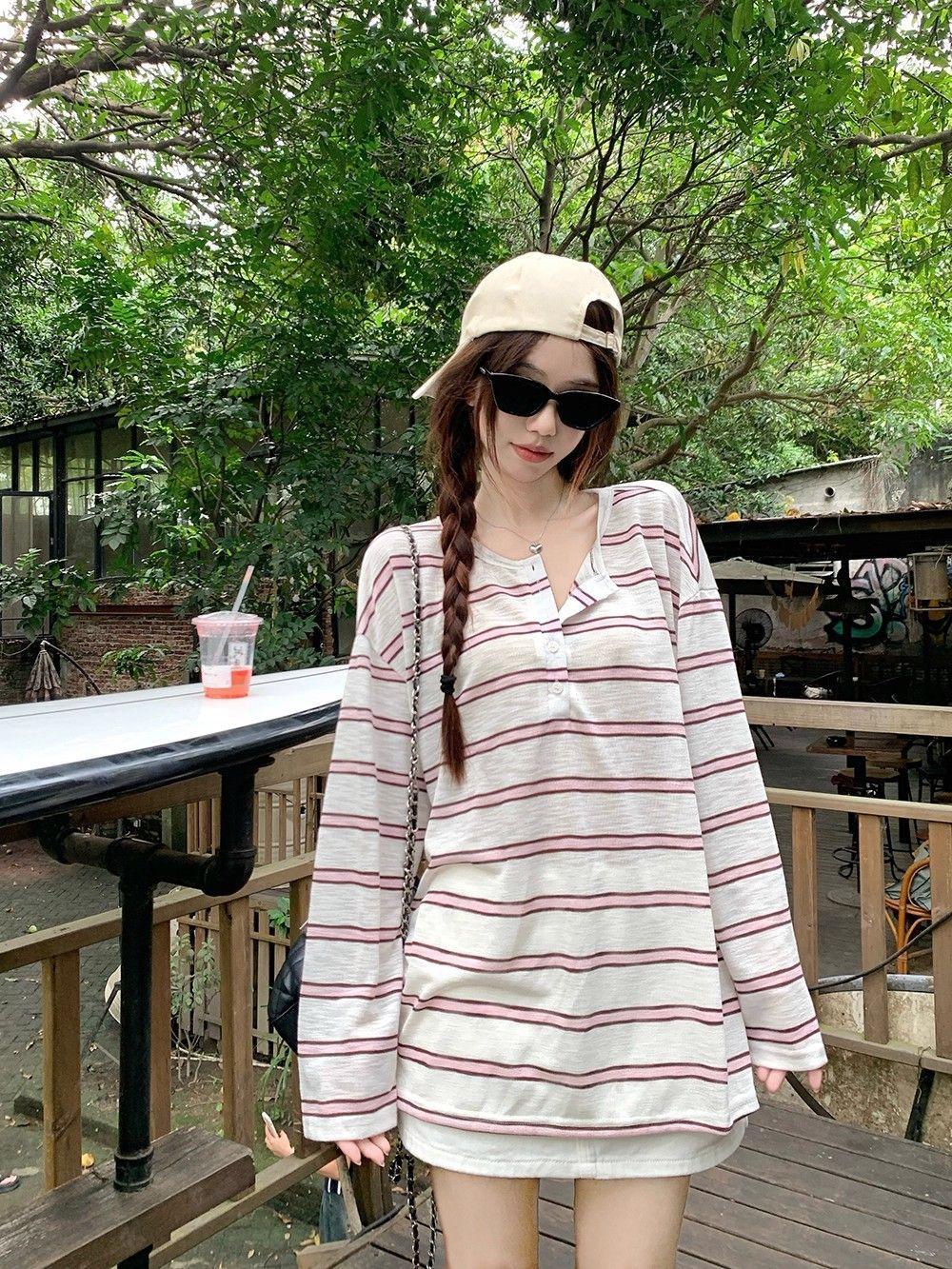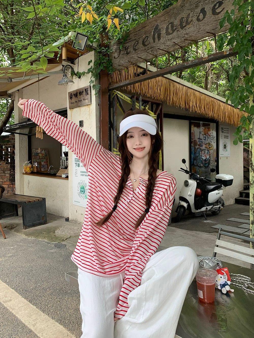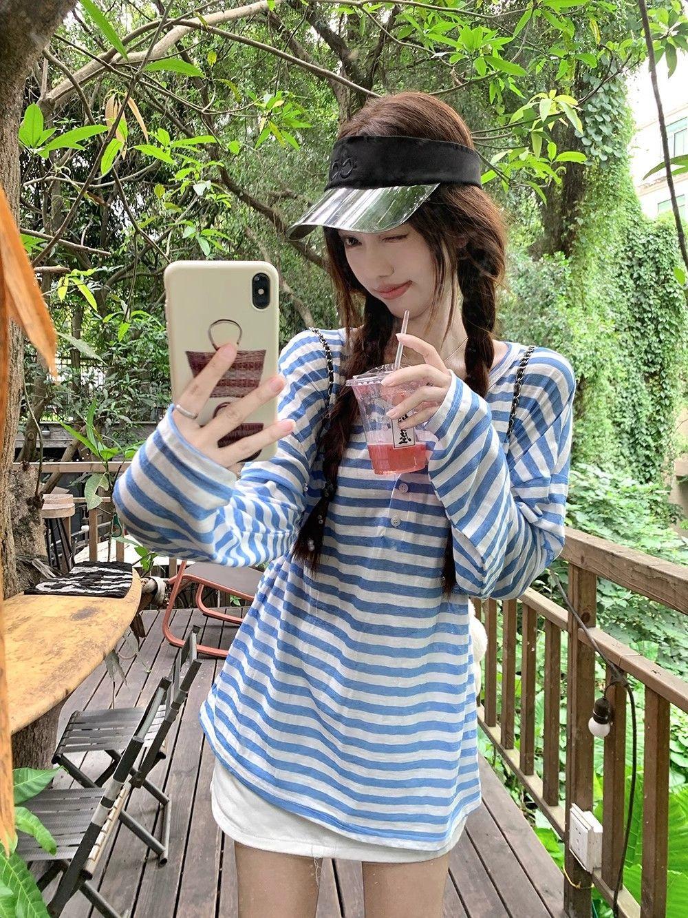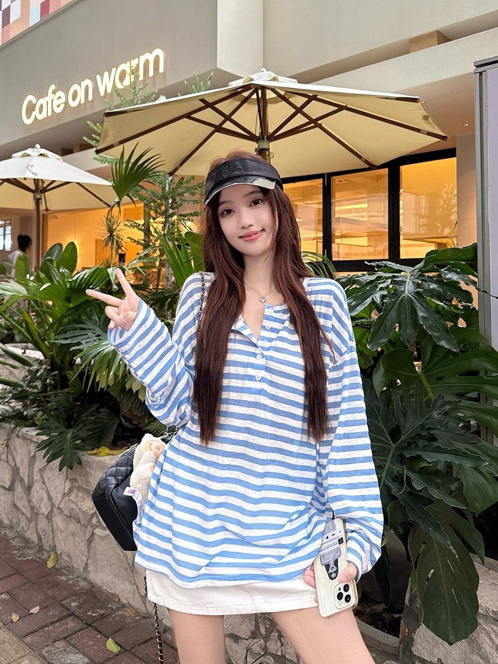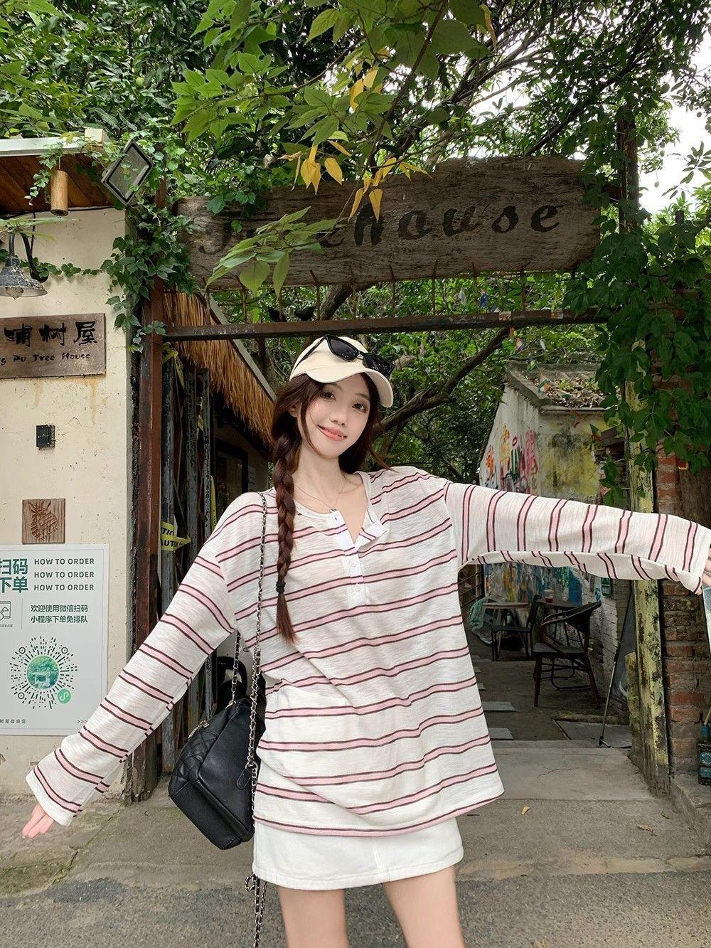 ¡En stock! Camiseta de manga larga a rayas con bloques de color drapeada estilo coreano para mujer, otoño nueva holgada delgada perezosa top cárdigan