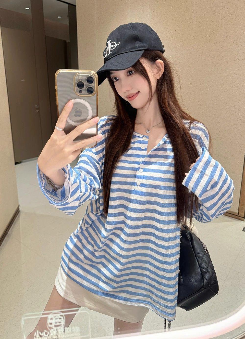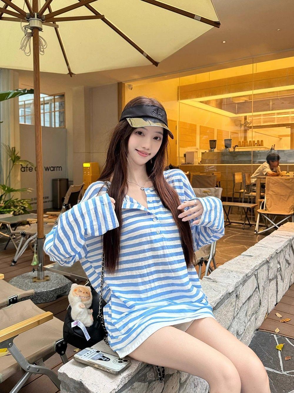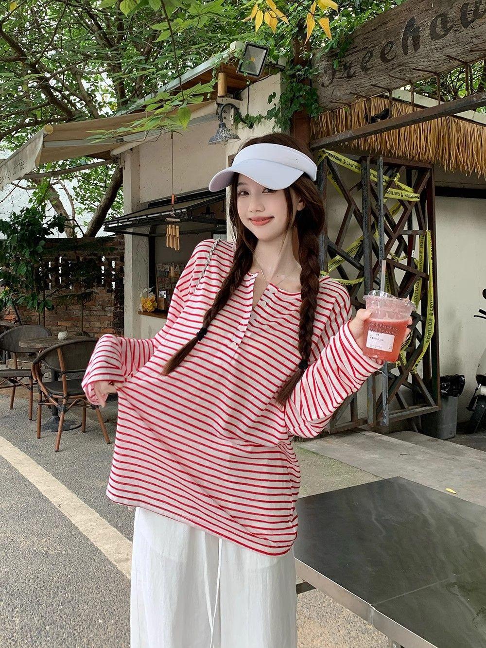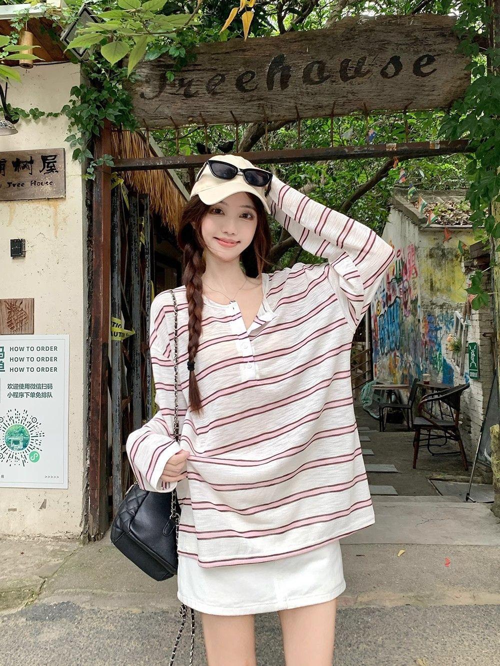 ¡En stock! Camiseta de manga larga a rayas con bloques de color drapeada estilo coreano para mujer, otoño nueva holgada delgada perezosa top cárdigan