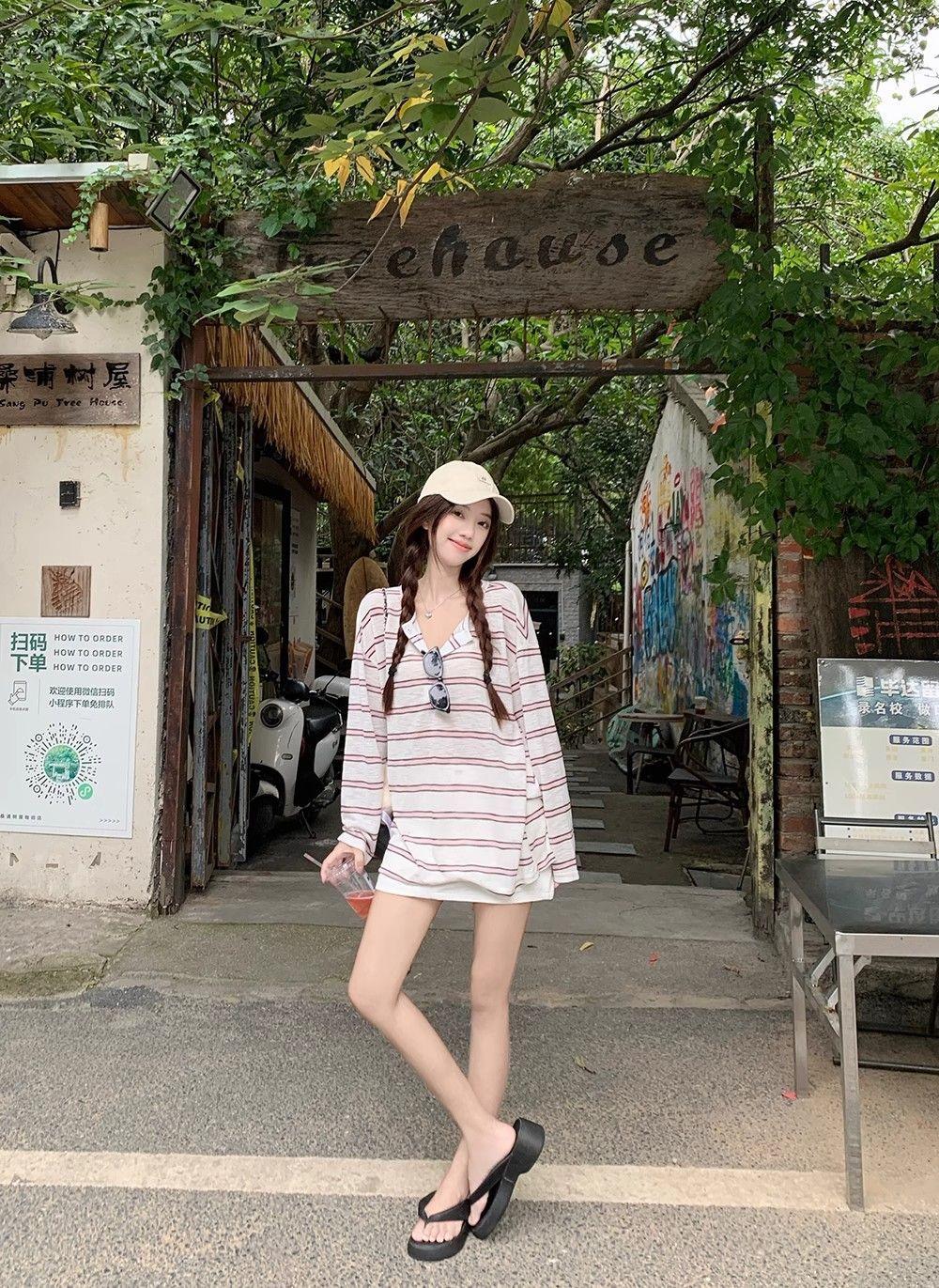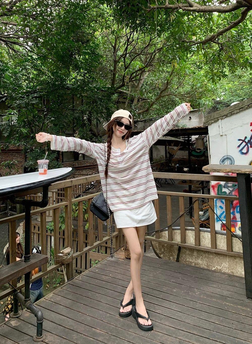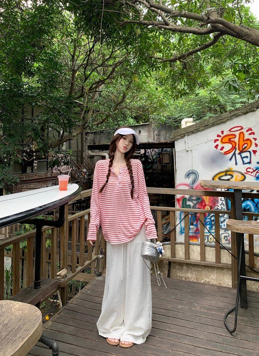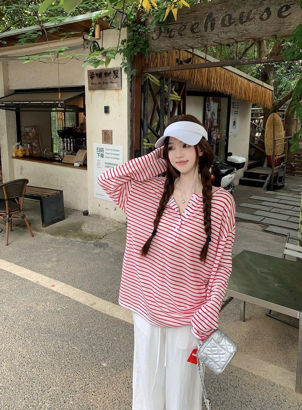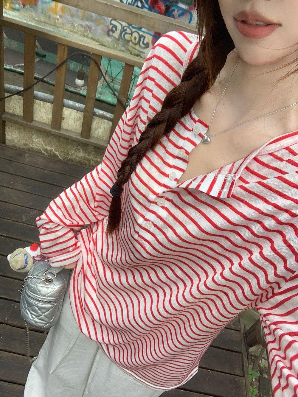 ¡En stock! Camiseta de manga larga a rayas con bloques de color drapeada estilo coreano para mujer, otoño nueva holgada delgada perezosa top cárdigan