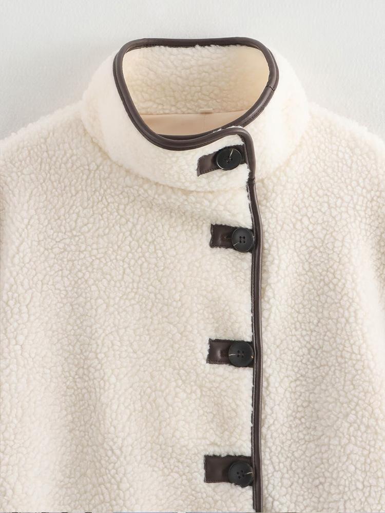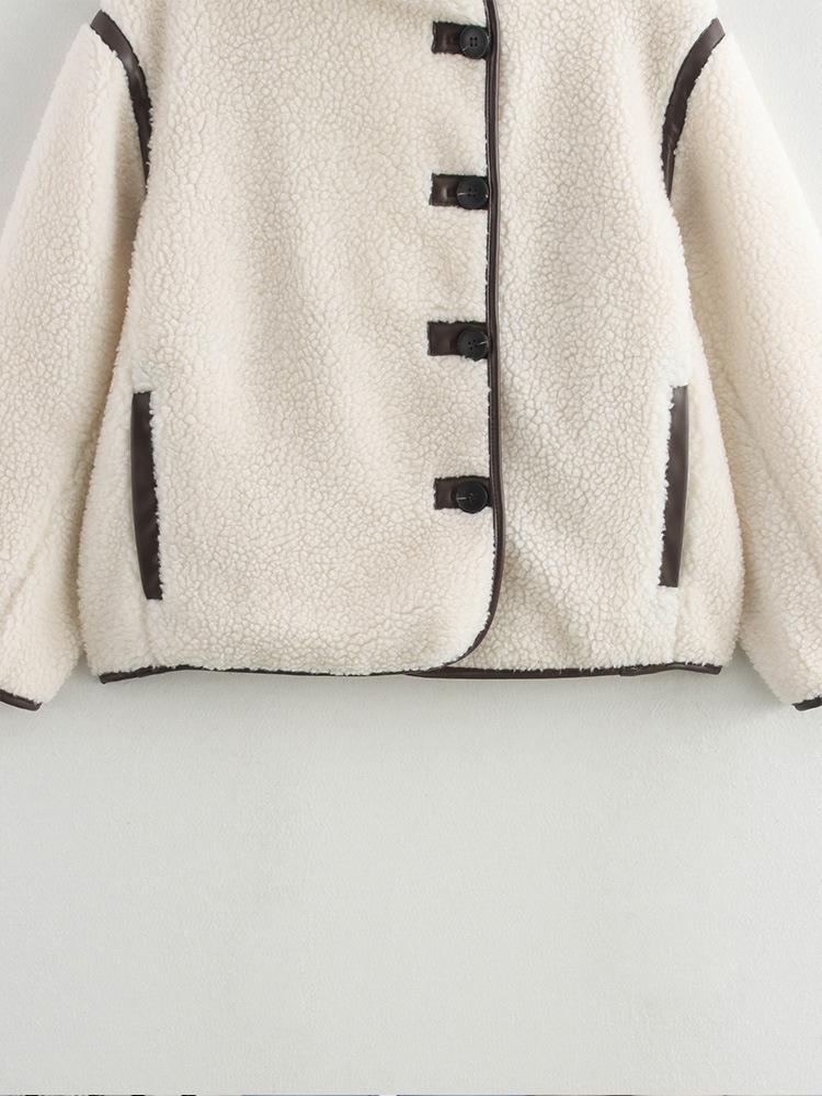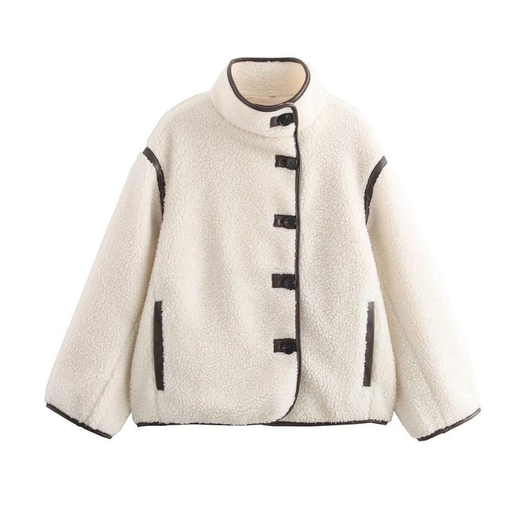 Nuevo Otoño e Invierno 2024 Versátil Chaqueta de Lana de Cordero Casual Suelta para Mujer con Cuello Mao, Solapa, Bolsillos, Manga Larga y Botonadura Simple