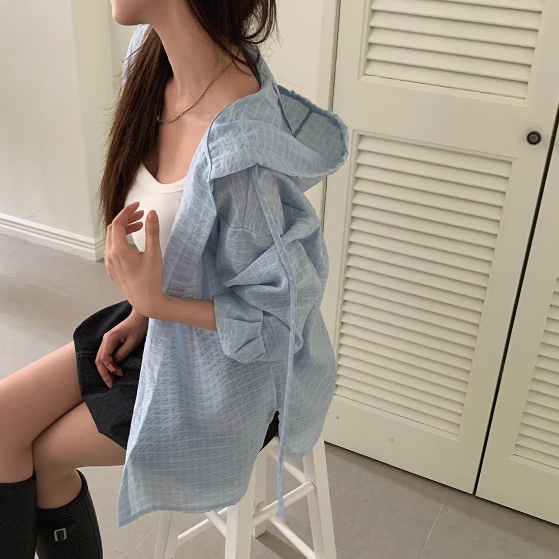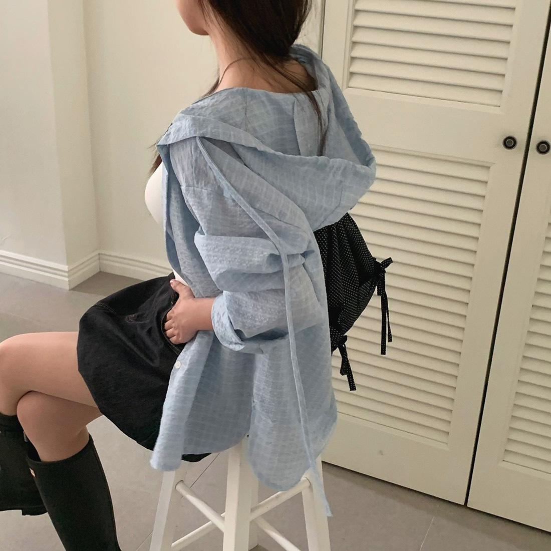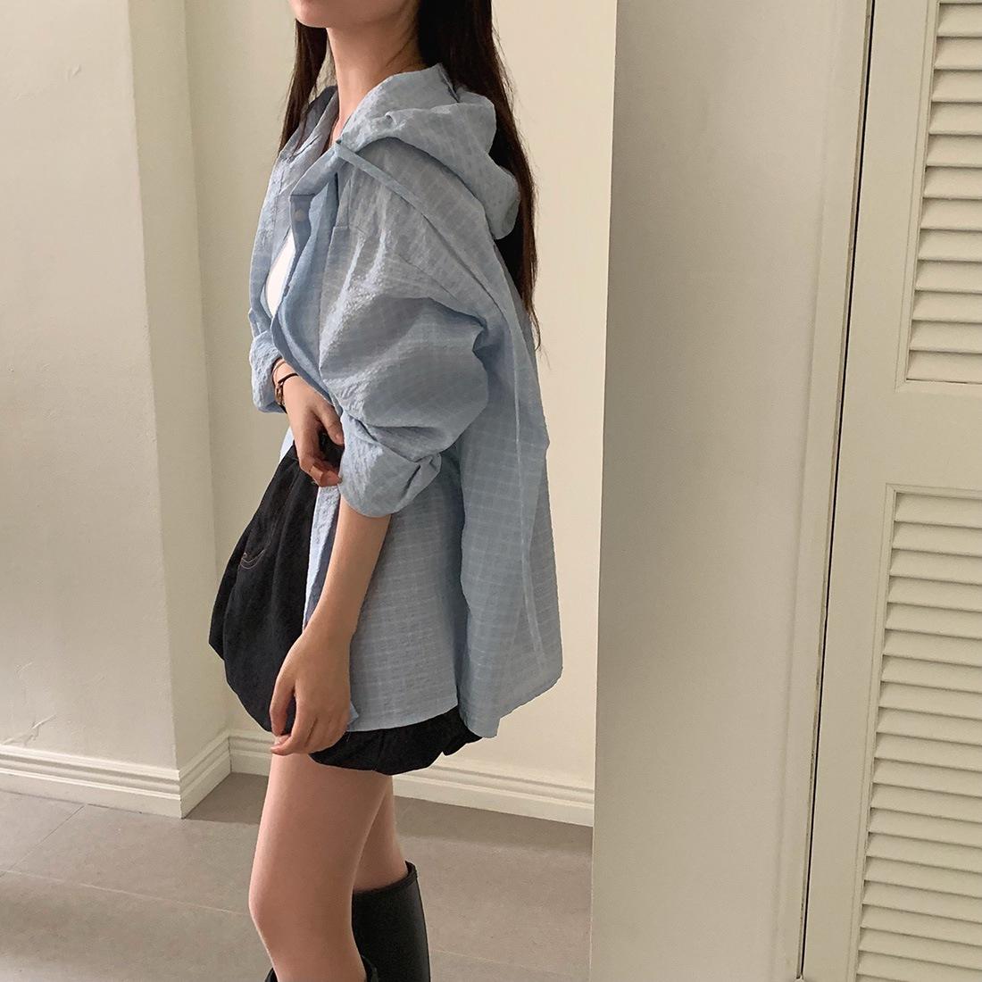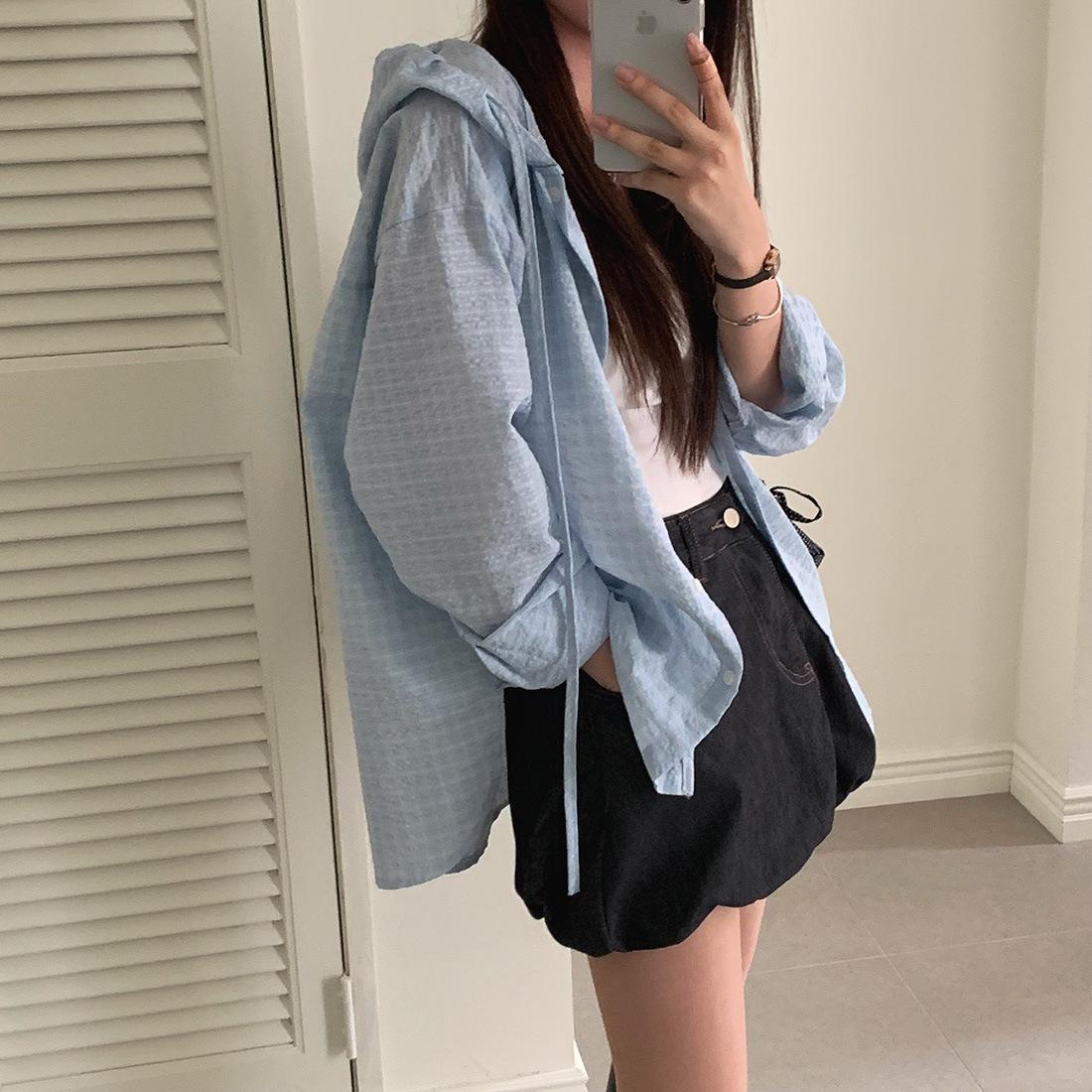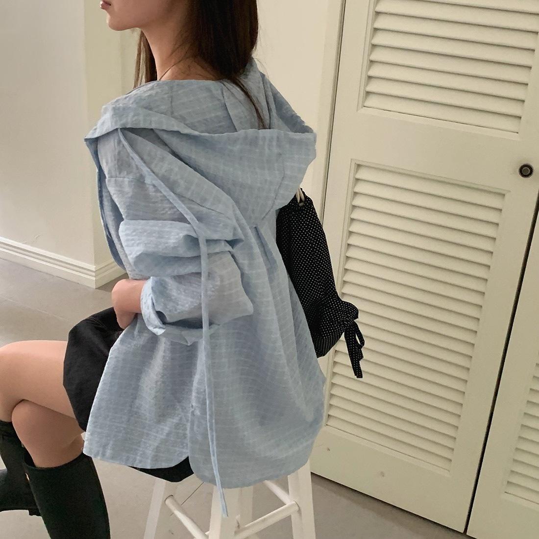 Chic coreano principios de otoño nuevo delgado protector solar universitario retro a cuadros relajado camisa con capucha