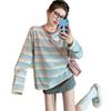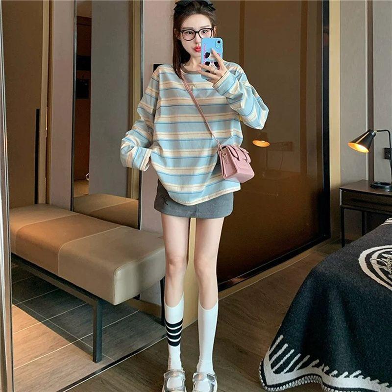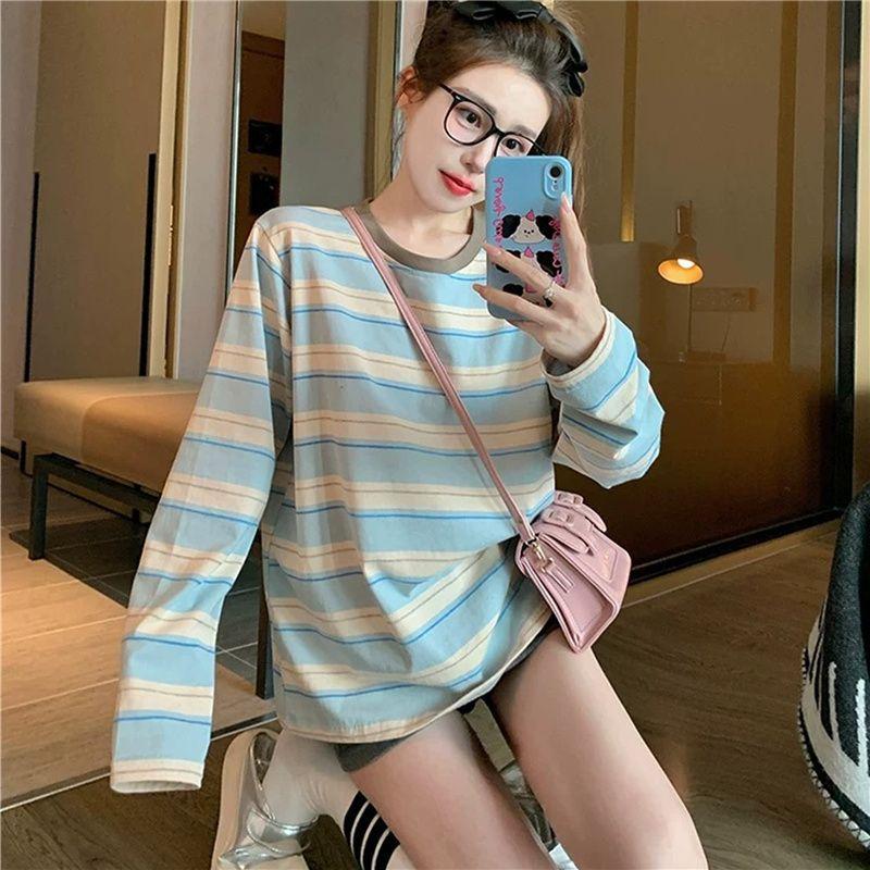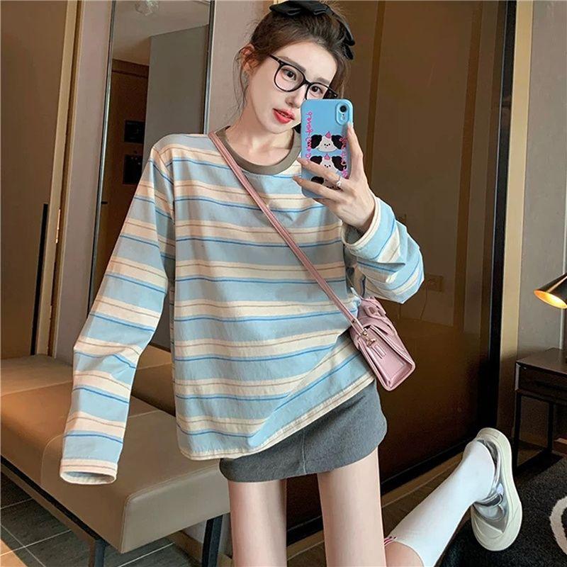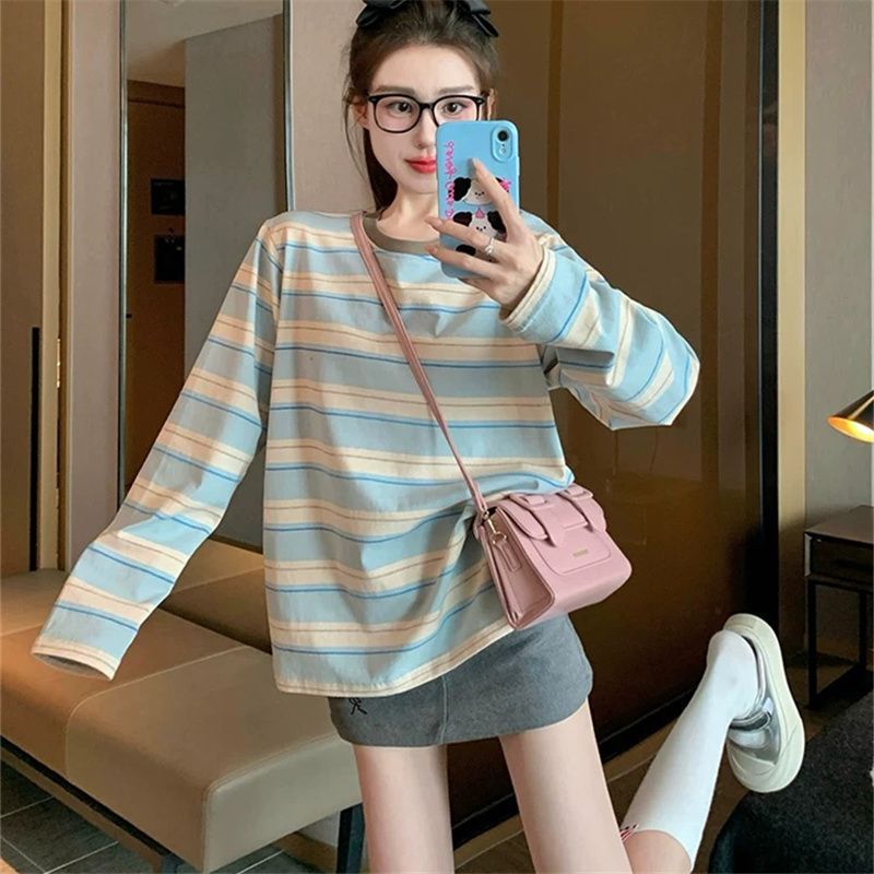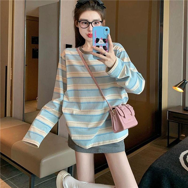 Playera de Manga Larga a Rayas Azules para Mujer Otoño de Gama Alta Holgada Casual Estilo Universitario Petite Capa Base Top ins