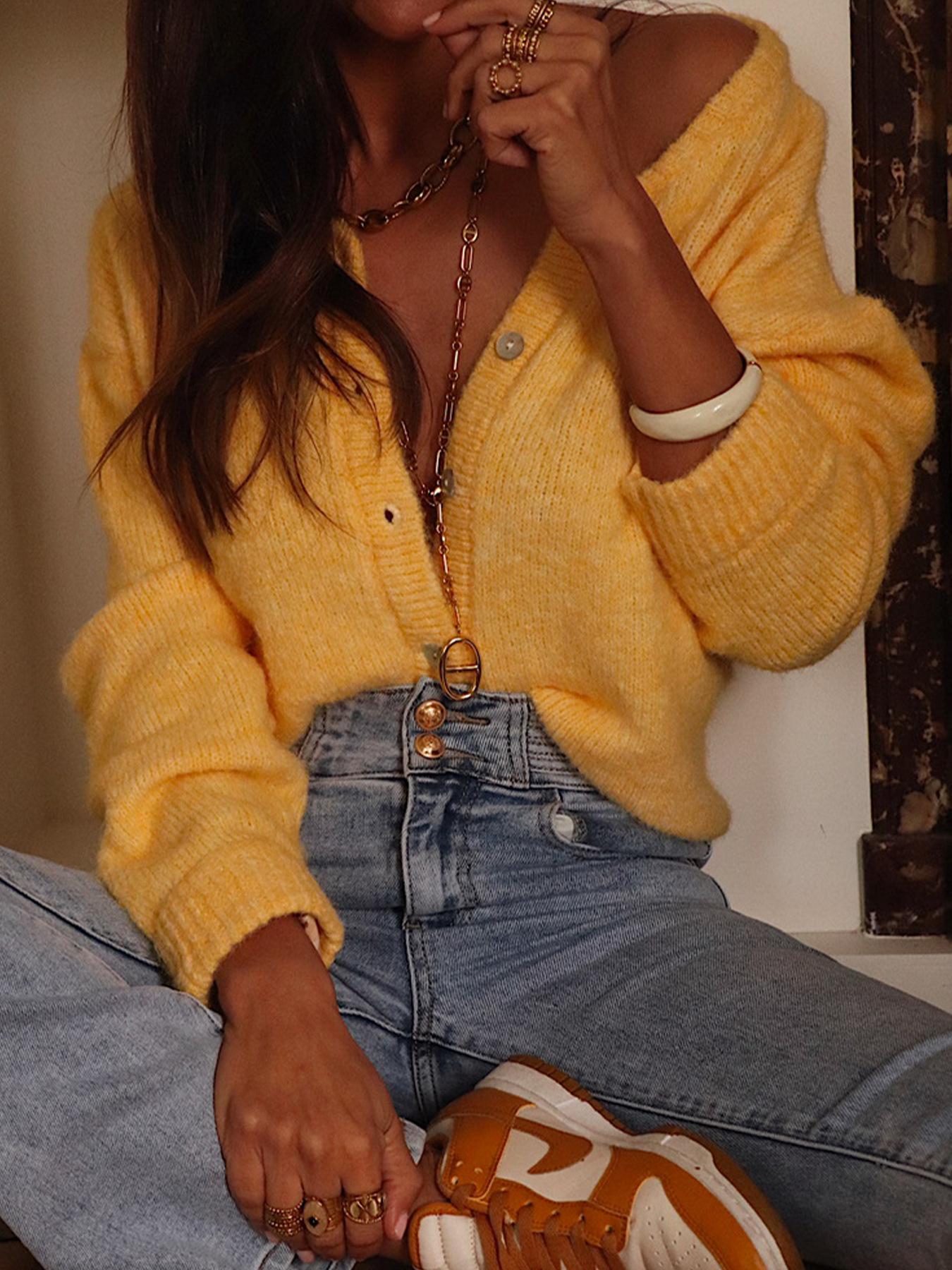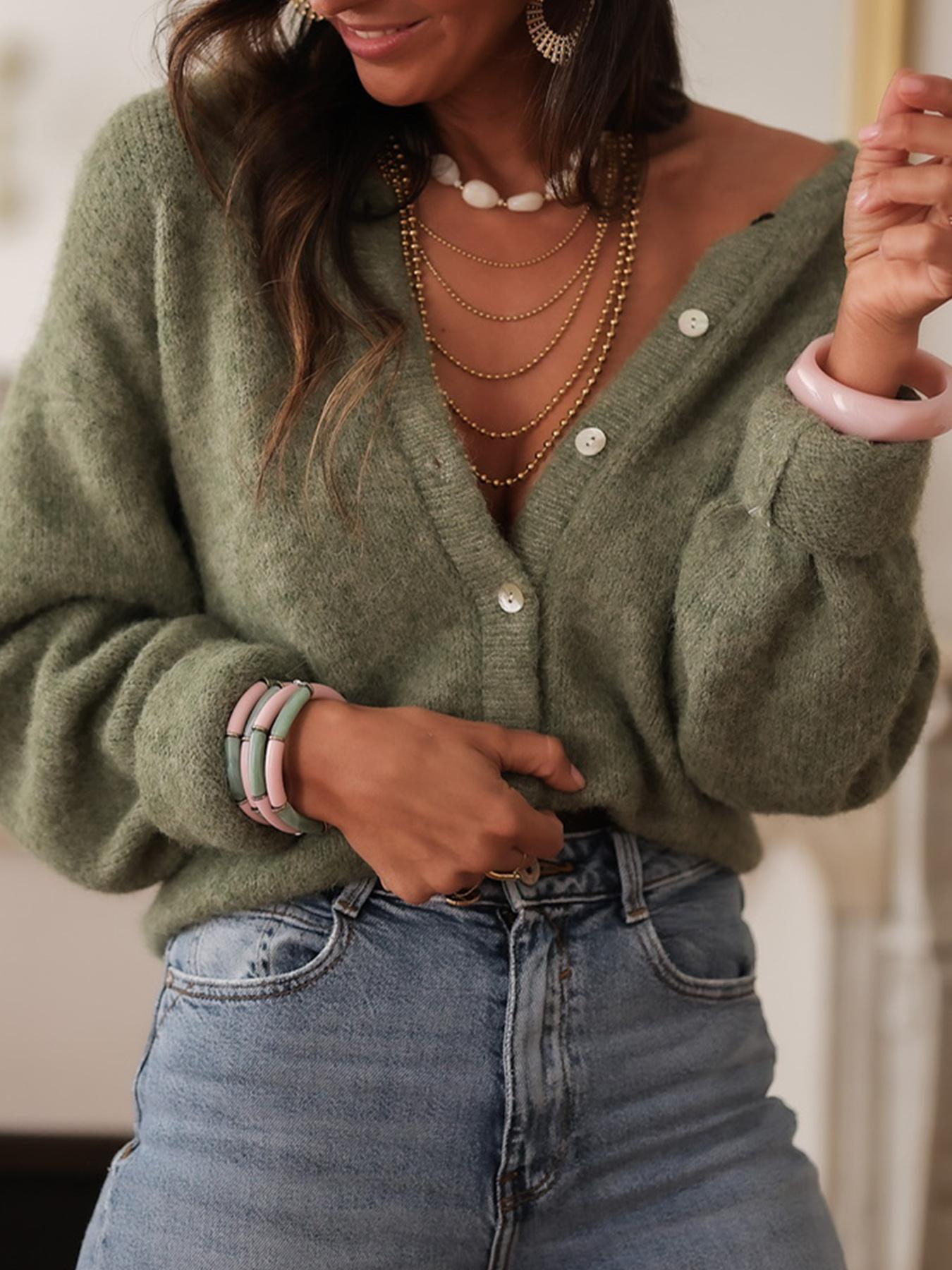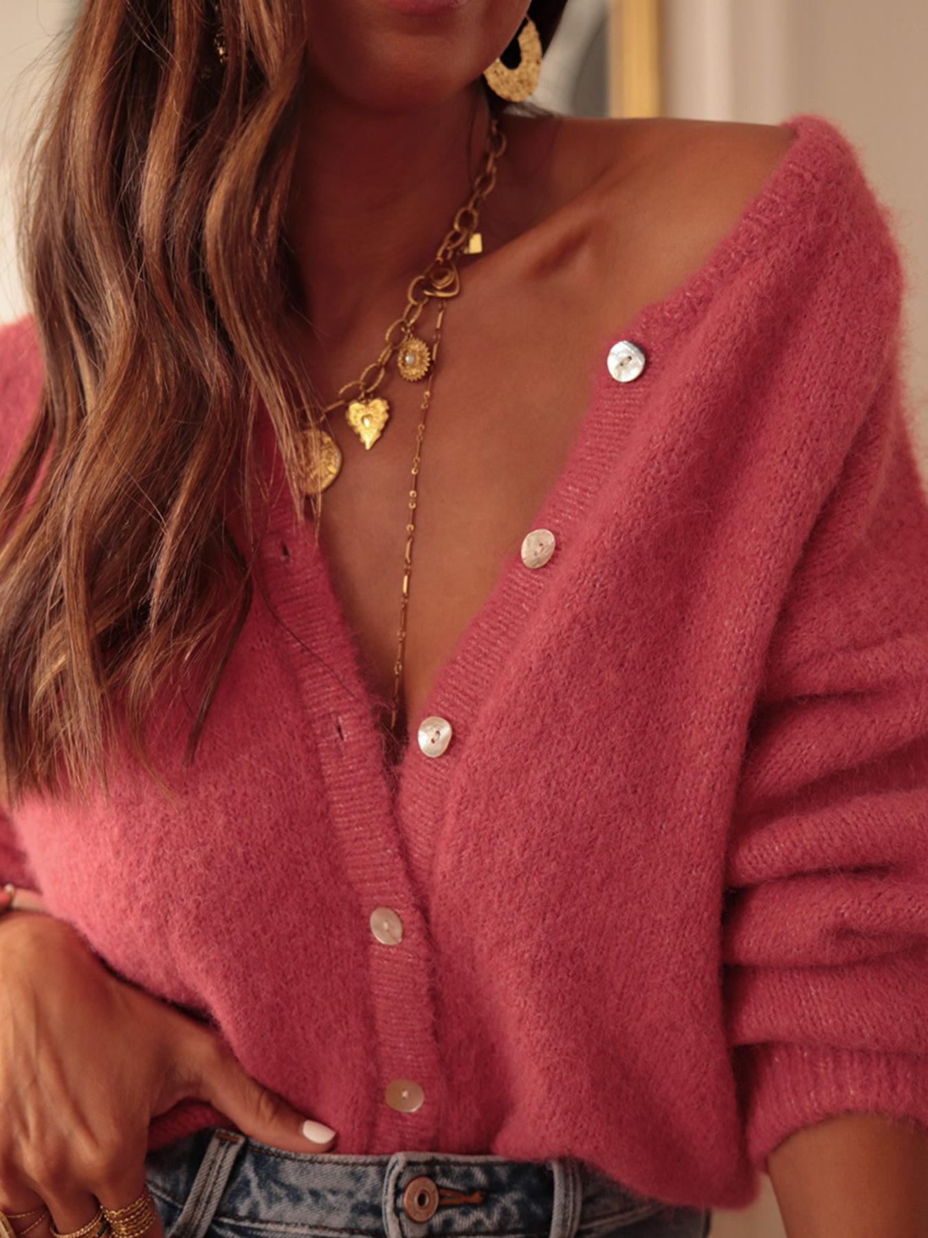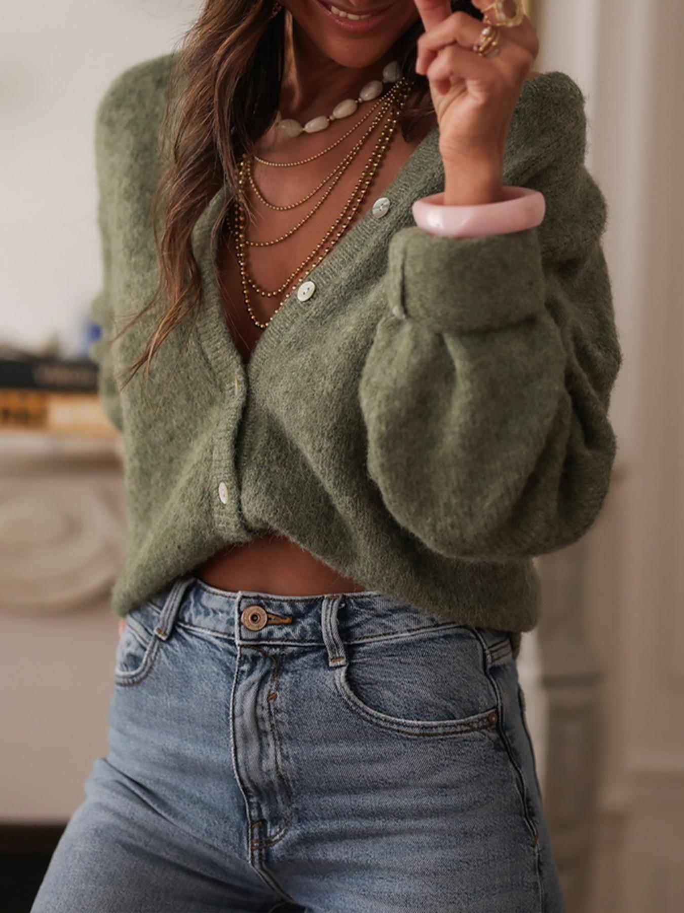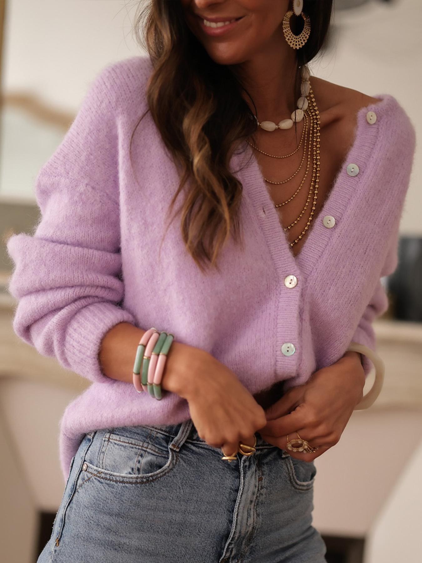 Cárdigan de punto de felpa de color puro transfronterizo europeo y americano con cuello en V profundo, top suelto y sexy, moda perezosa, suéter de otoño e invierno