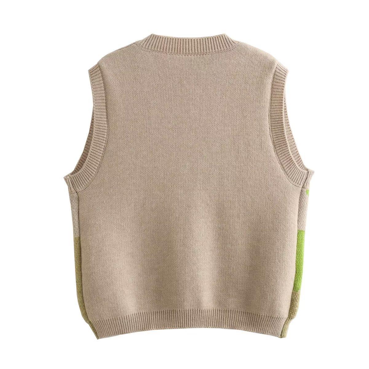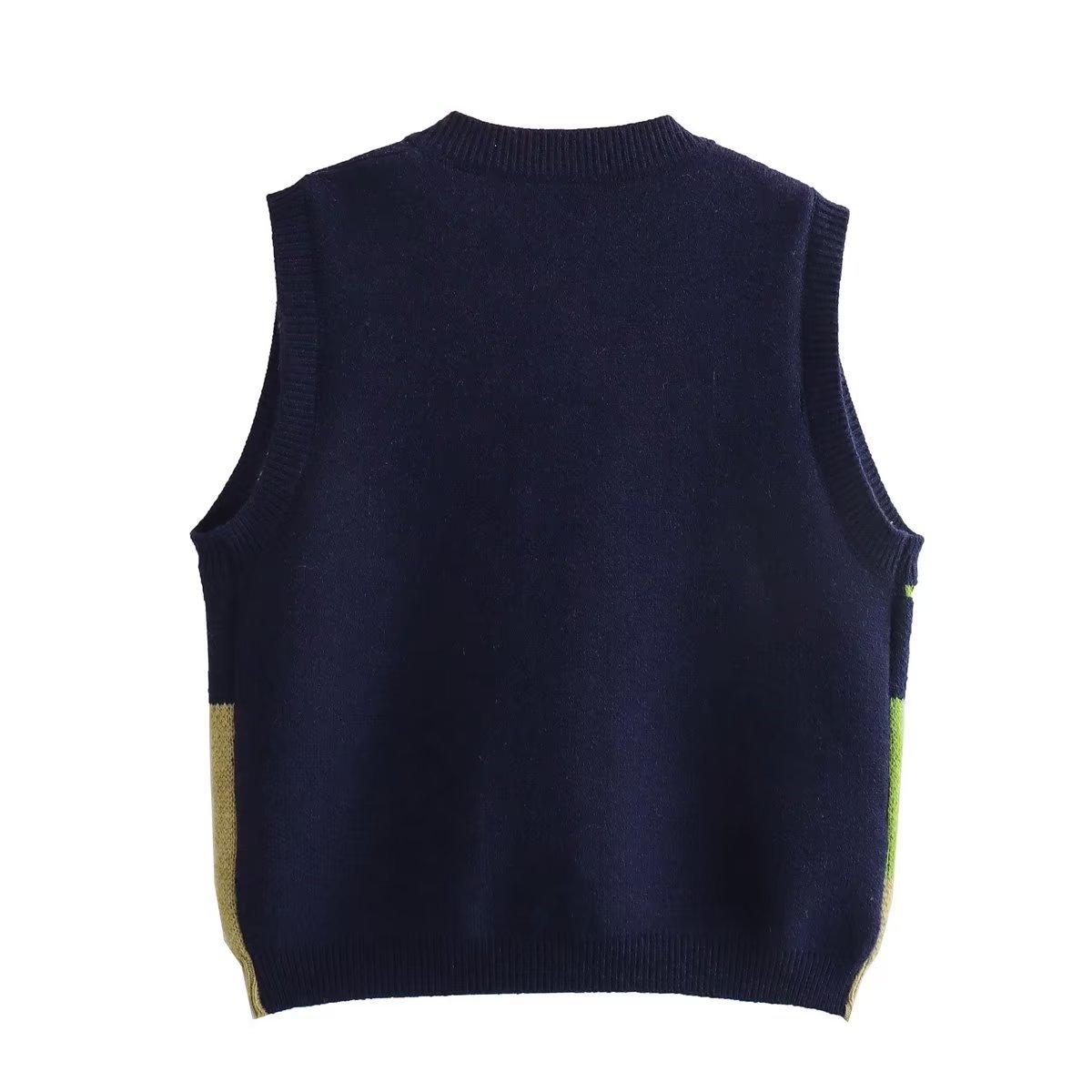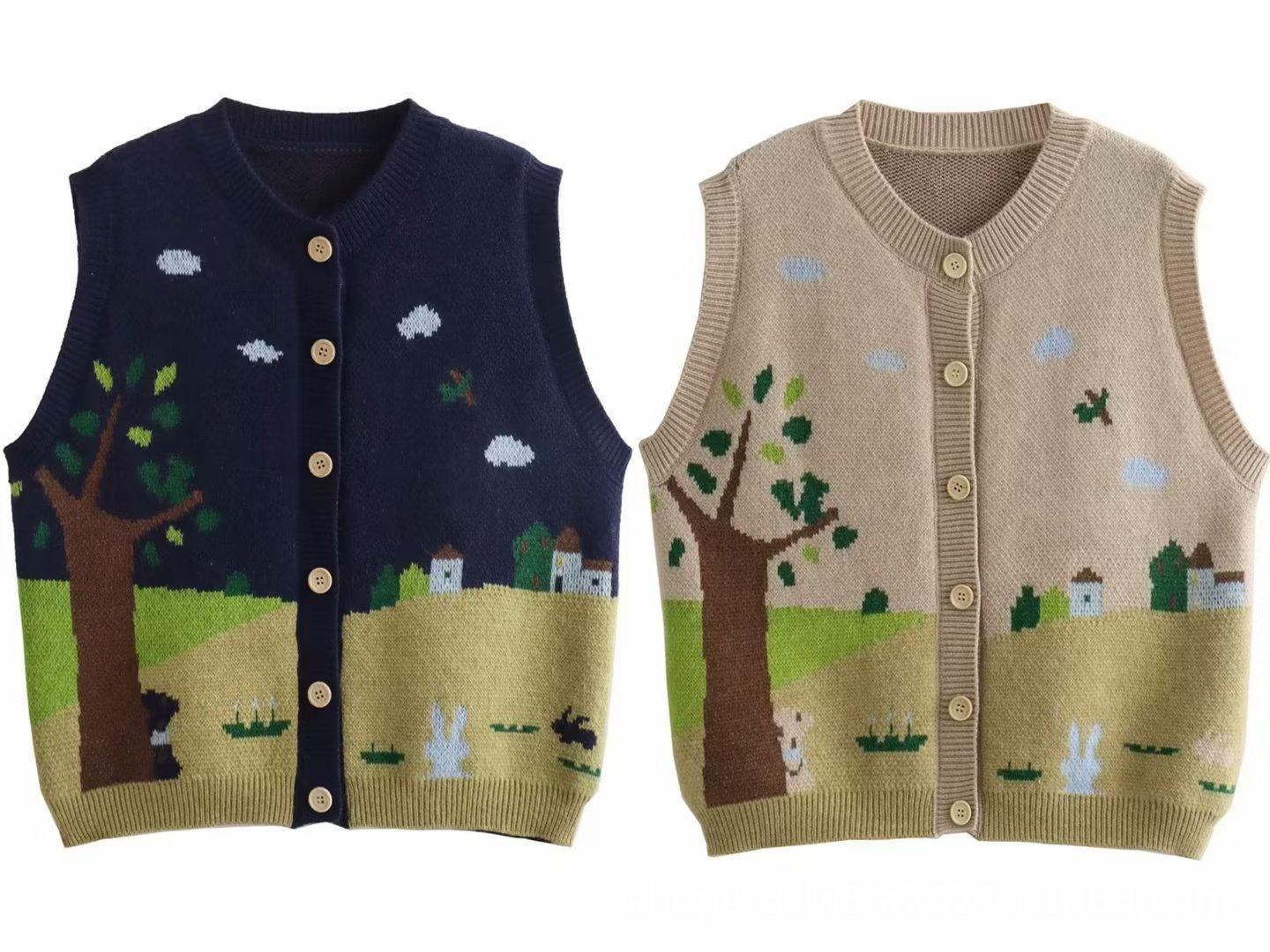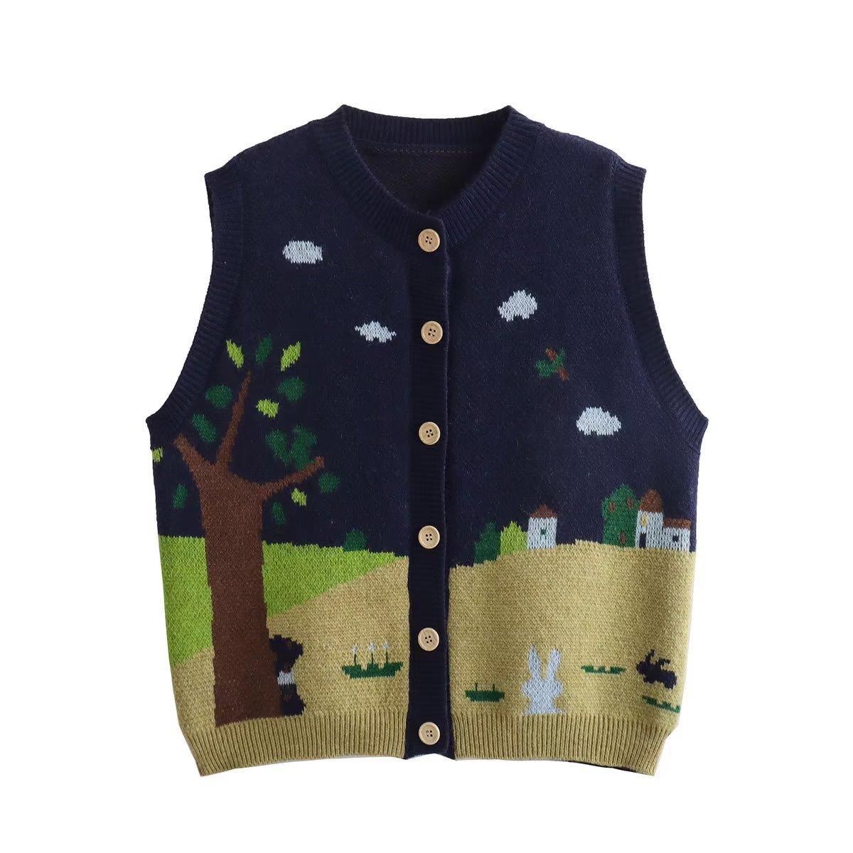 Estilo europeo y americano 2023 otoño nuevo cárdigan sin mangas con jacquard de dibujos animados en color contrastante, chaleco suéter de punto de un solo botón