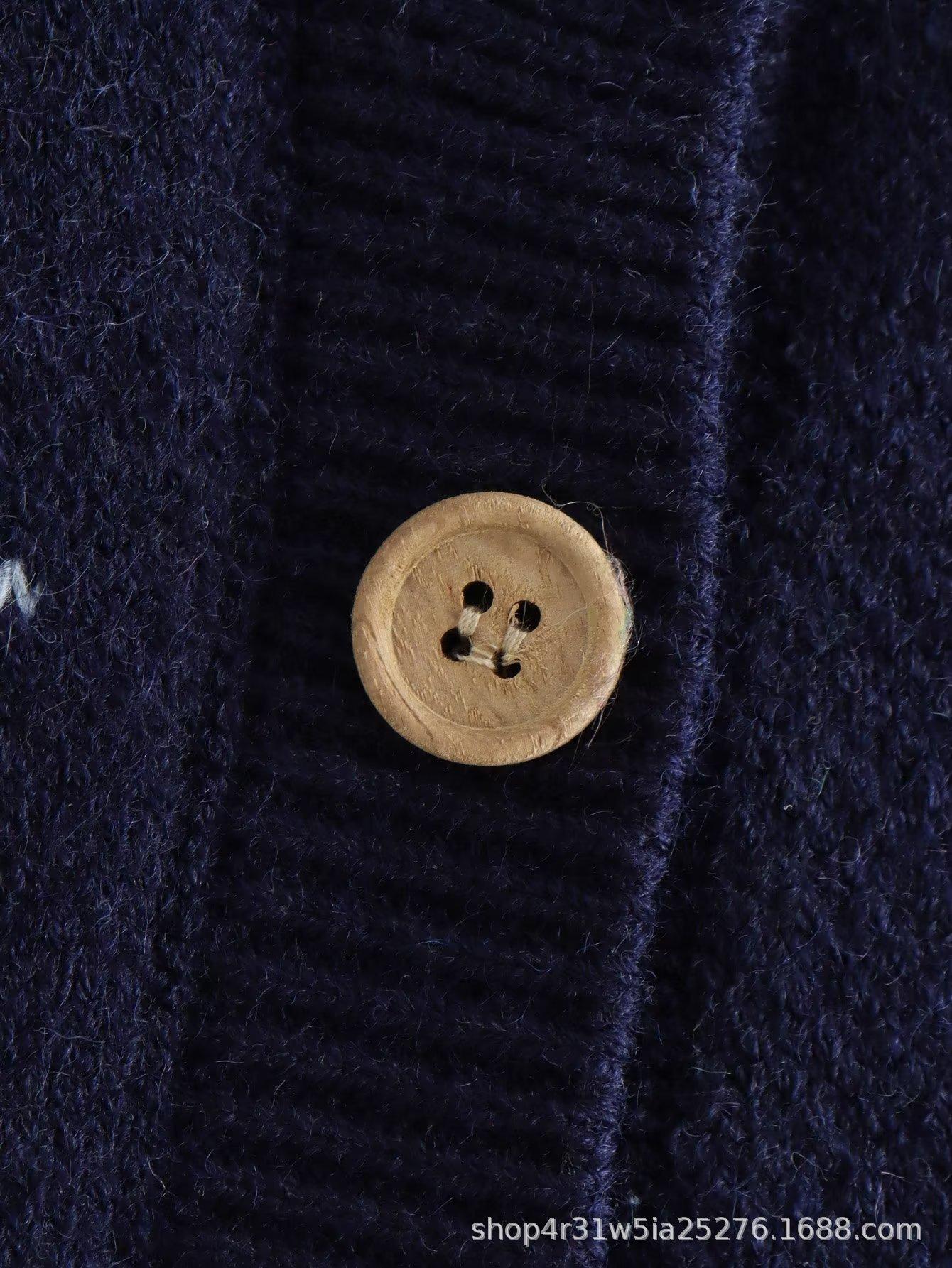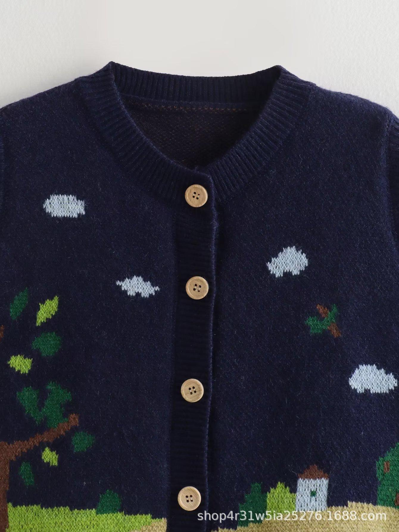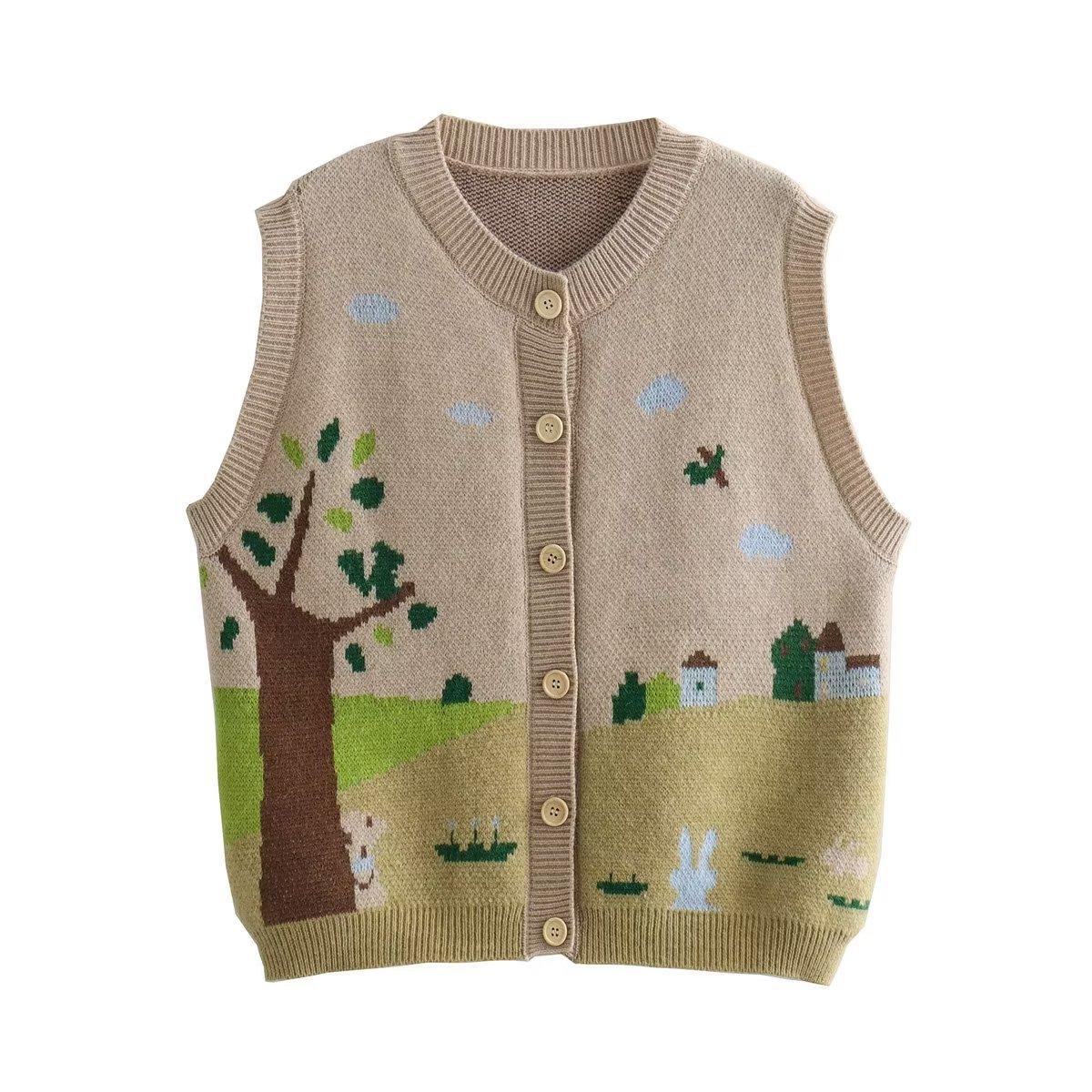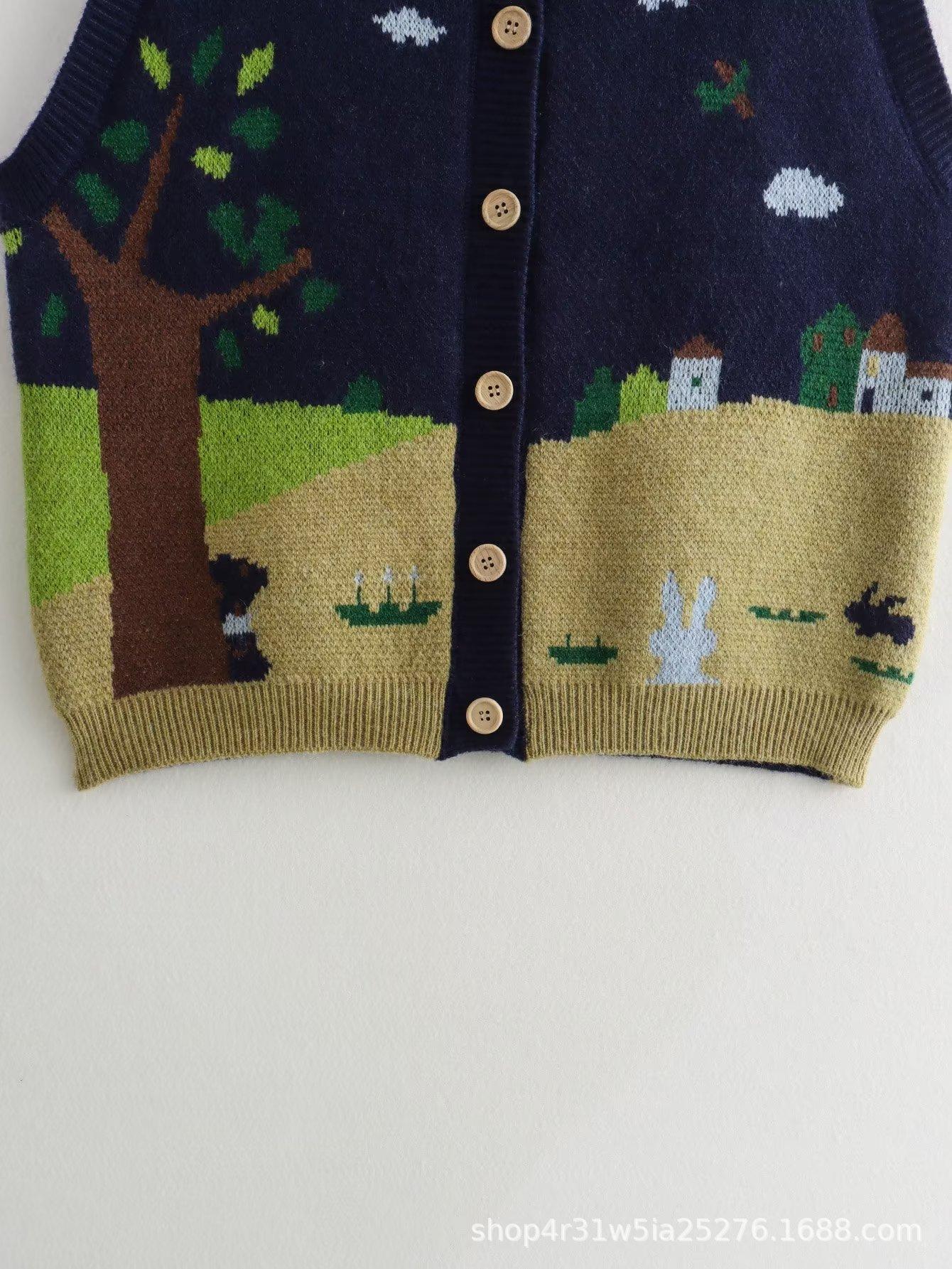 Estilo europeo y americano 2023 otoño nuevo cárdigan sin mangas con jacquard de dibujos animados en color contrastante, chaleco suéter de punto de un solo botón