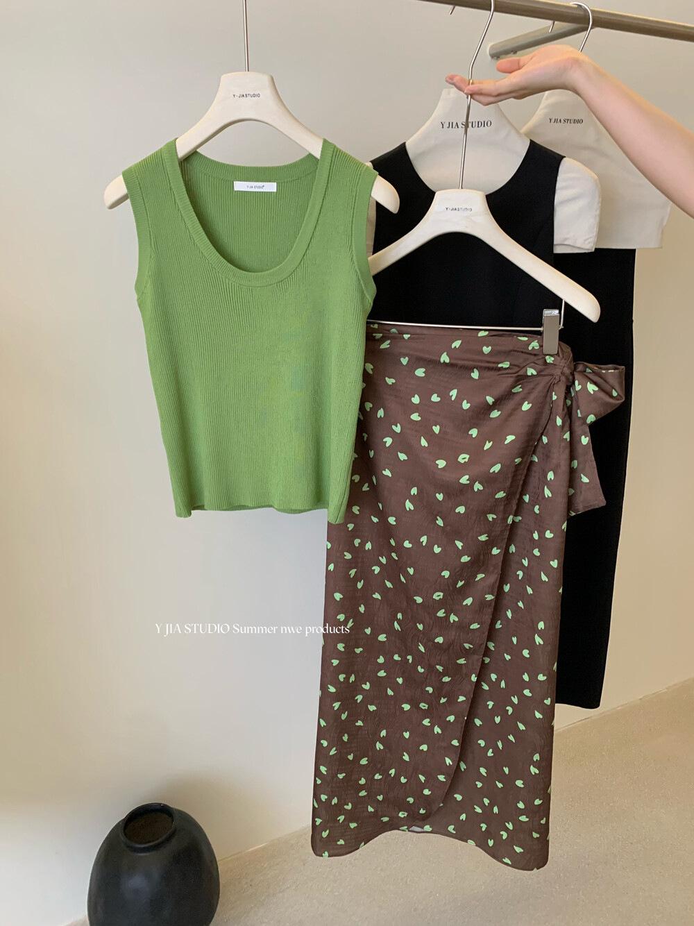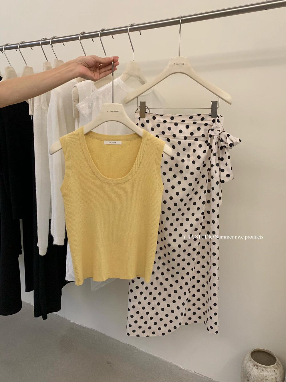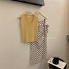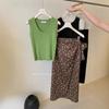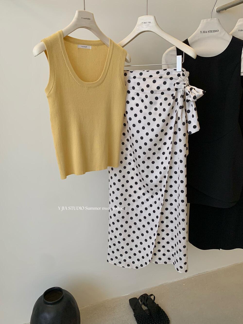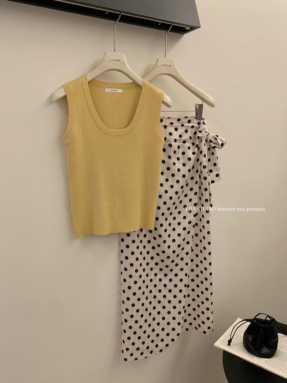 Liquidación, Sin Devoluciones ni Cambios. Falda de una pieza de cintura alta estilo coreano con lazo + Top de punto sin mangas de color sólido simple 3065