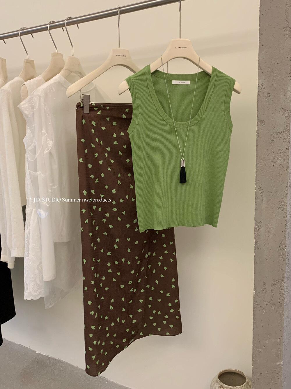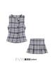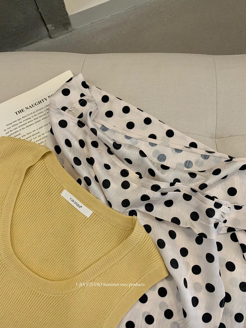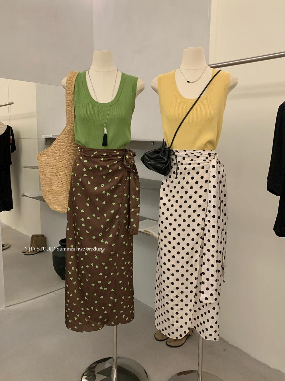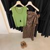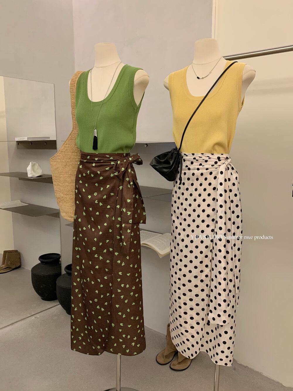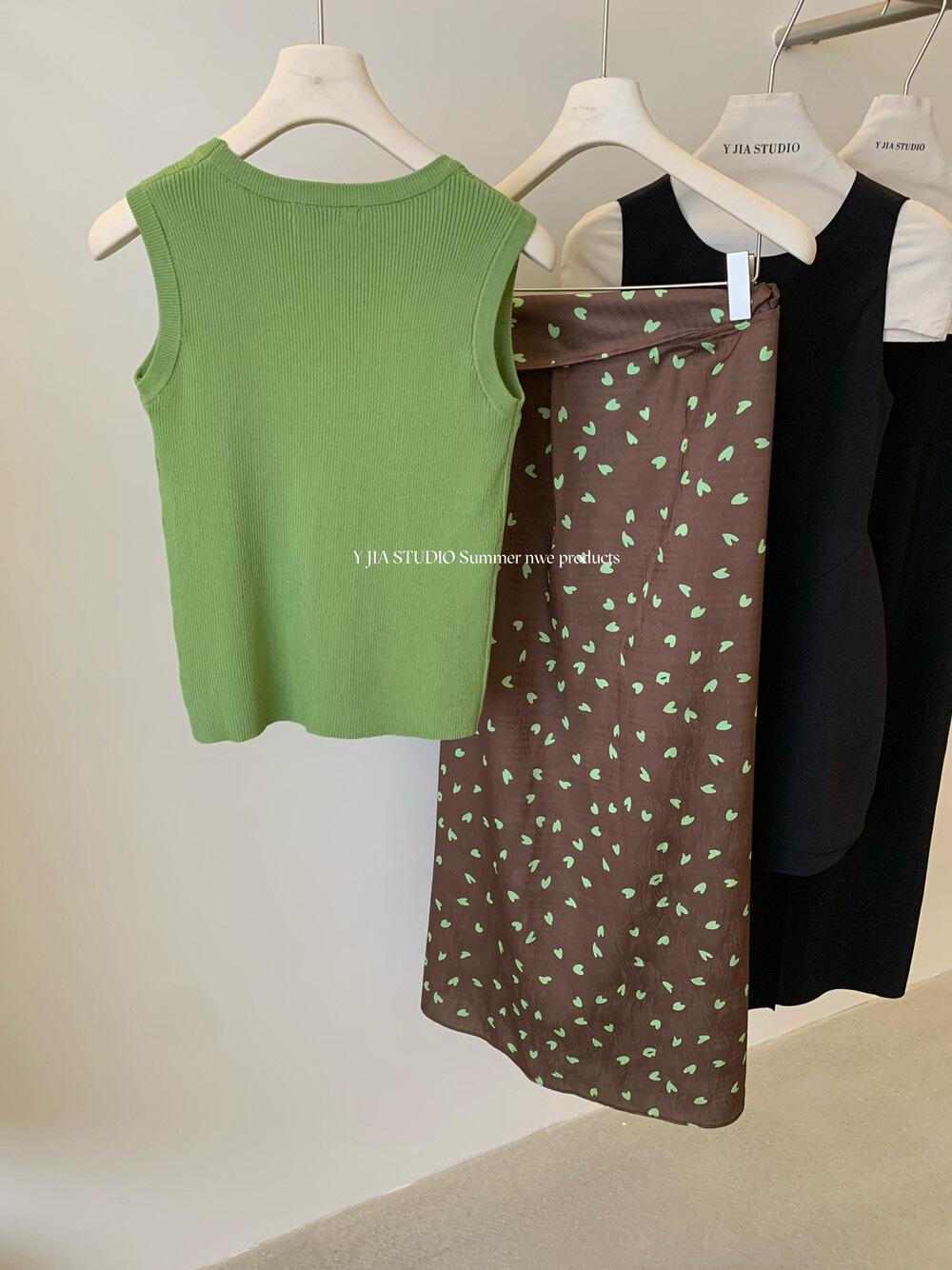 Liquidación, Sin Devoluciones ni Cambios. Falda de una pieza de cintura alta estilo coreano con lazo + Top de punto sin mangas de color sólido simple 3065