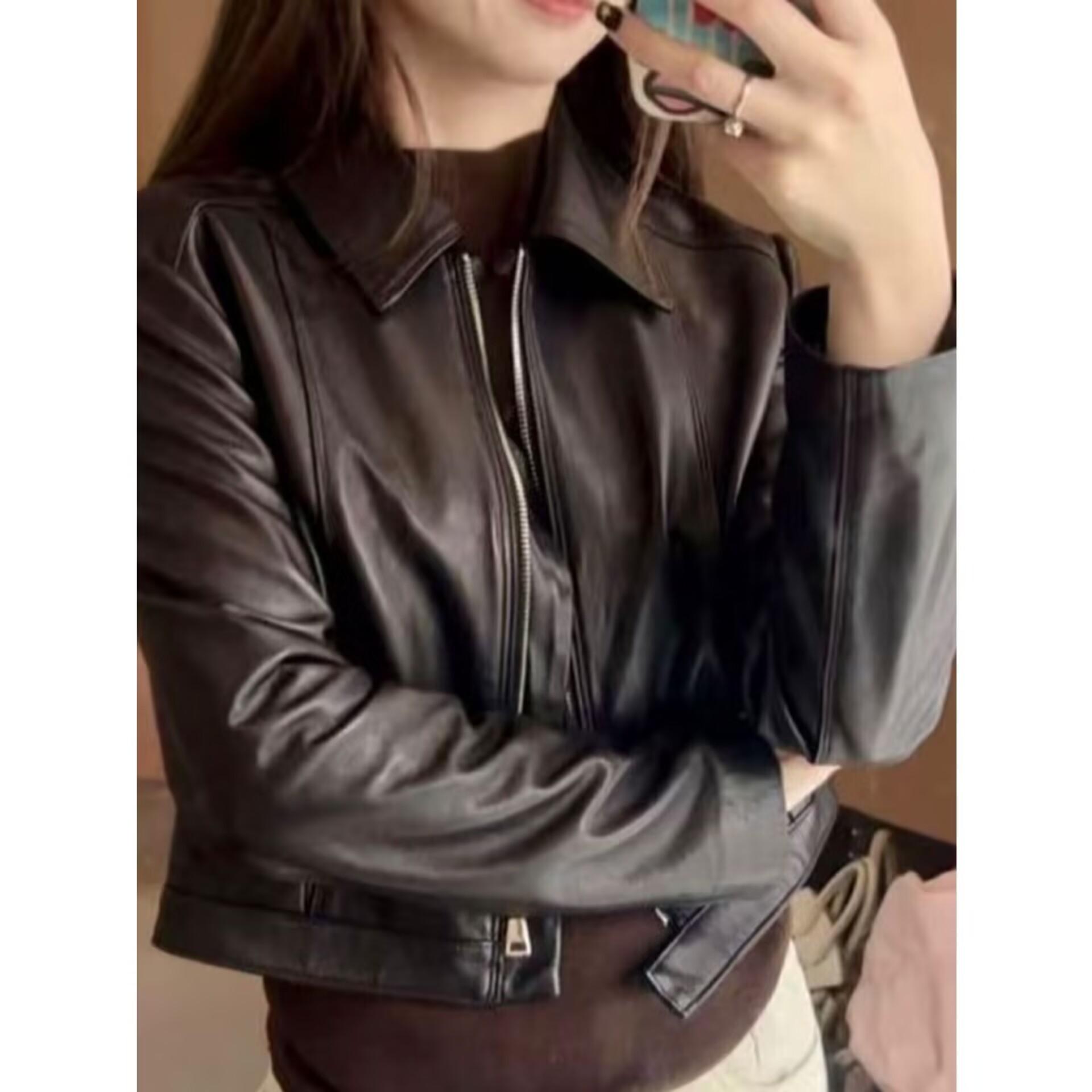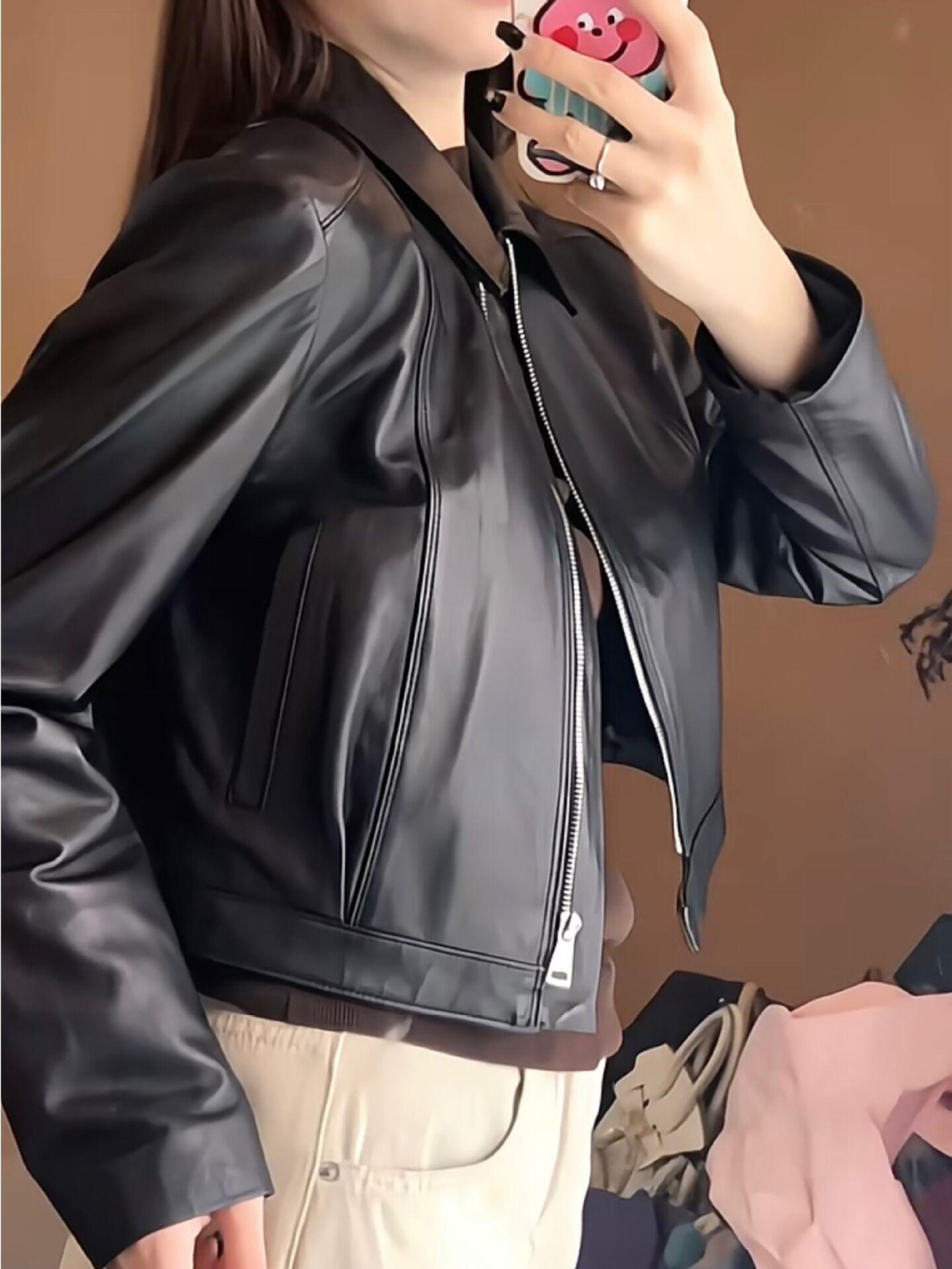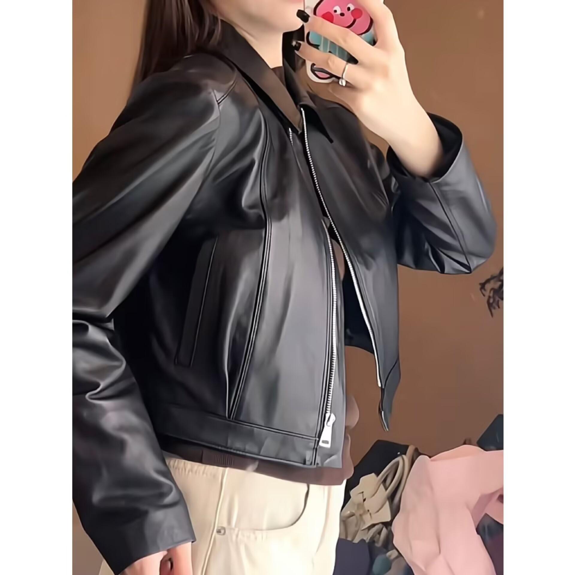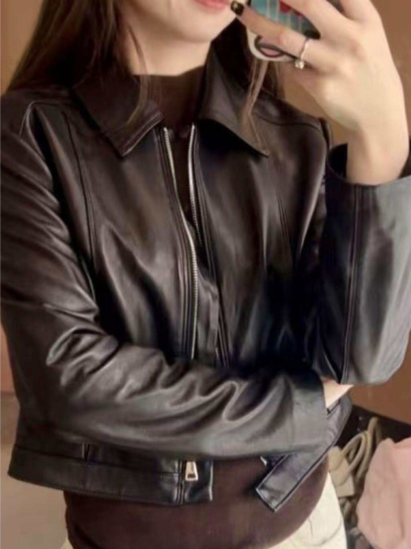 Chaqueta Negra de Primavera y Otoño de Alta Gama Corta Adelgazante Cremallera Americano Retro Estilo Hong Kong Petite Estilo Caliente Chaqueta de Cuero Abrigo Mujer