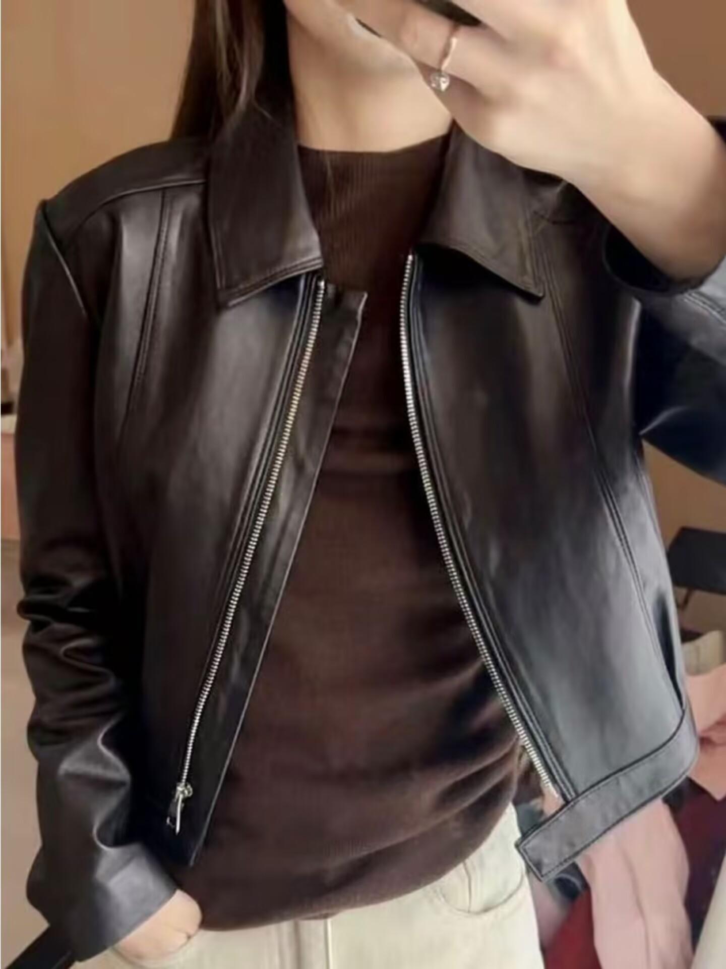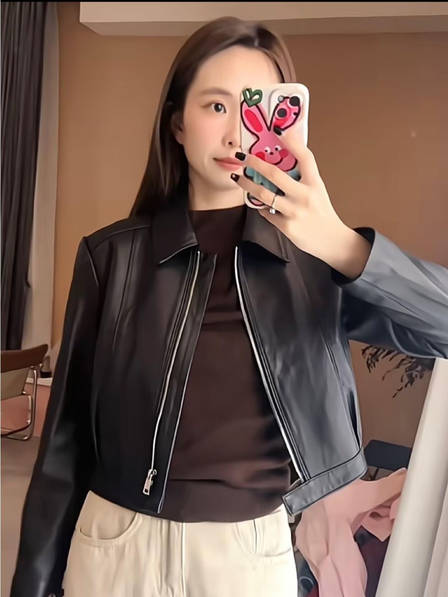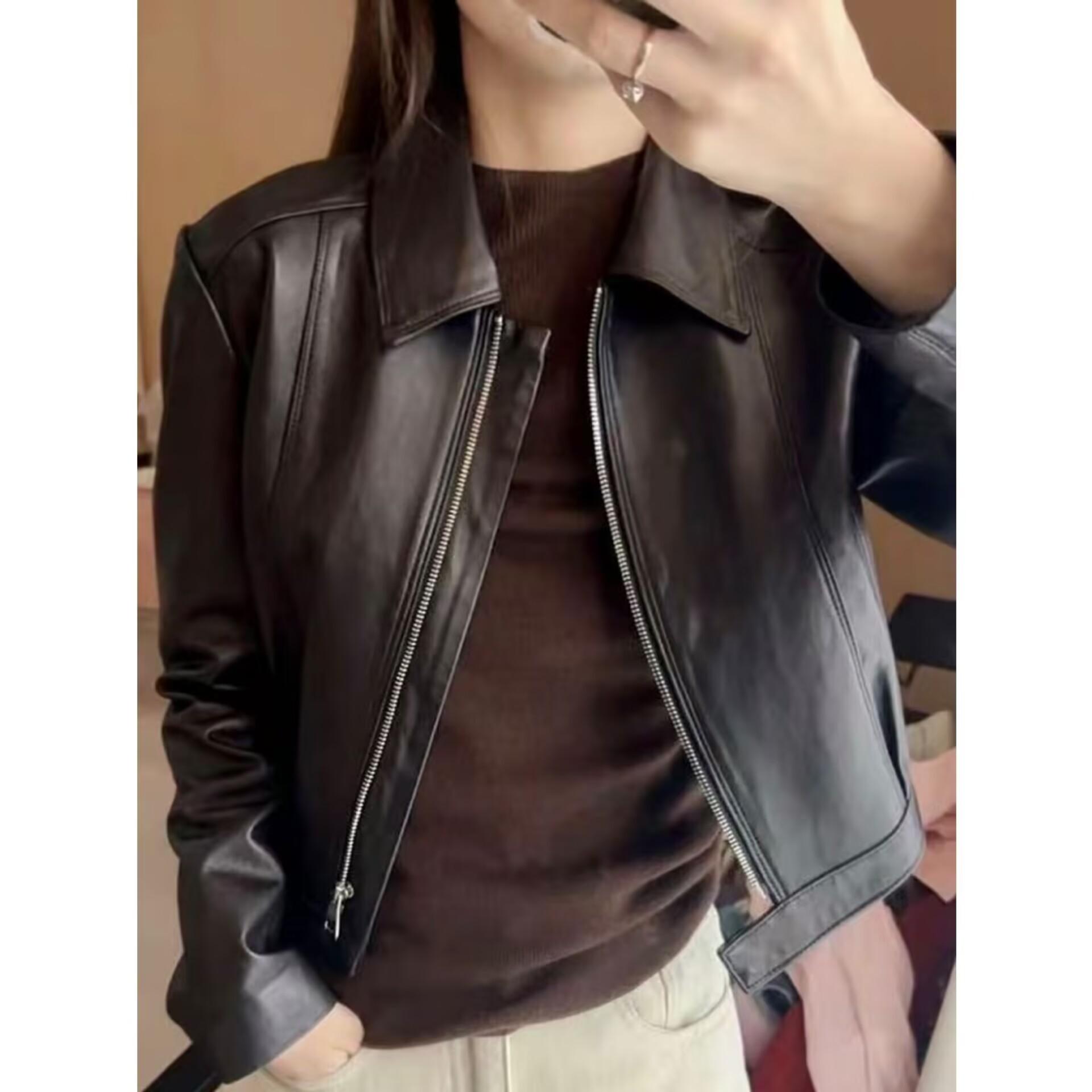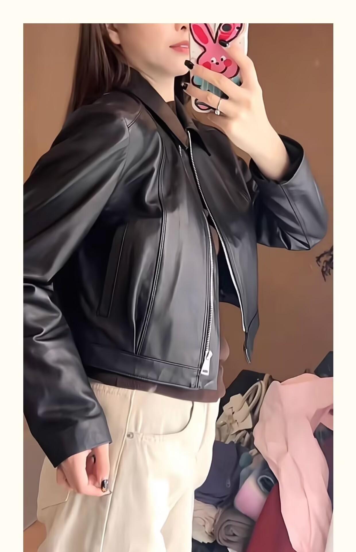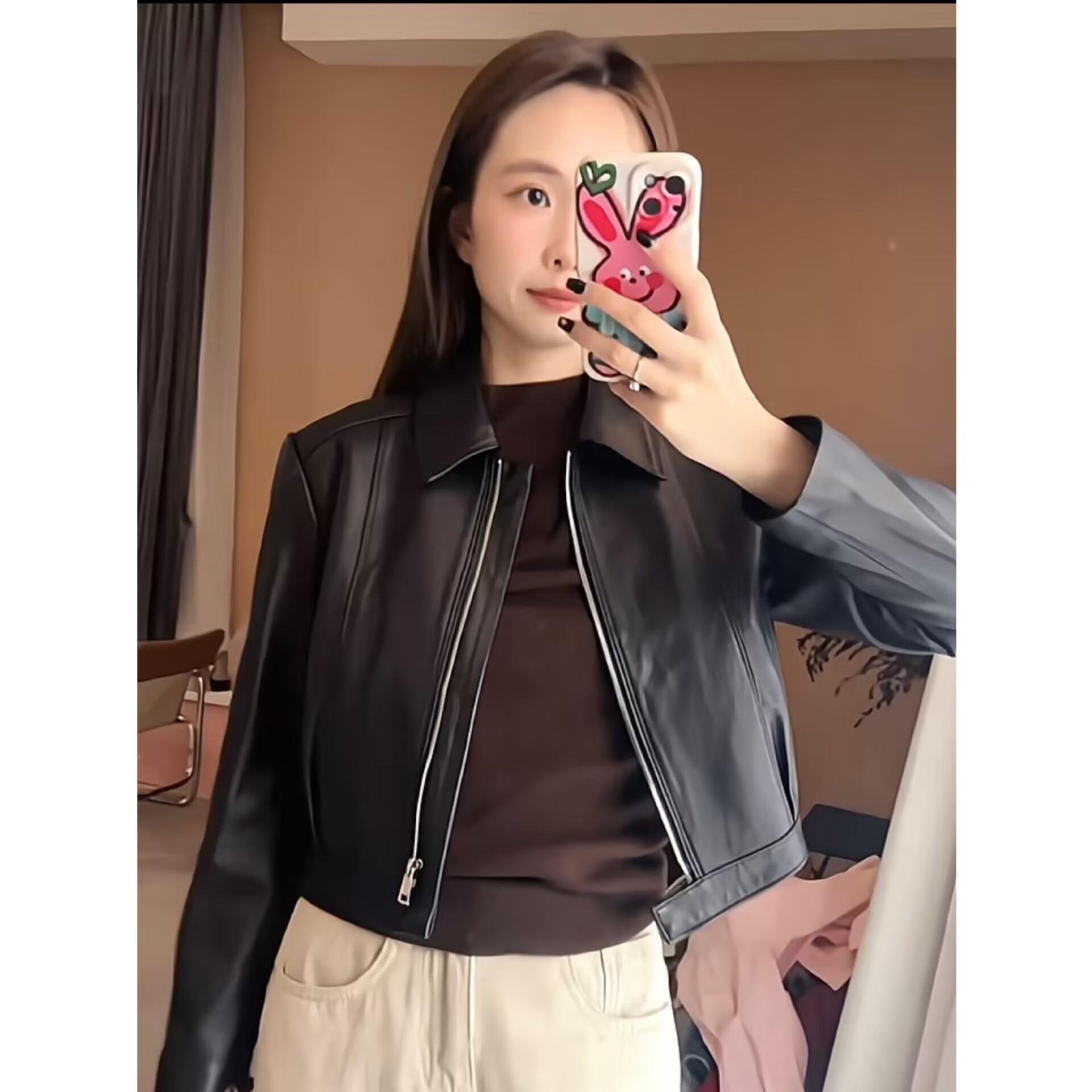 Chaqueta Negra de Primavera y Otoño de Alta Gama Corta Adelgazante Cremallera Americano Retro Estilo Hong Kong Petite Estilo Caliente Chaqueta de Cuero Abrigo Mujer