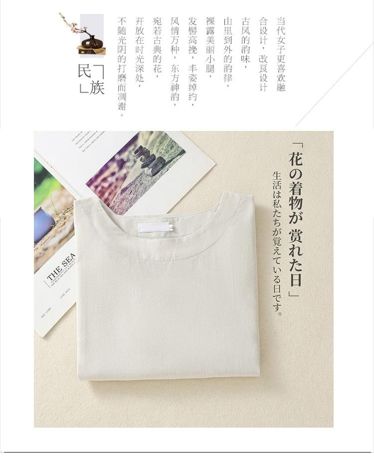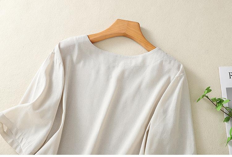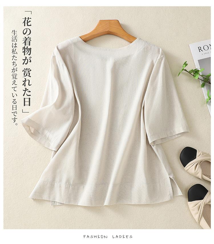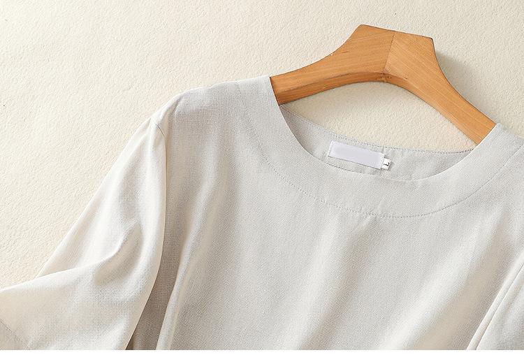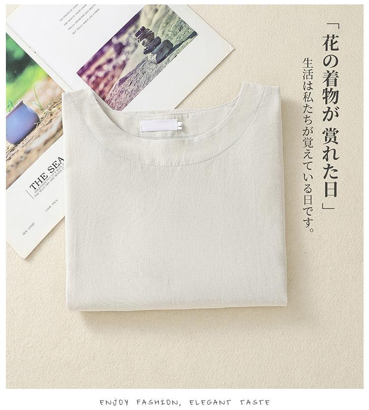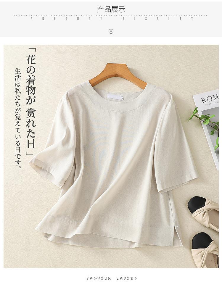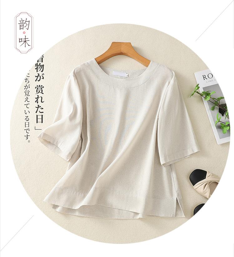 Top de Lino Simple Artístico de Cuello Redondo en Stock para Mujer con Manga Media, Suelto y Elegante, Camiseta Retro de Moda