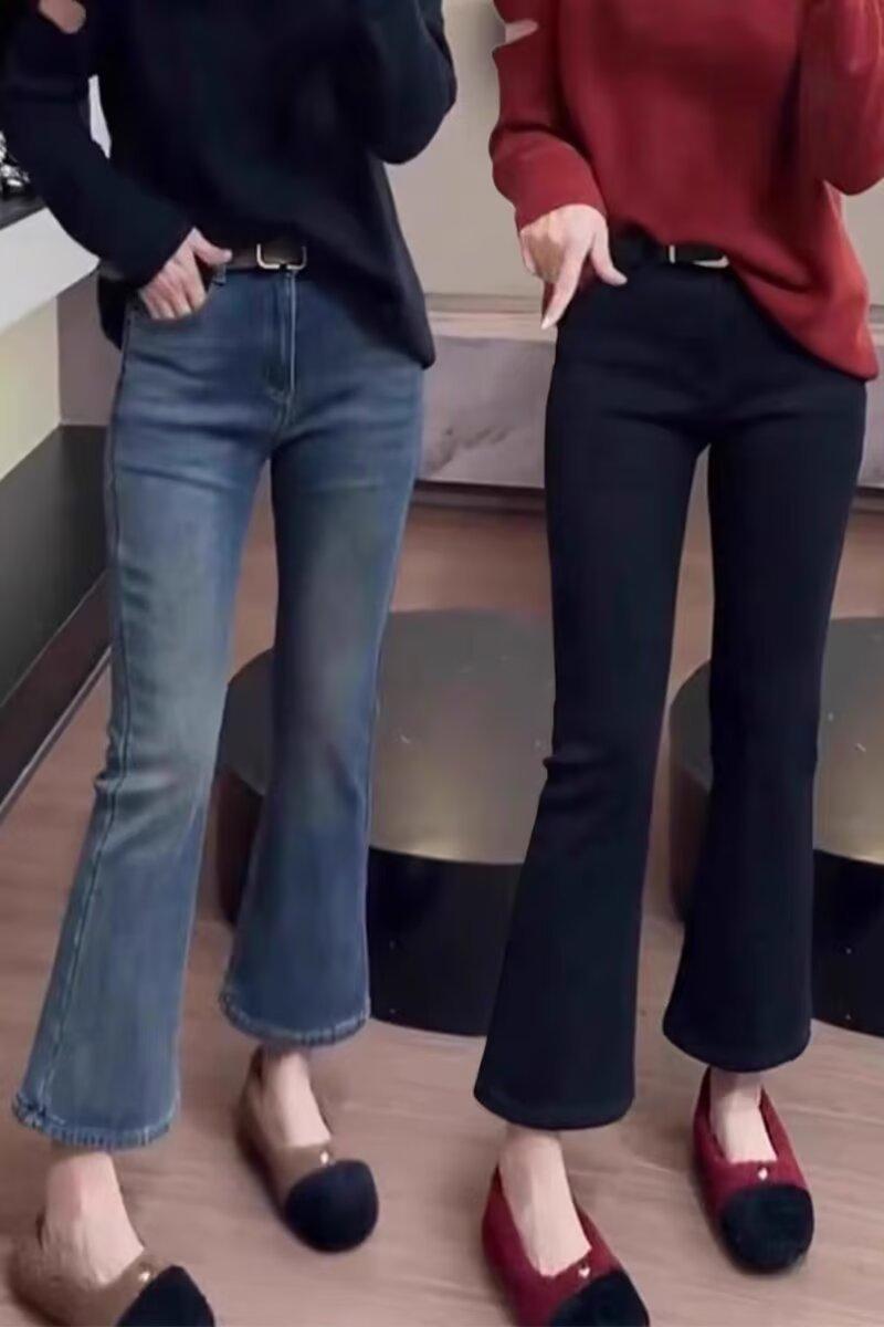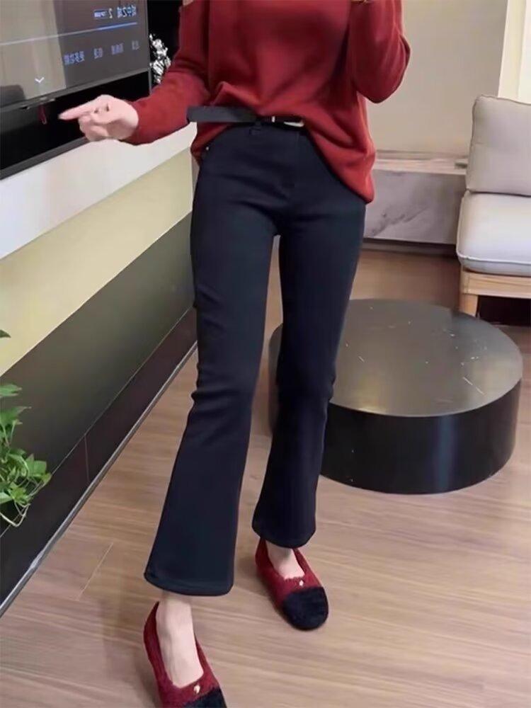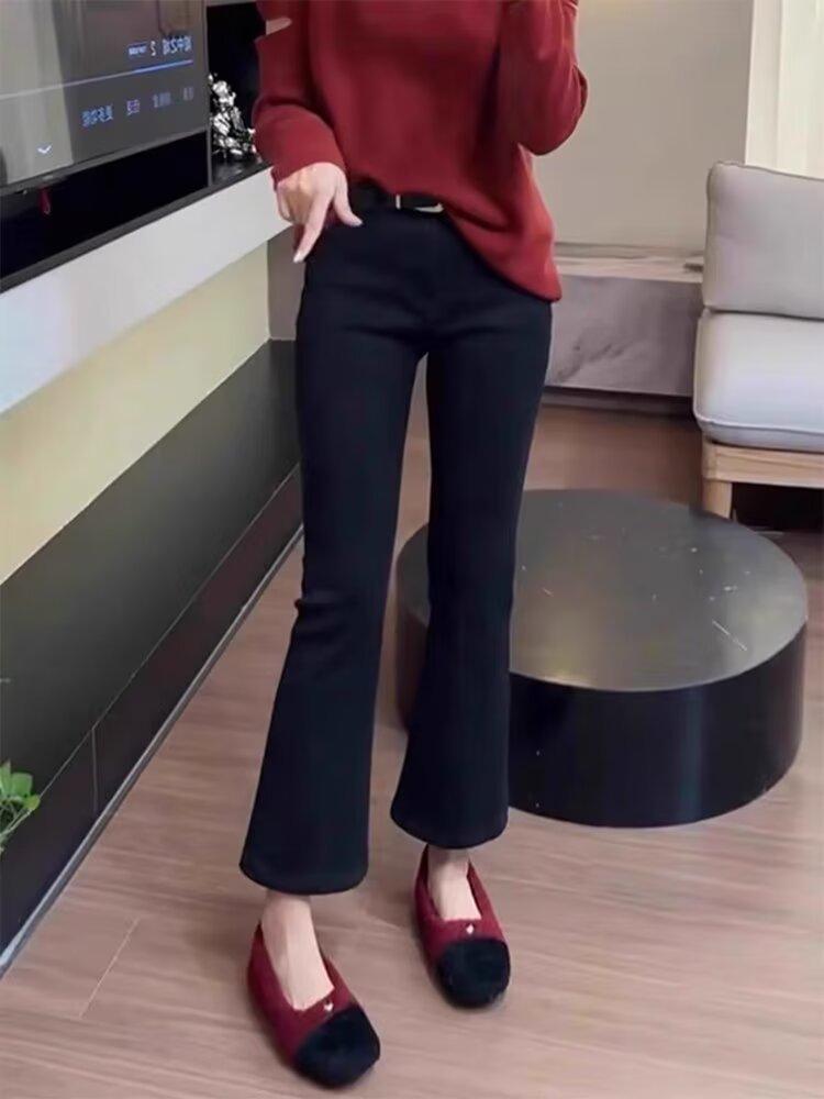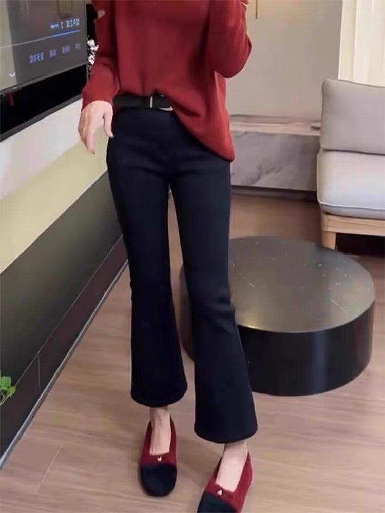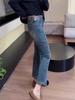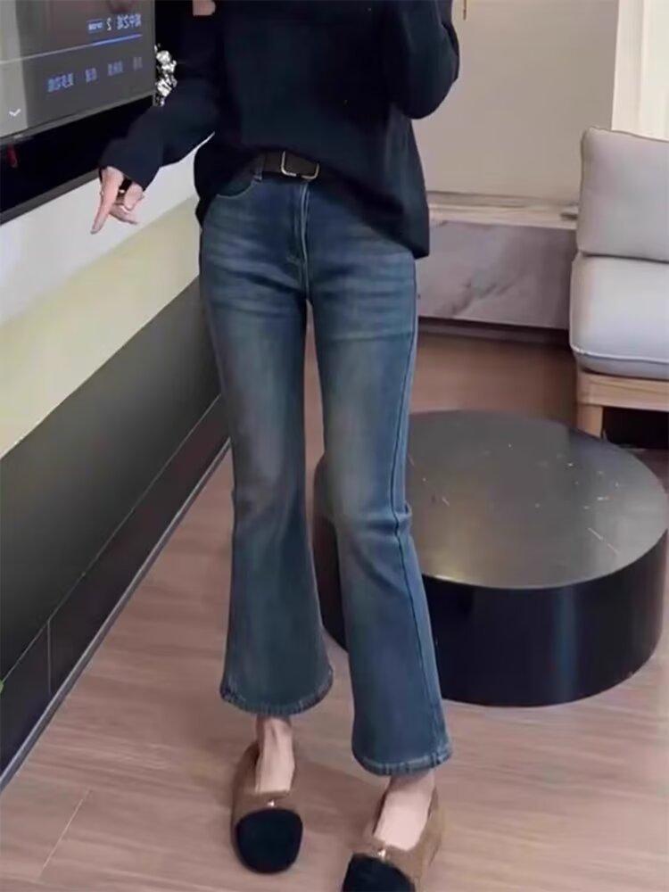 Jeans retro elásticos de talla grande para mujer primavera y otoño 2025 gordita mm versátiles cintura alta corte slim acampanados de herradura