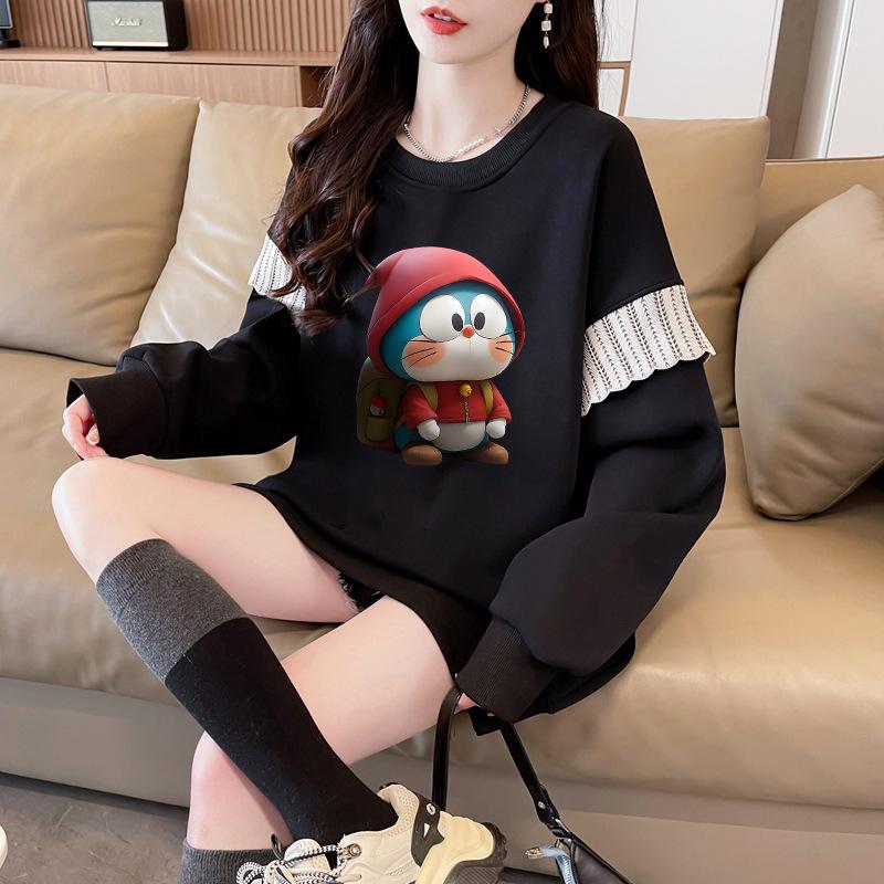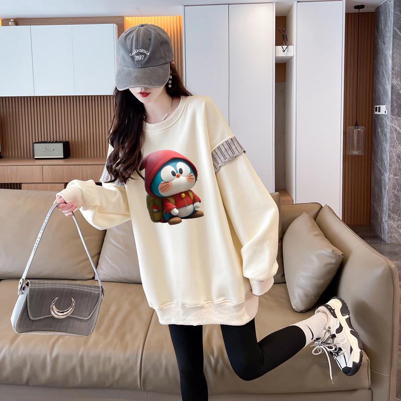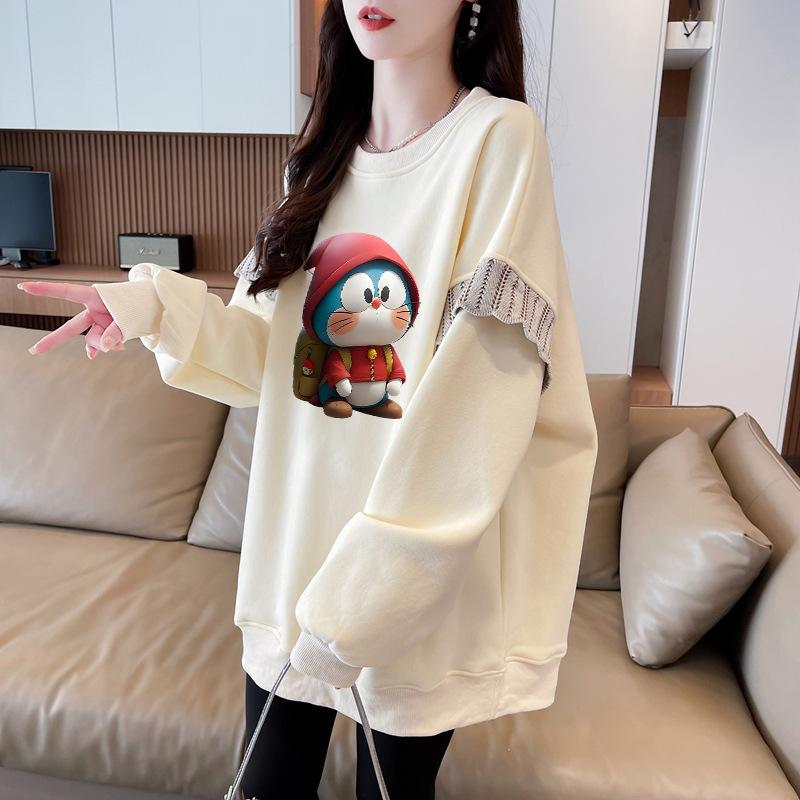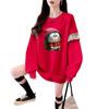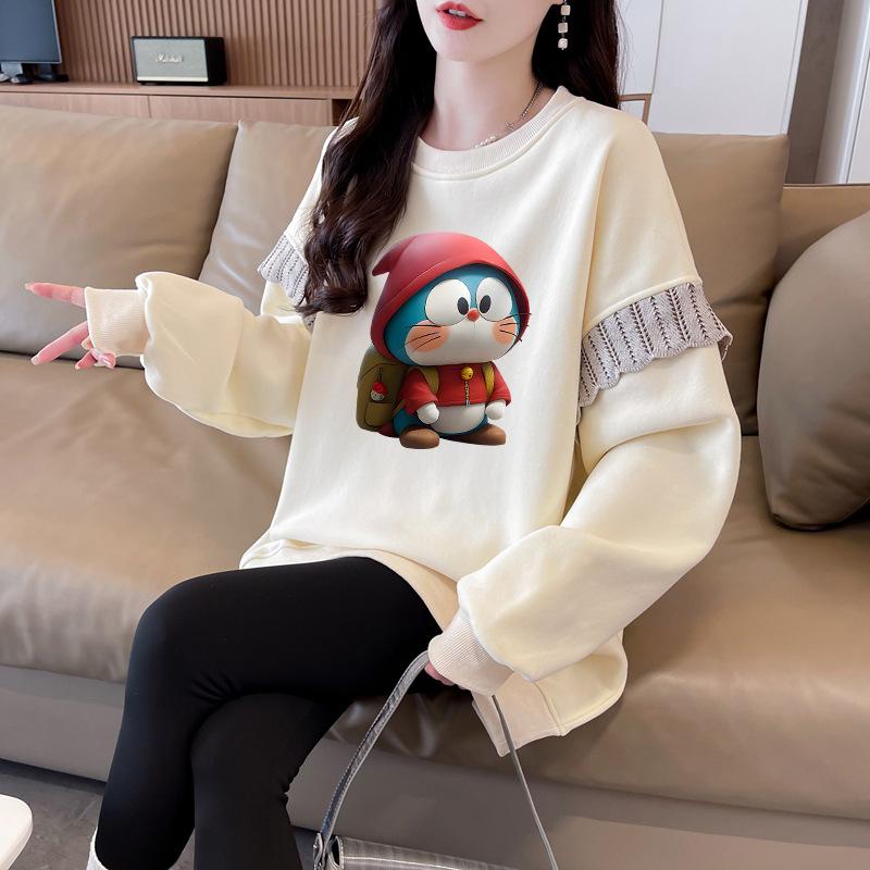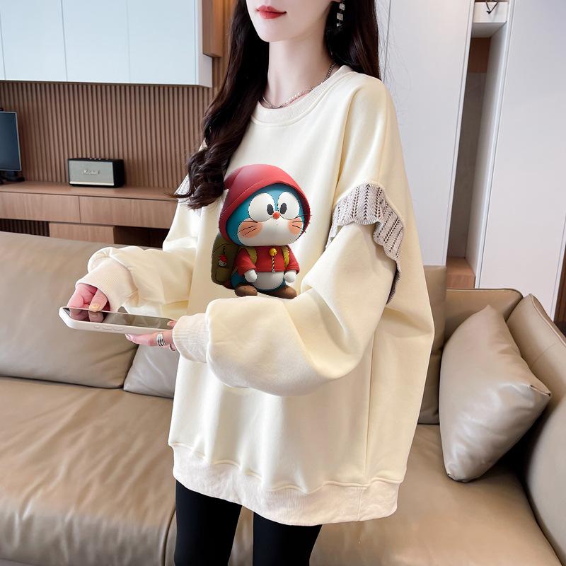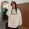 Sudadera Simple Ins de Personalidad con Estampado de Dibujos Animados, Diseño de Costuras Otoño-Invierno, Oversize con Forro Polar Grueso de Cuello Redondo para Mujer
