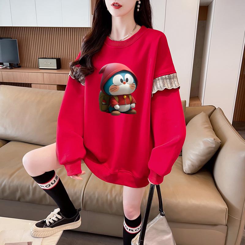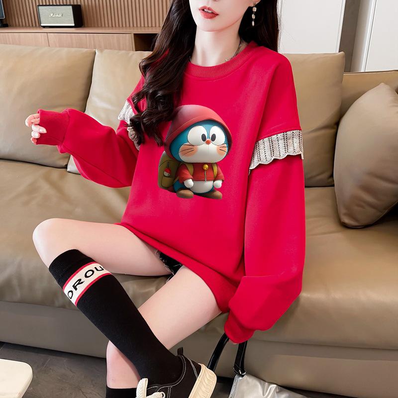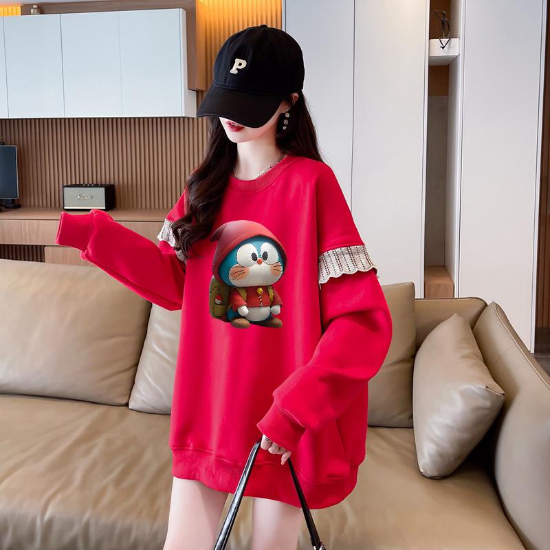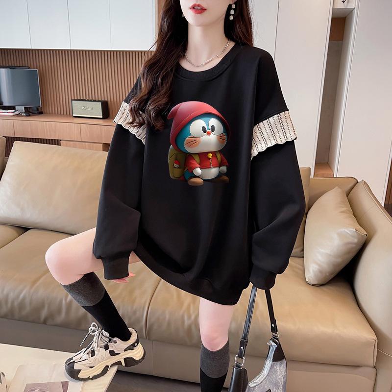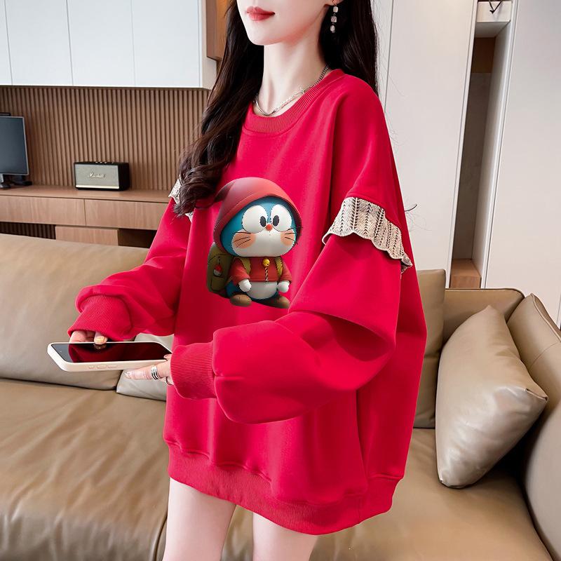 Sudadera Simple Ins de Personalidad con Estampado de Dibujos Animados, Diseño de Costuras Otoño-Invierno, Oversize con Forro Polar Grueso de Cuello Redondo para Mujer