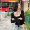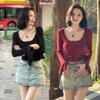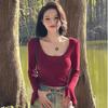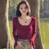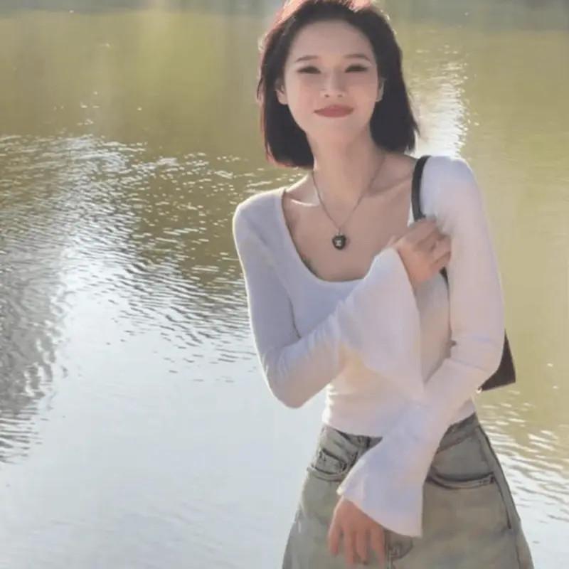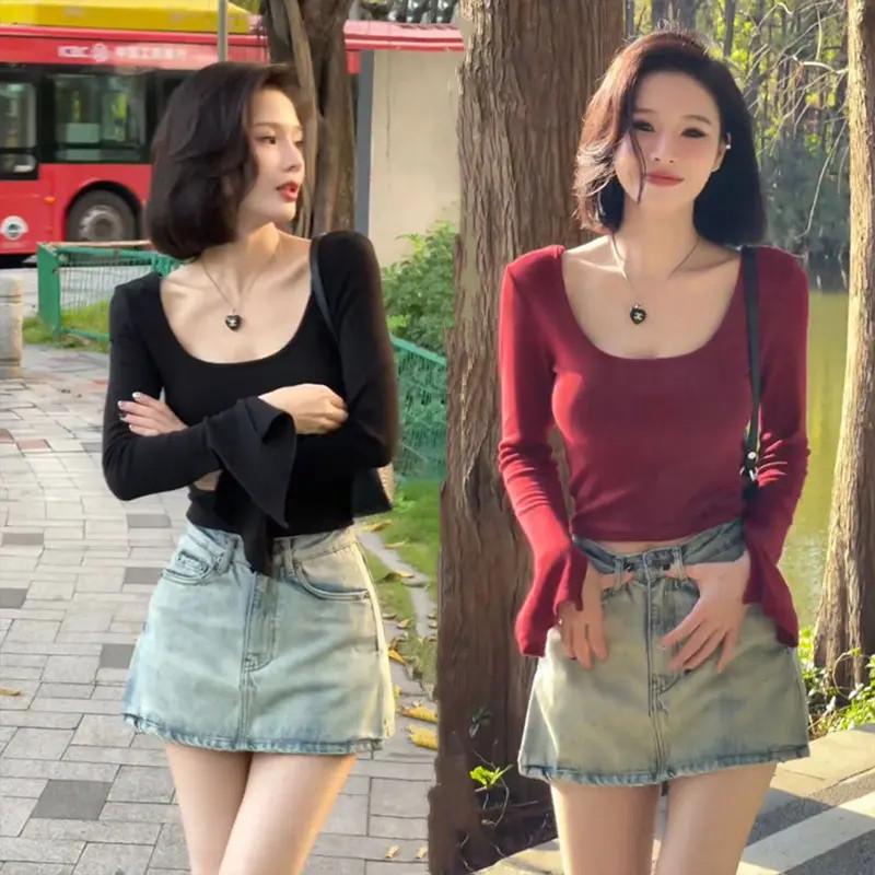 2025 Otoño Nuevo Sexy Cuello Cuadrado Manga Campana Camiseta Mujer Deseo Puro Versátil Camisa Base Top Adelgazante