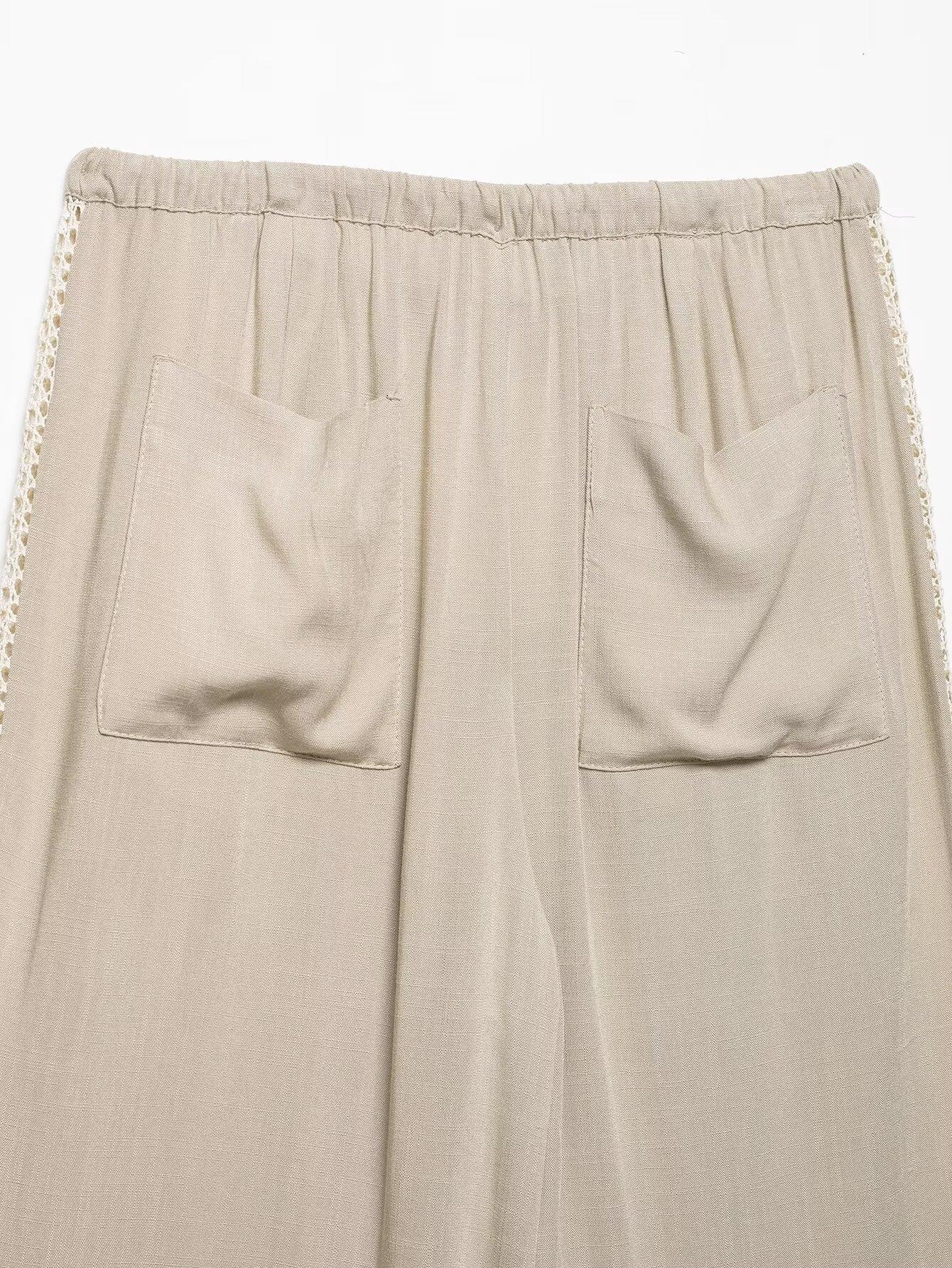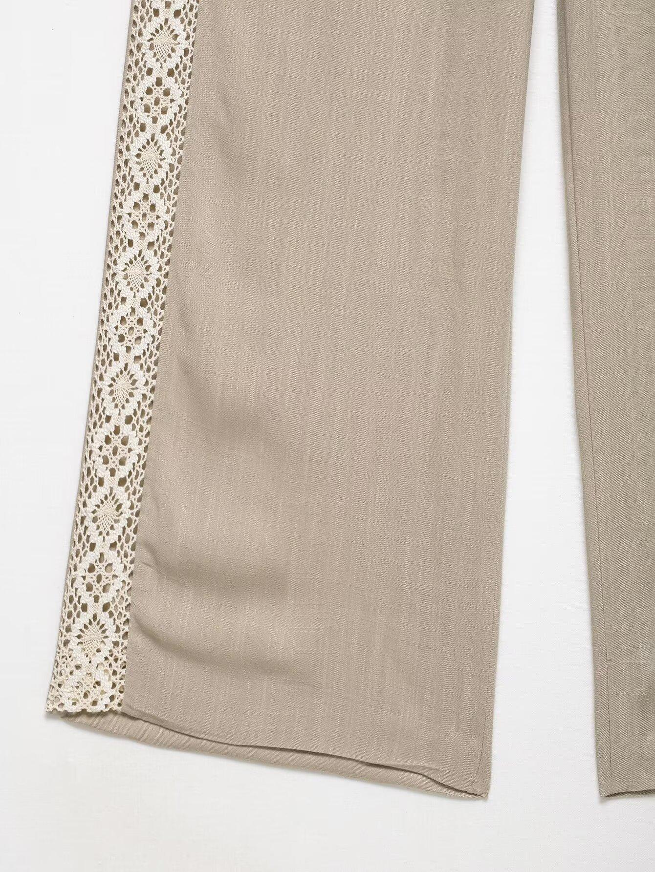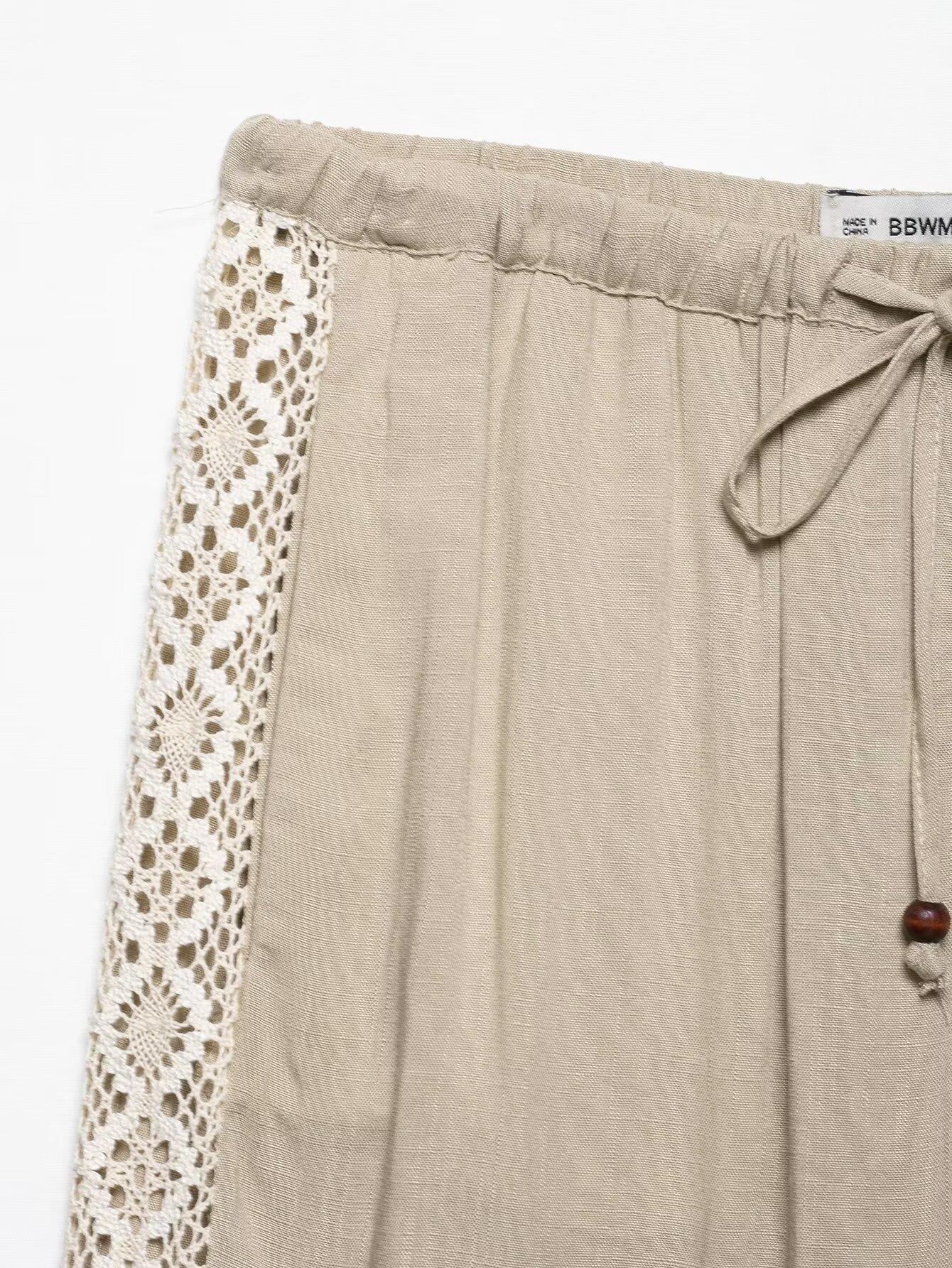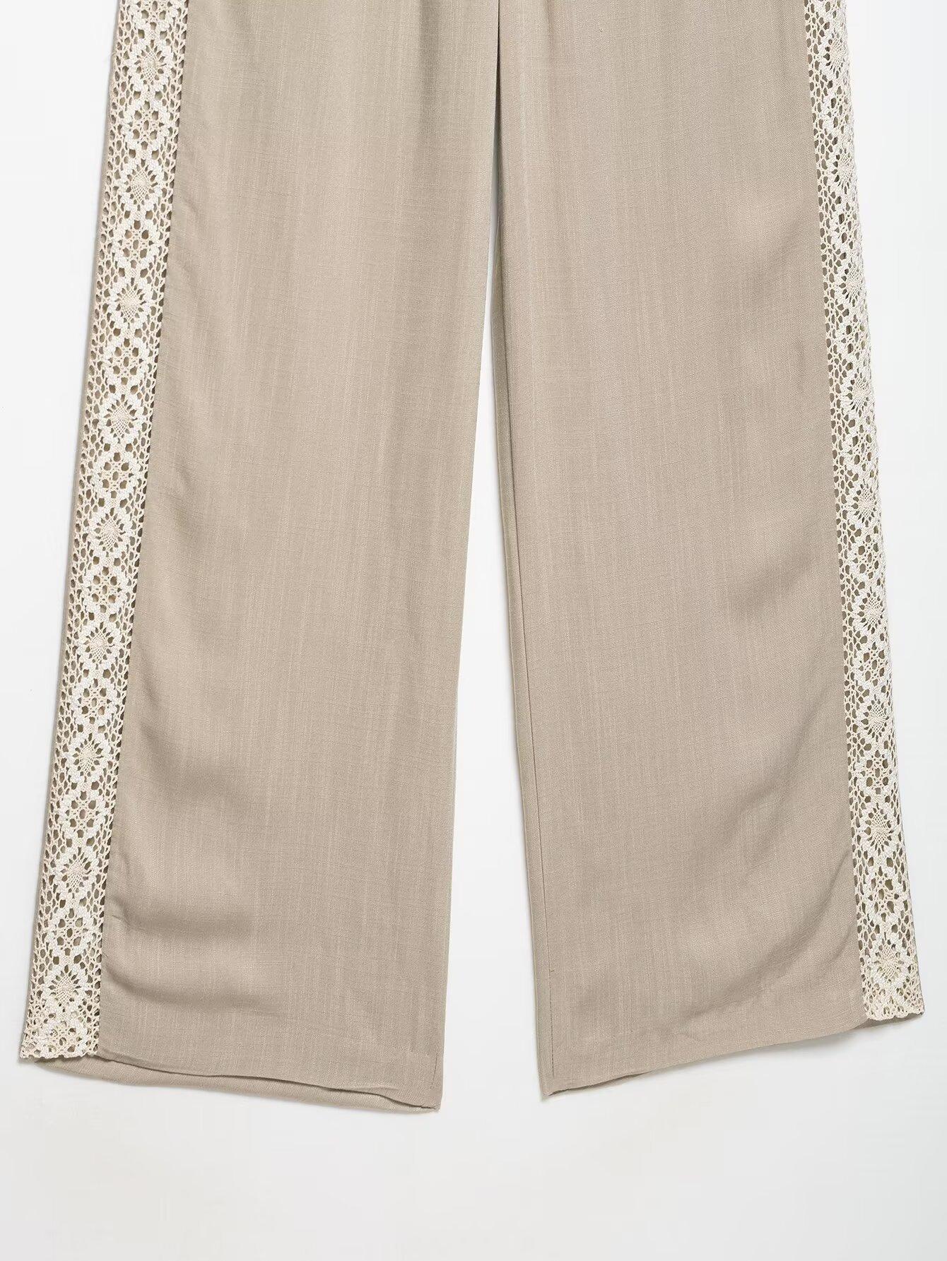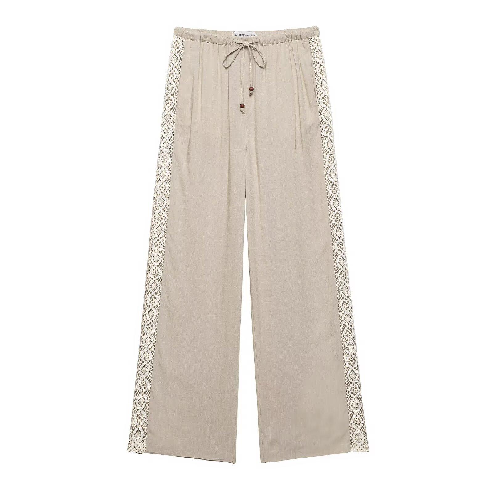 Venta al por mayor de exportación transfronteriza 2025 Verano Ropa de mujer europea y americana Encaje lateral Cinturón de rayas bordado Pantalones casuales de pierna ancha