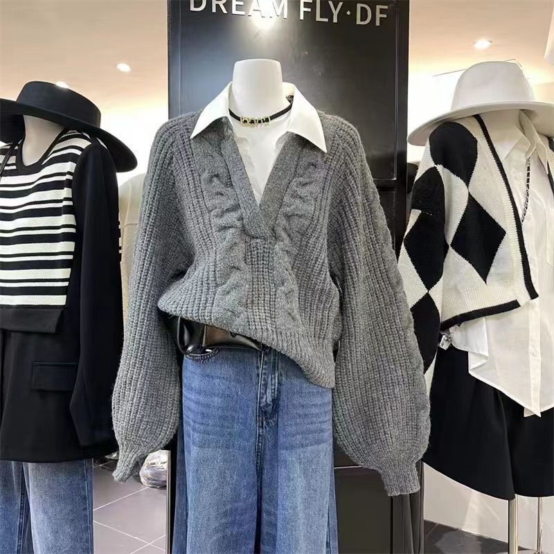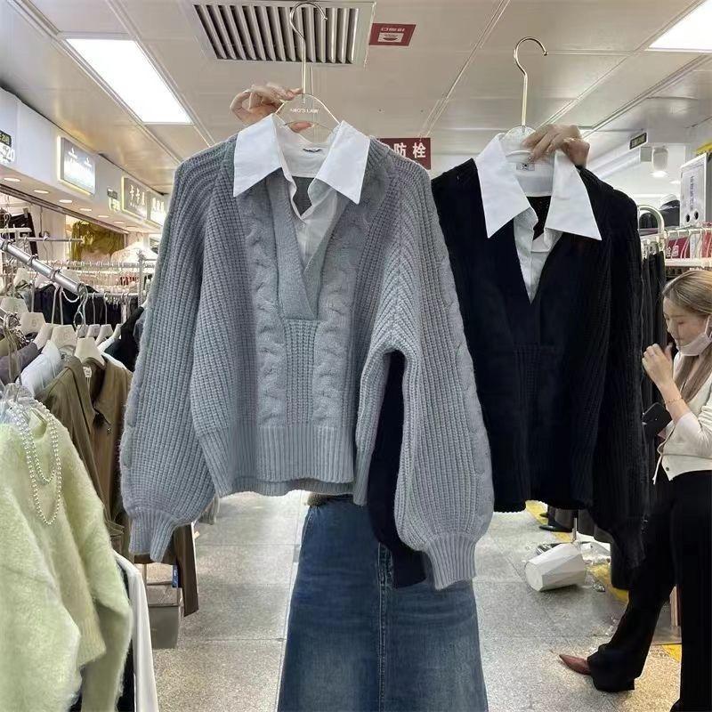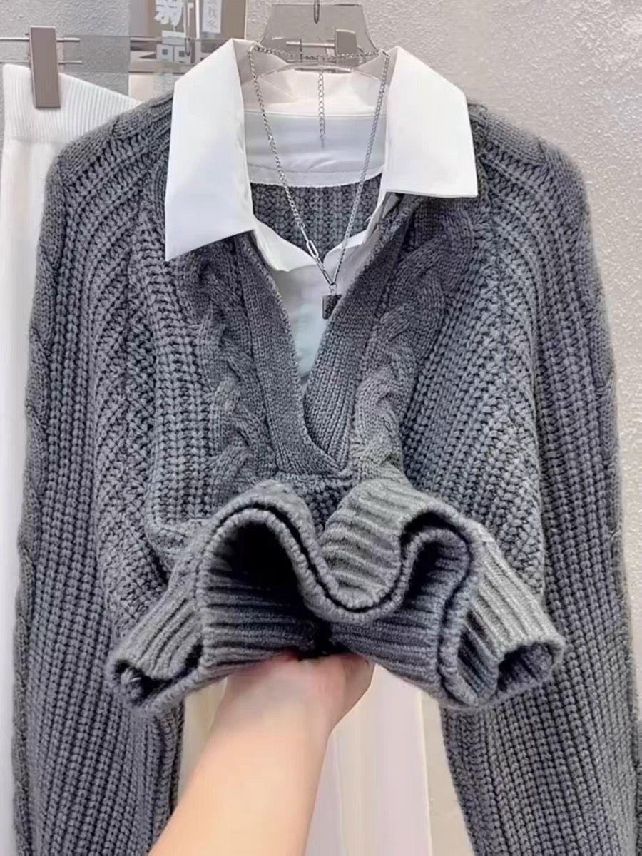 Suéter Otoño Invierno Empalmado Camisa de Mujer Diseño Nicho Solapa Suelto Top Punto Cable Suéter Tejido Falso Dos Piezas
