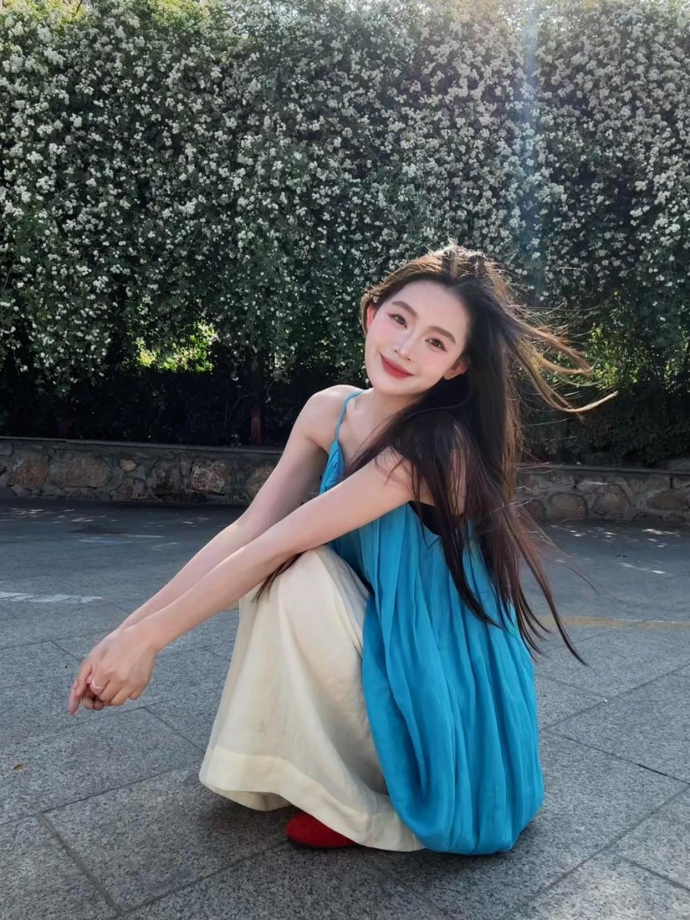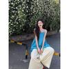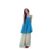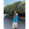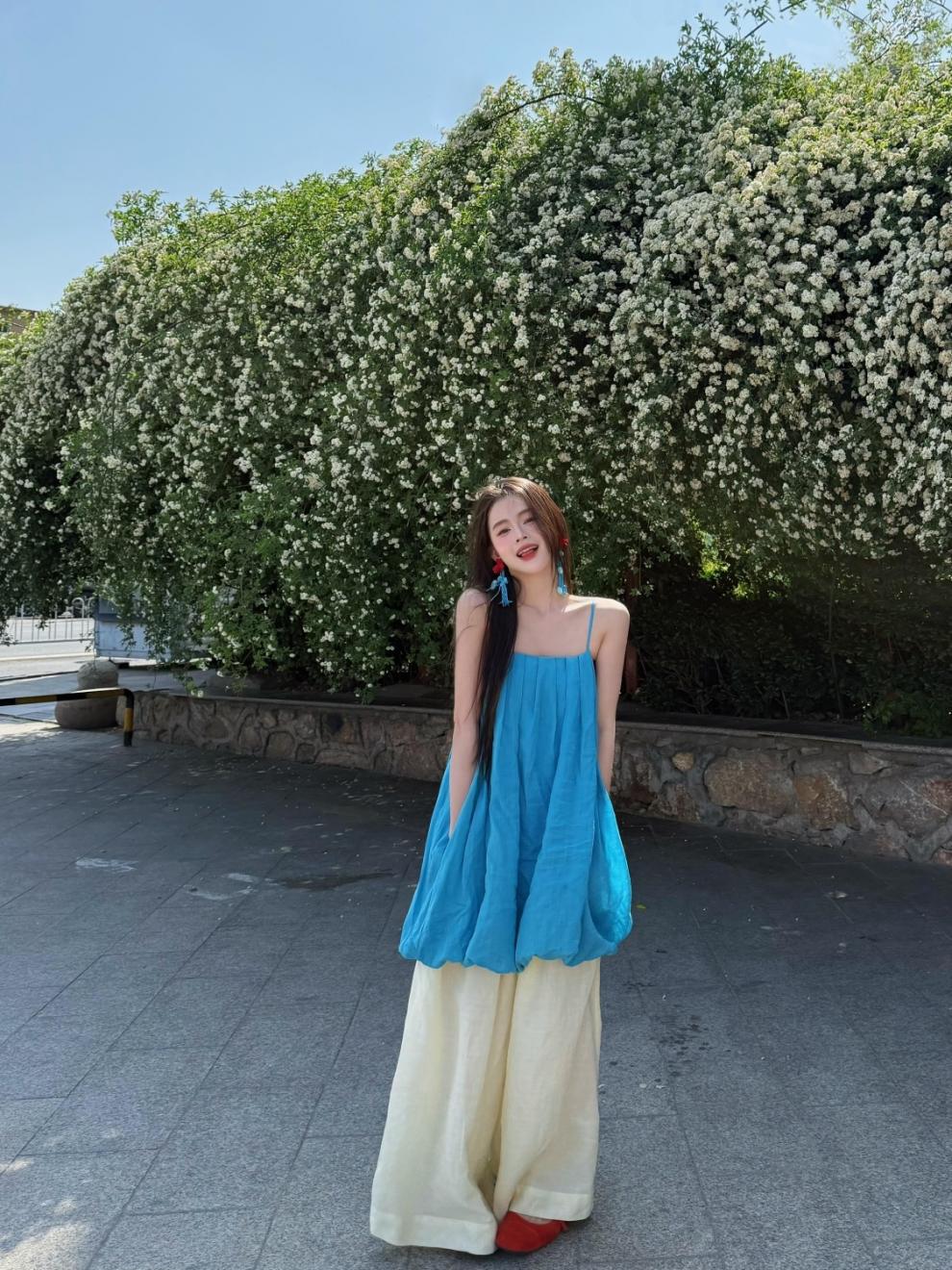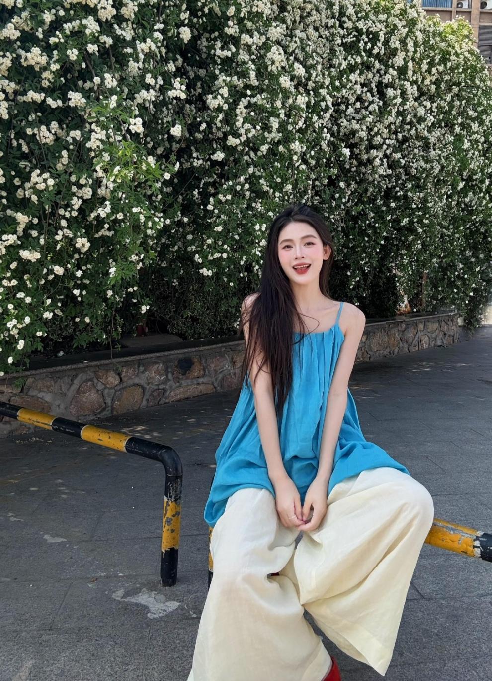 Blue sling [huaduoduo selection], Apricot wide-leg pants [huaduoduo selection], Blue suspenders + apricot wide...