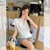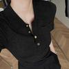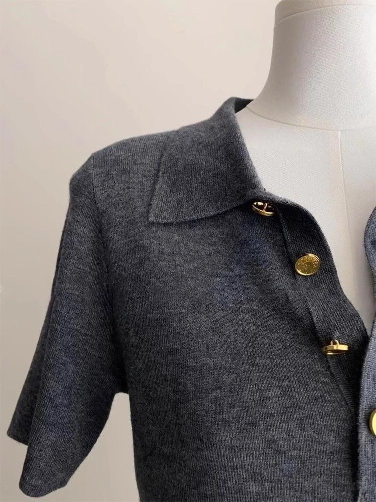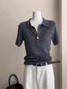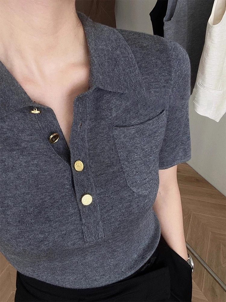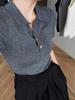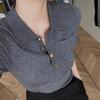 Polo Francés Cuello Gris Manga Corta Top de Punto Mujer Verano Estilo Corto Moda de Alta Gama Temperamento Adelgazante Hombro Recto Top