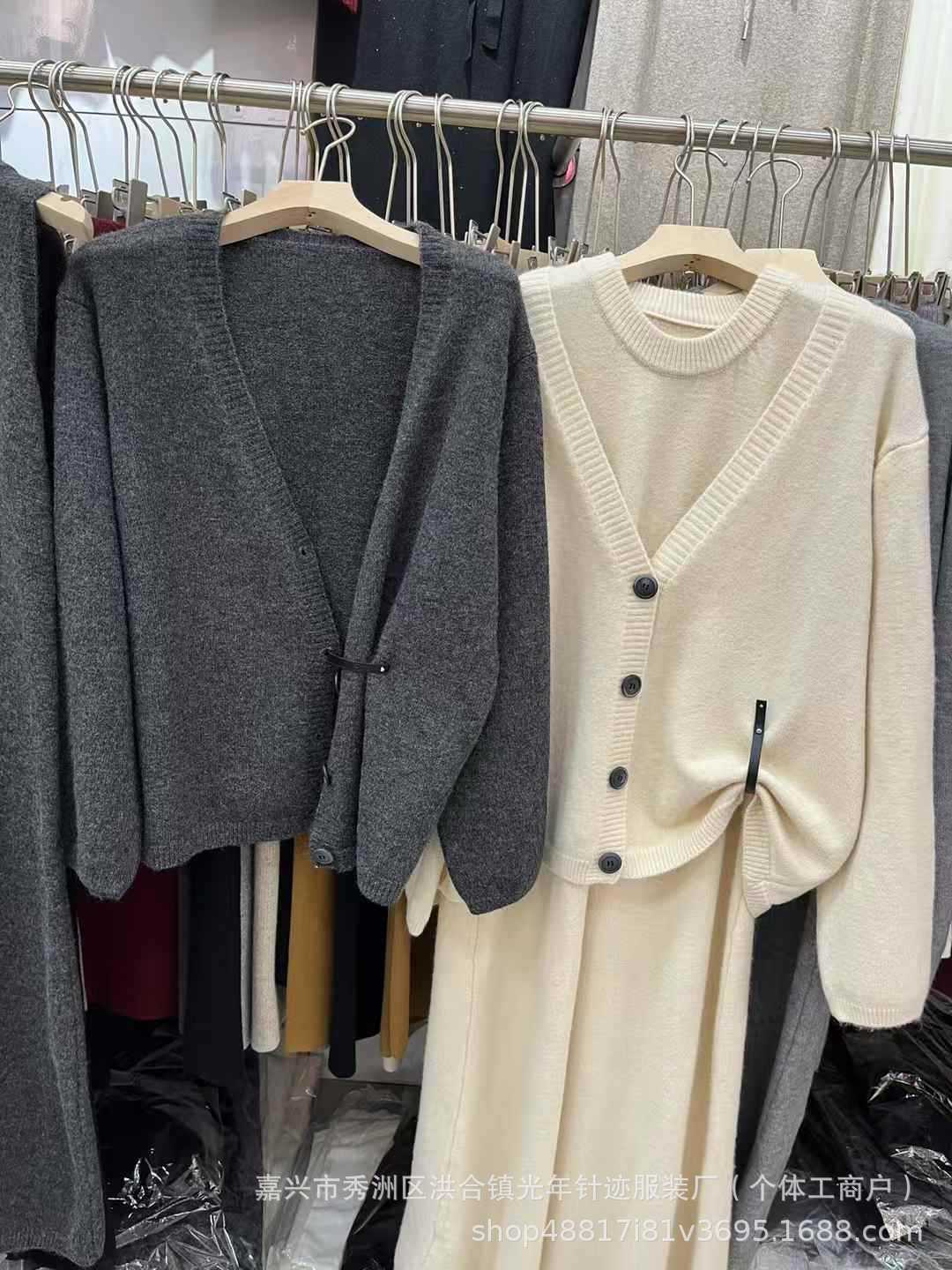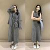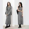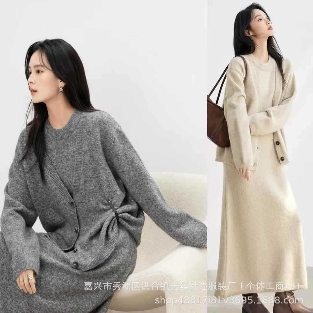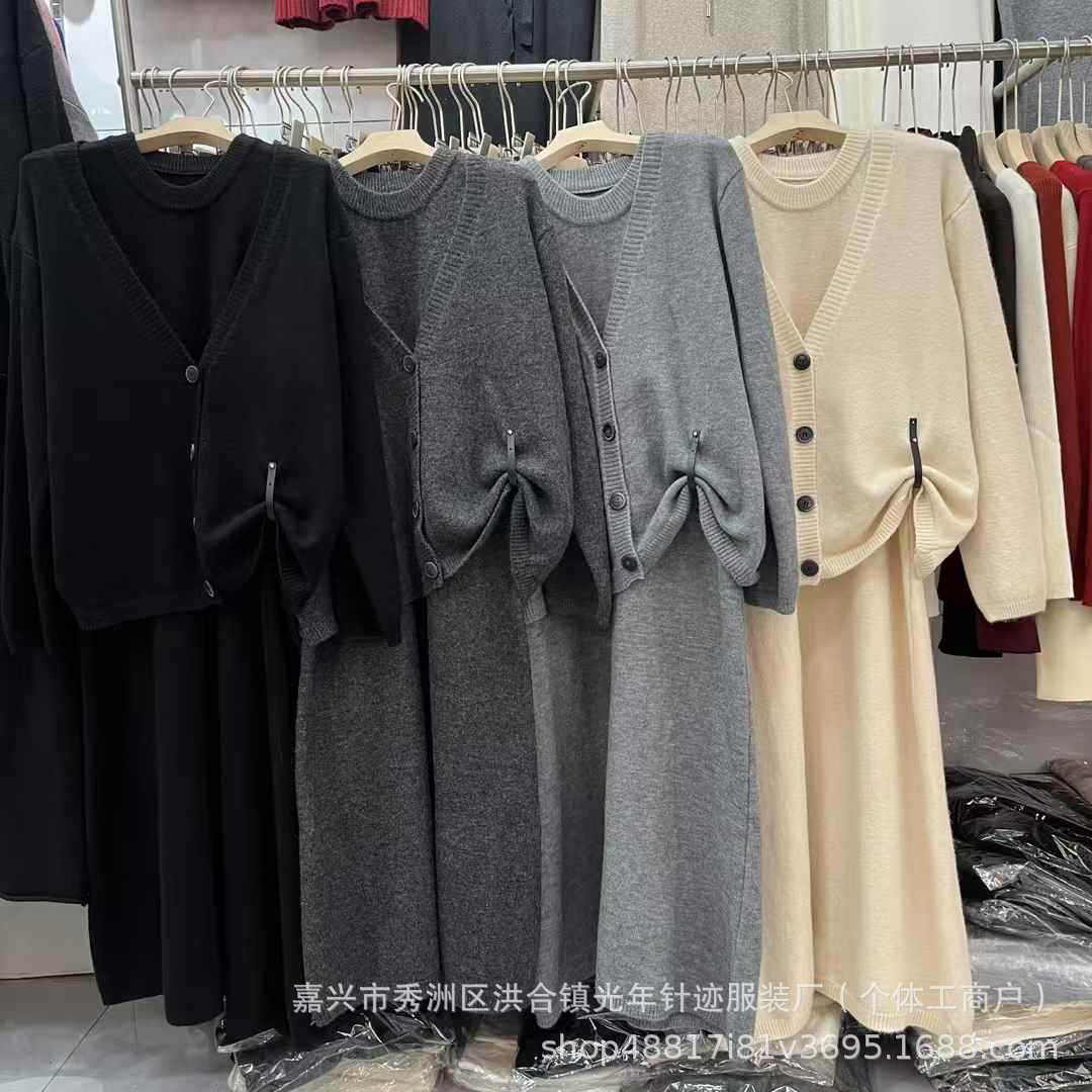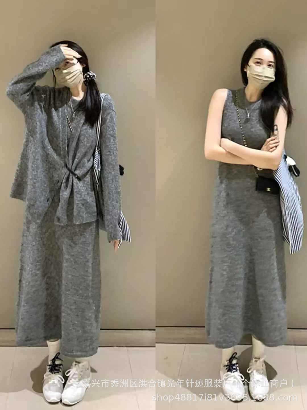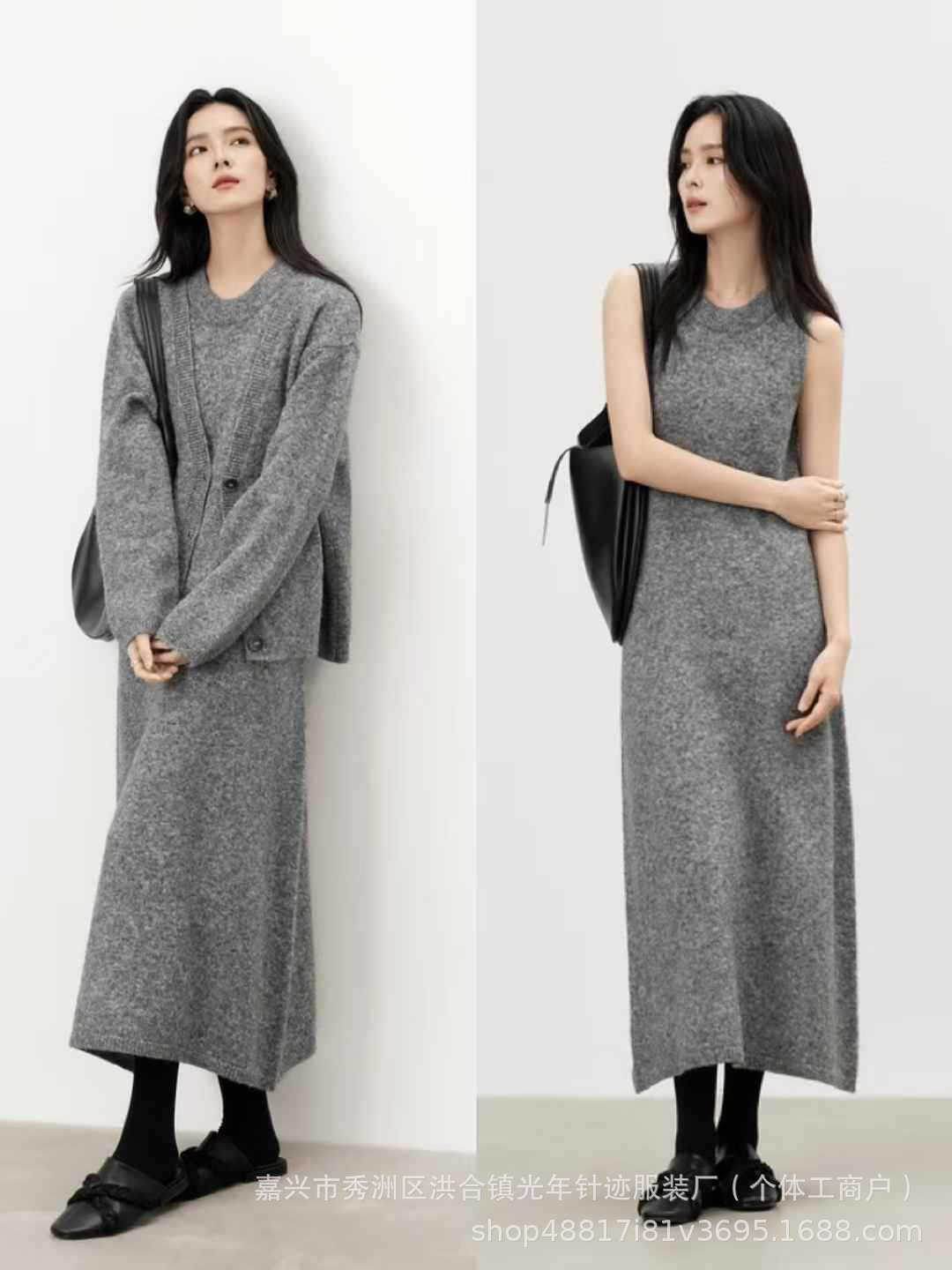 Conjunto Transfronterizo Cuello Redondo Simple Vestido Largo de Punto Cárdigan de Punto a la Moda Otoño e Invierno Nuevo Conjunto de Dos Piezas para Mujer Europeo y Americano
