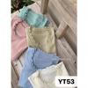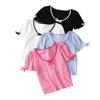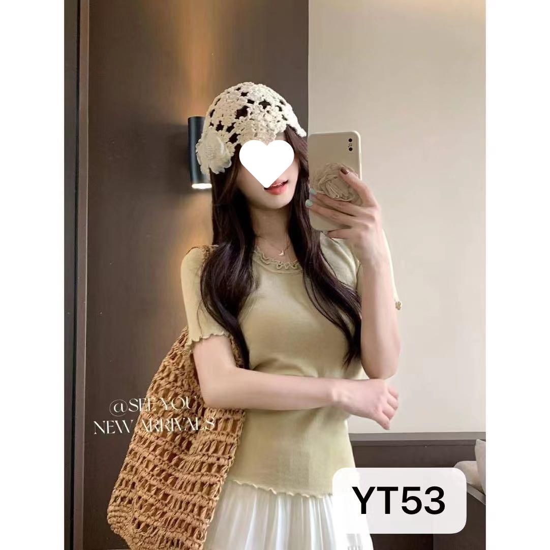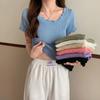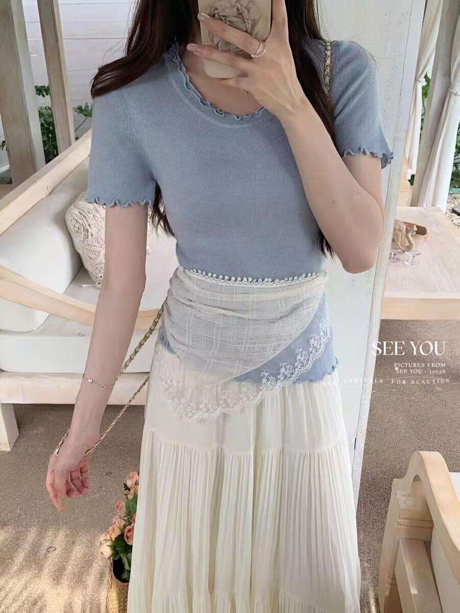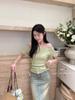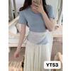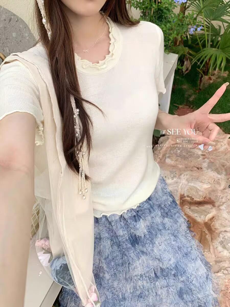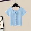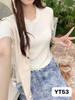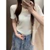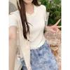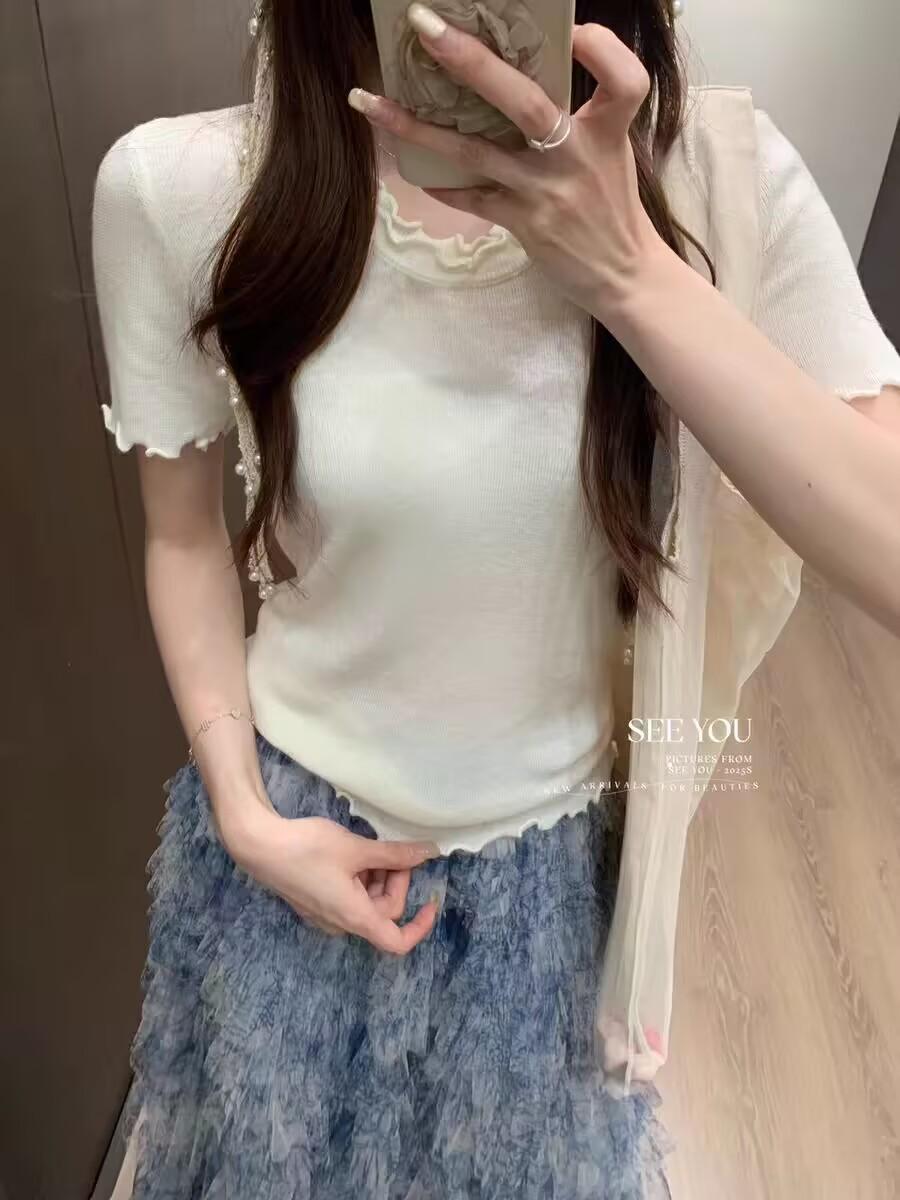 YT53 Top de punto de manga corta con cuello redondo y borde de oreja para mujer, Primavera 2025 Nuevo, Dulce Coreano, Ajustado, Estilo Corto