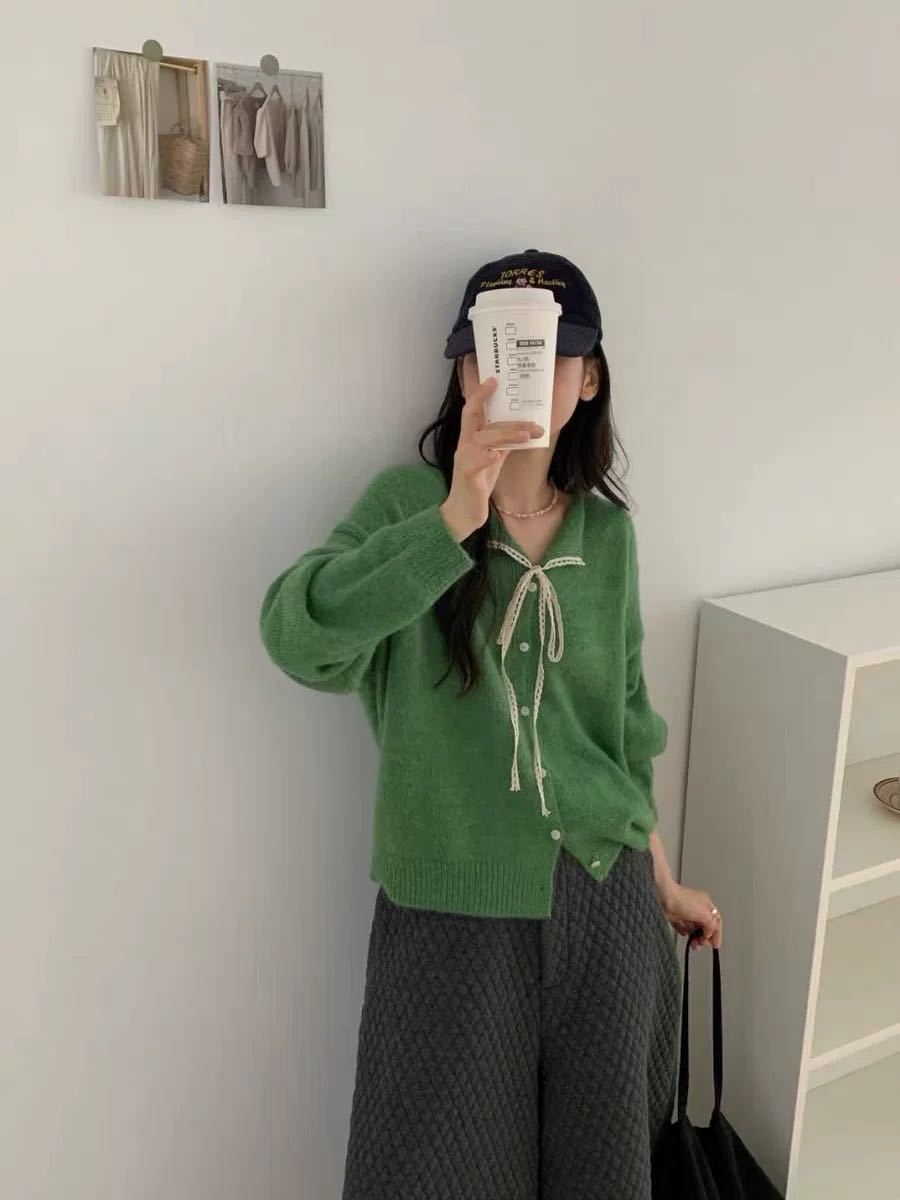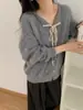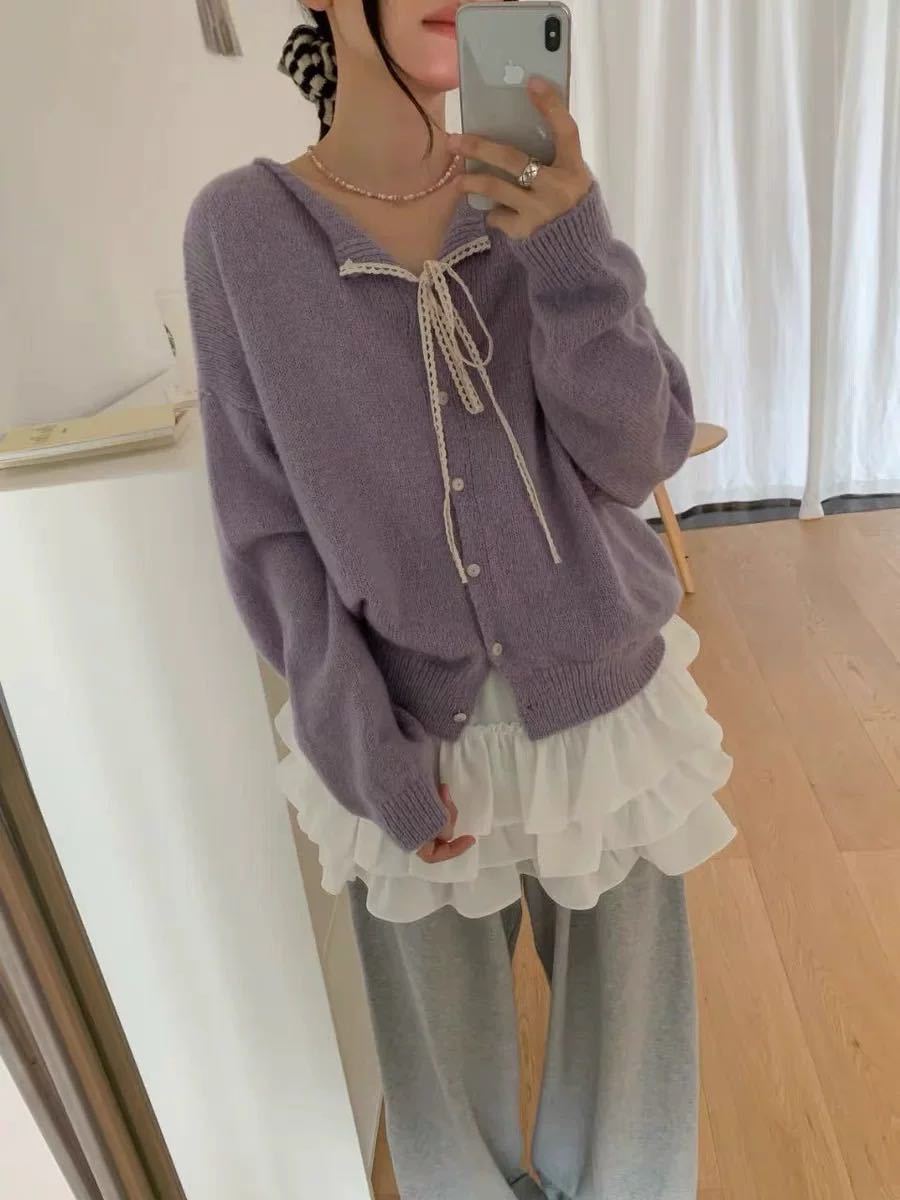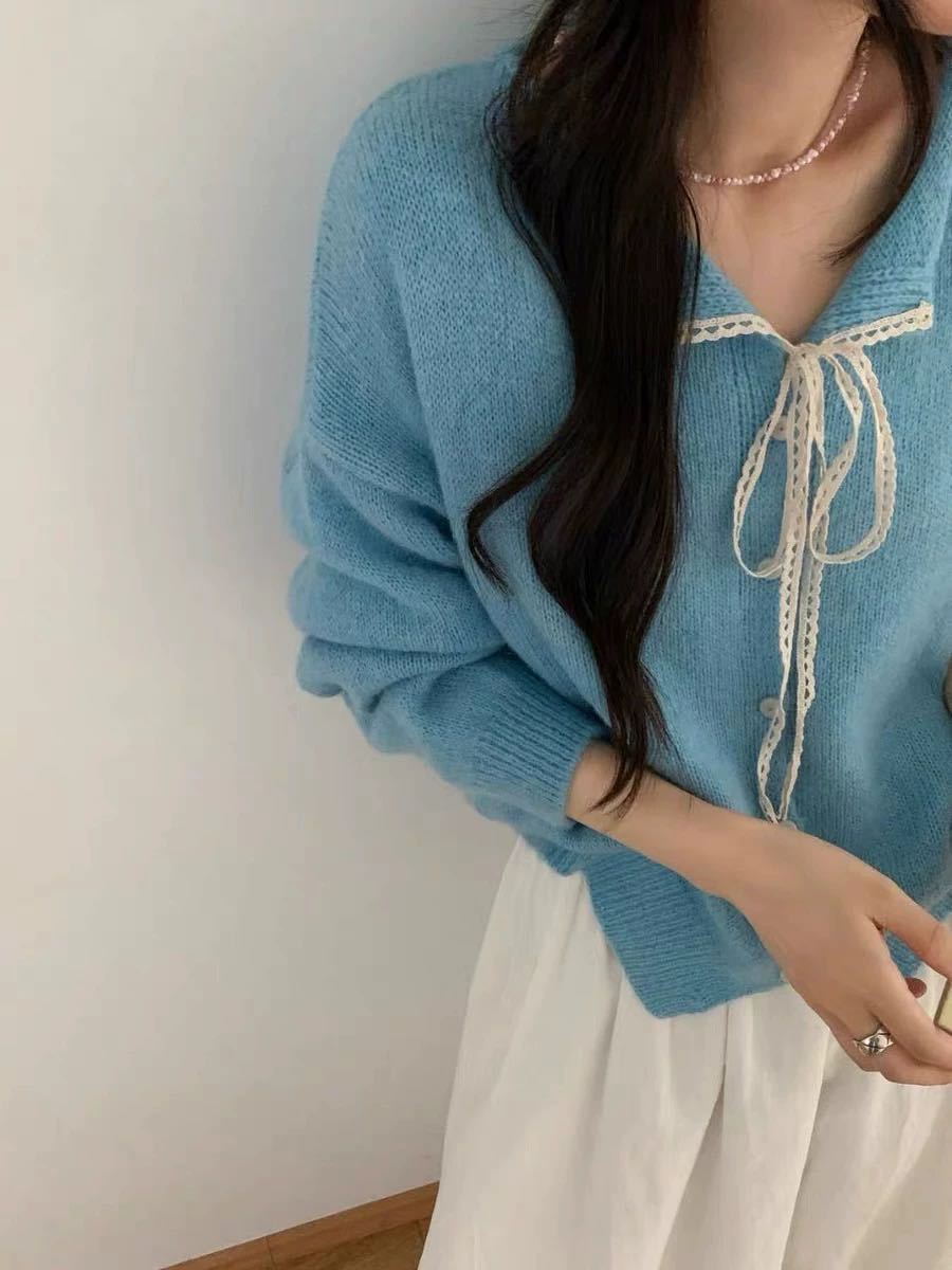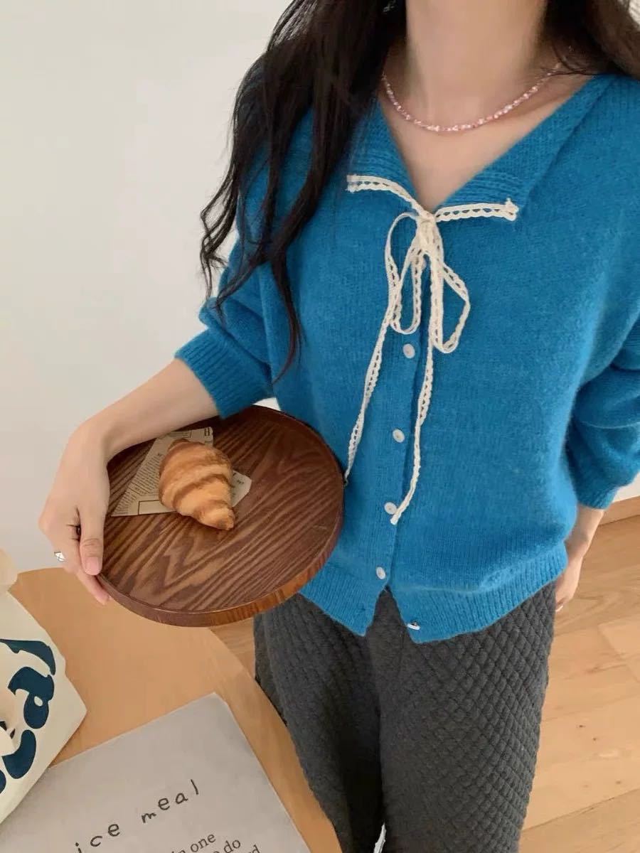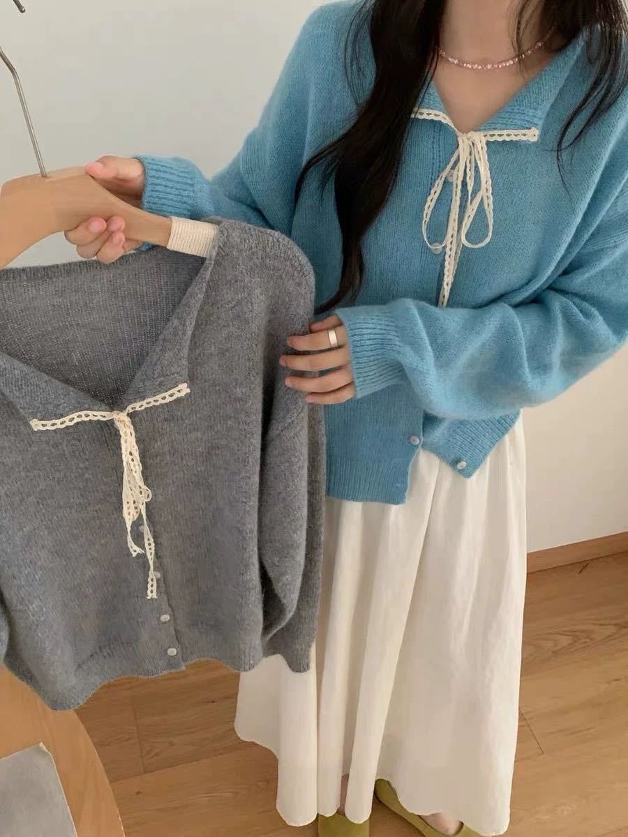 Cárdigan suéter de punto suave versátil de color sólido nuevo de otoño e invierno para mujer estilo coreano con solapa de encaje con cordones