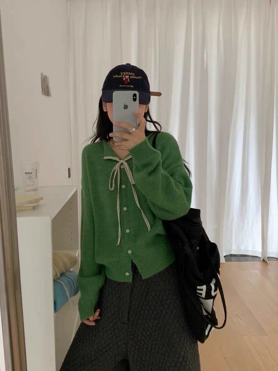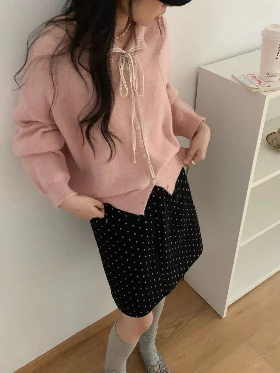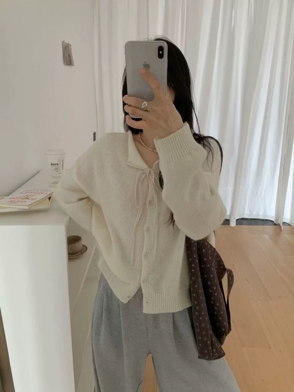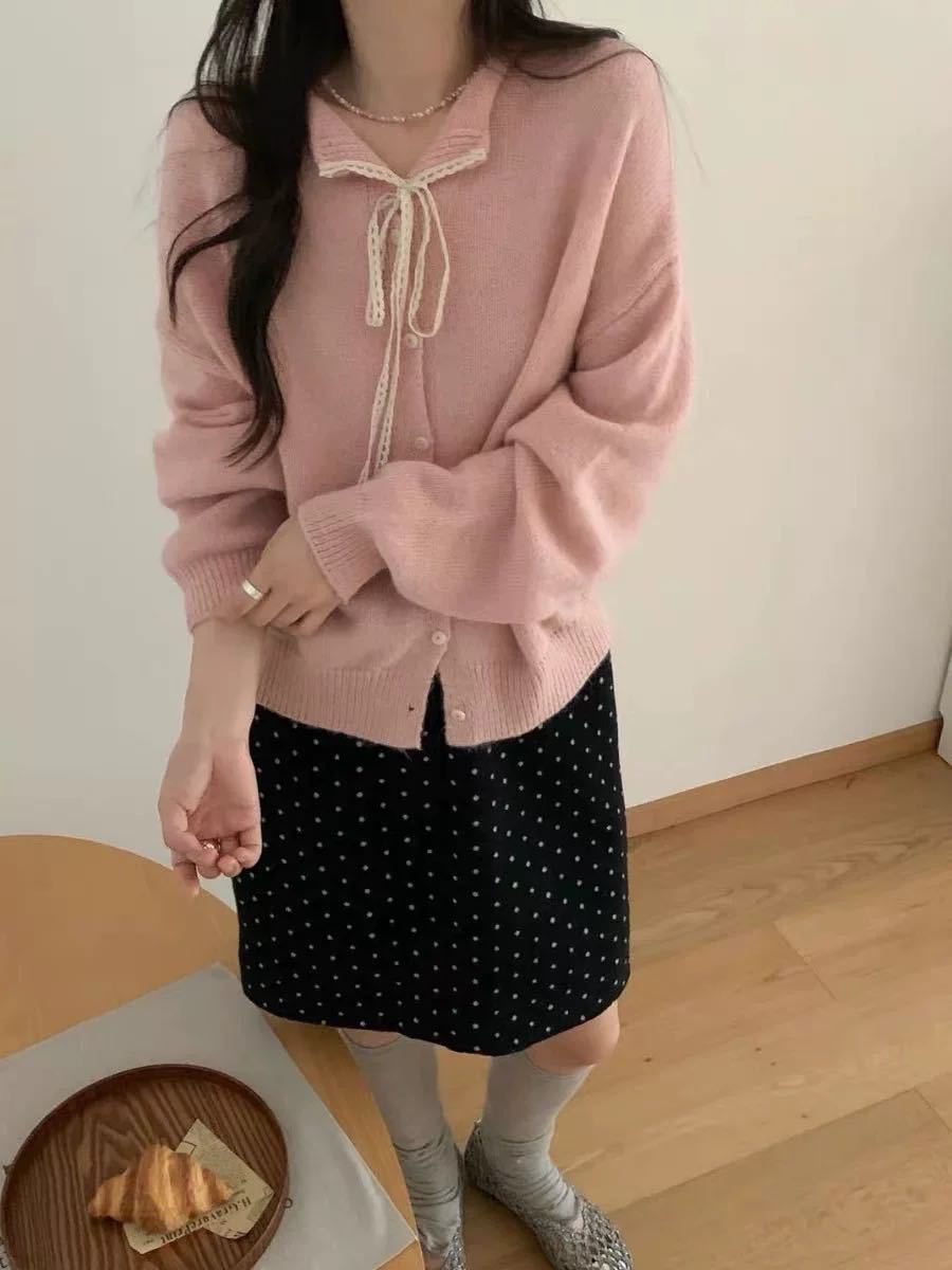 Cárdigan suéter de punto suave versátil de color sólido nuevo de otoño e invierno para mujer estilo coreano con solapa de encaje con cordones