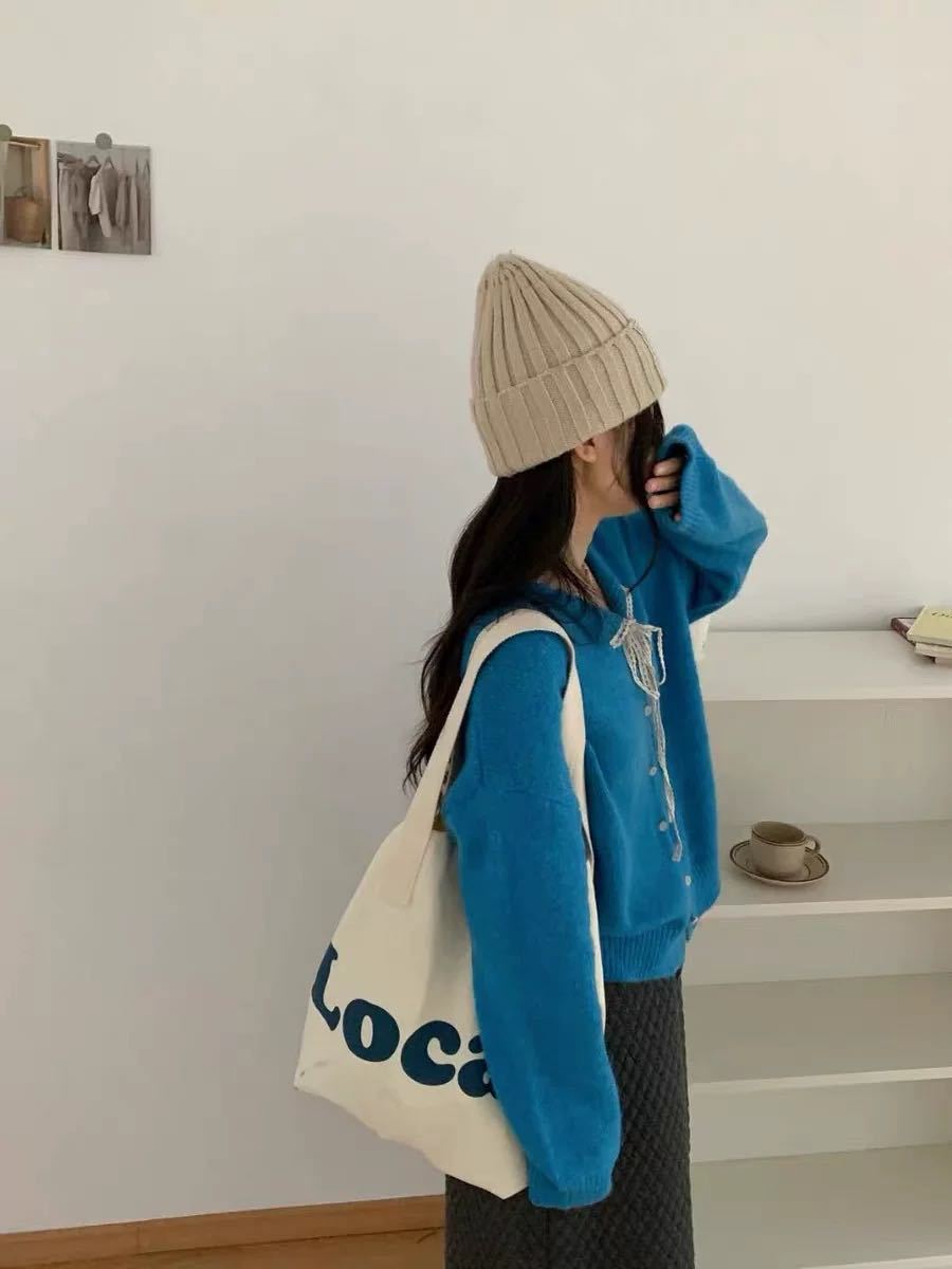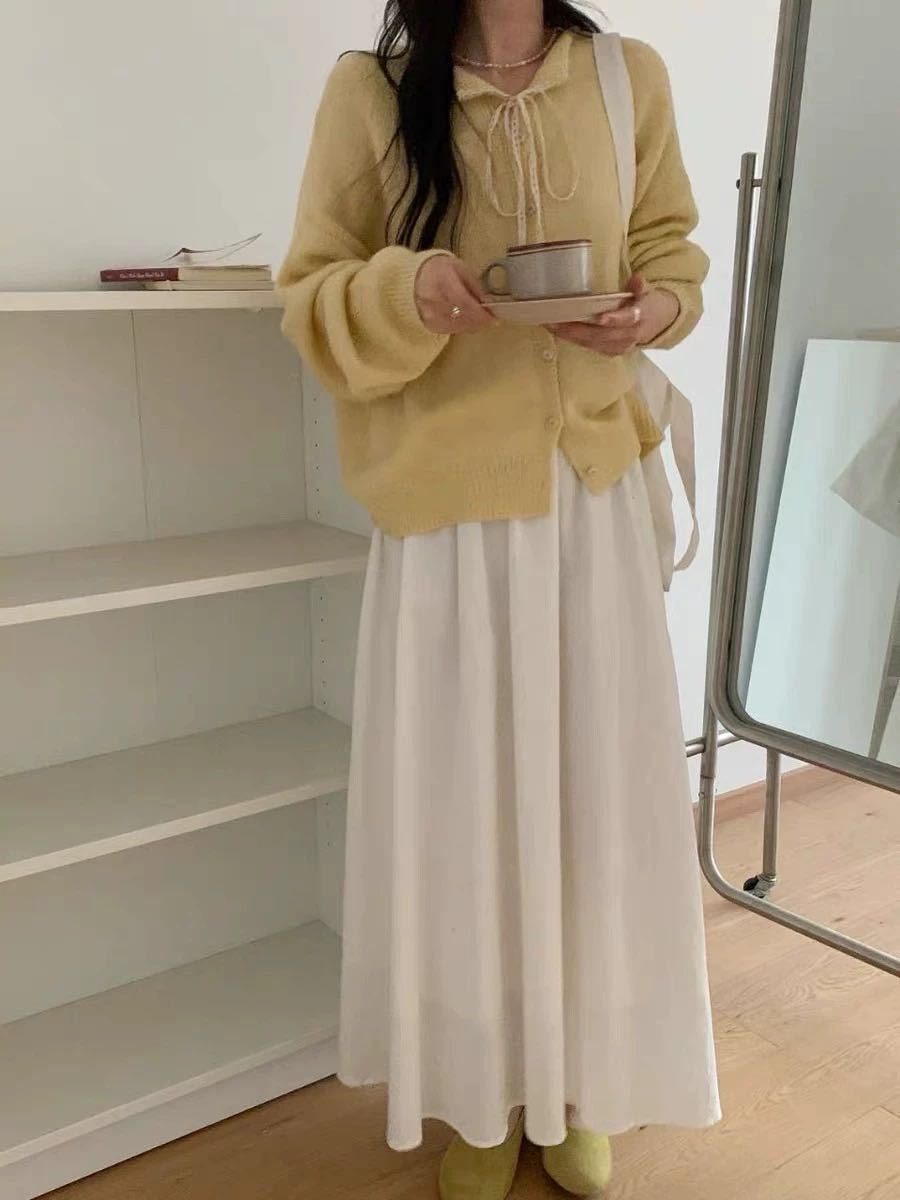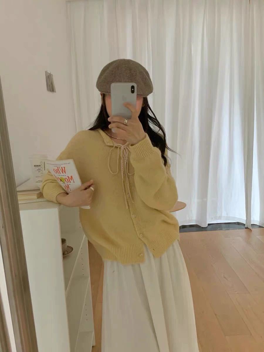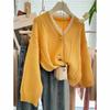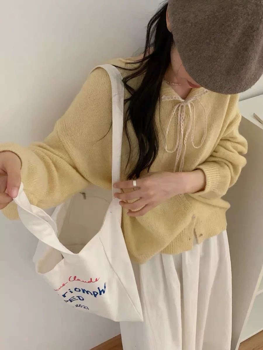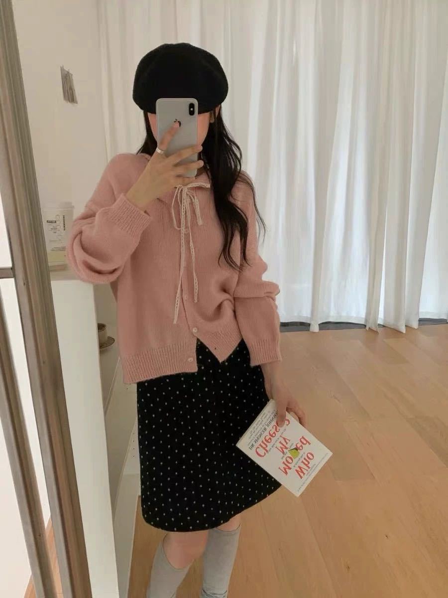 Cárdigan suéter de punto suave versátil de color sólido nuevo de otoño e invierno para mujer estilo coreano con solapa de encaje con cordones