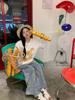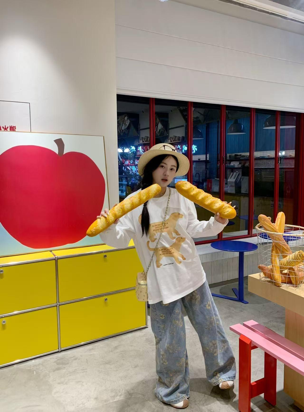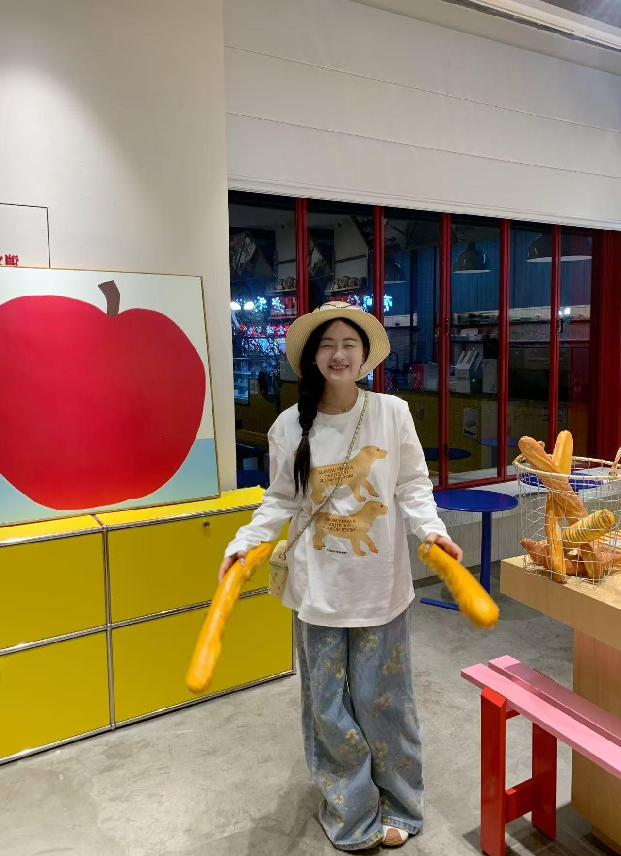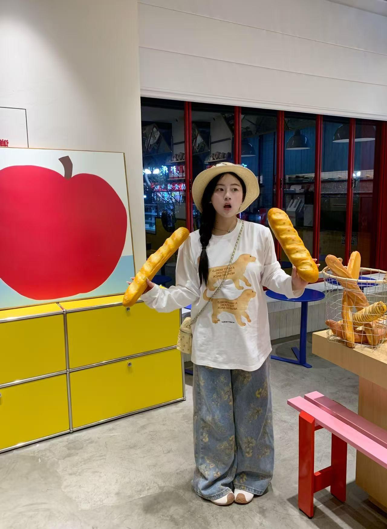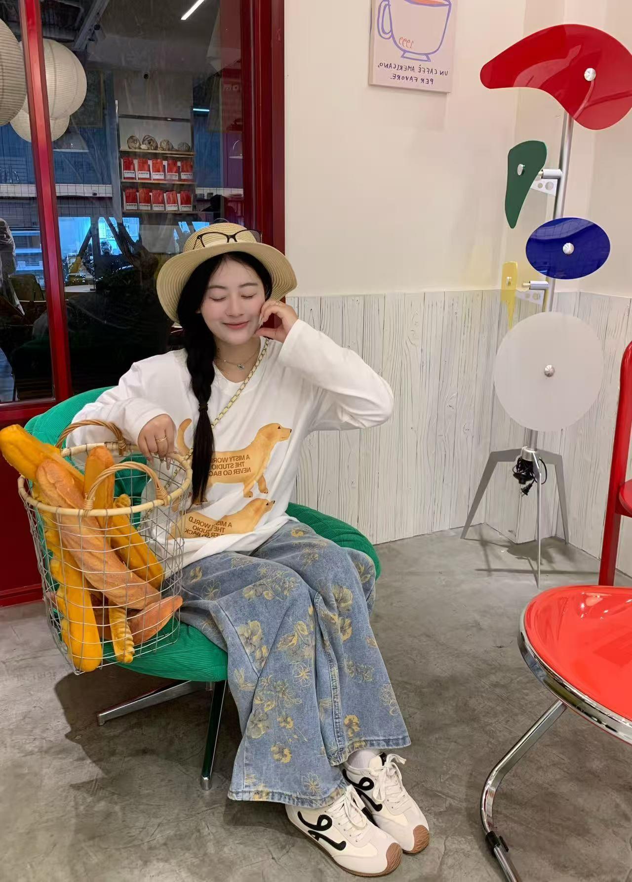 Estilo Coreano Nuevo Estampado de Cachorro Algodón Puro Casual Cuello Redondo Top para Mujer Primavera Otoño Versátil Suelto Base Manga Larga Camiseta Tendencia