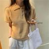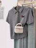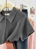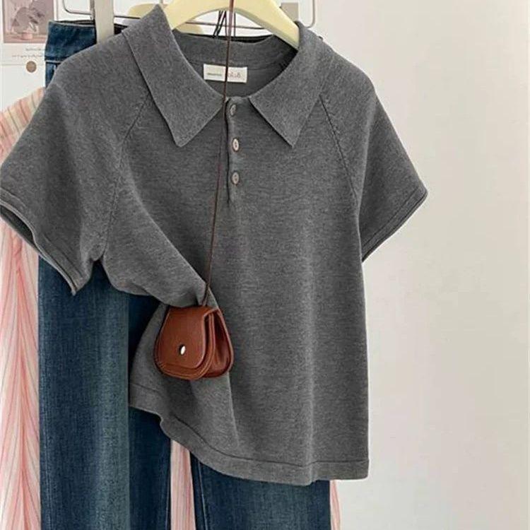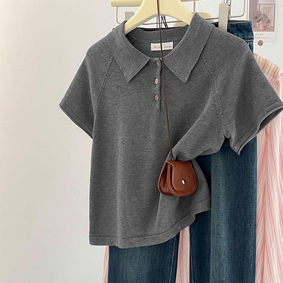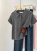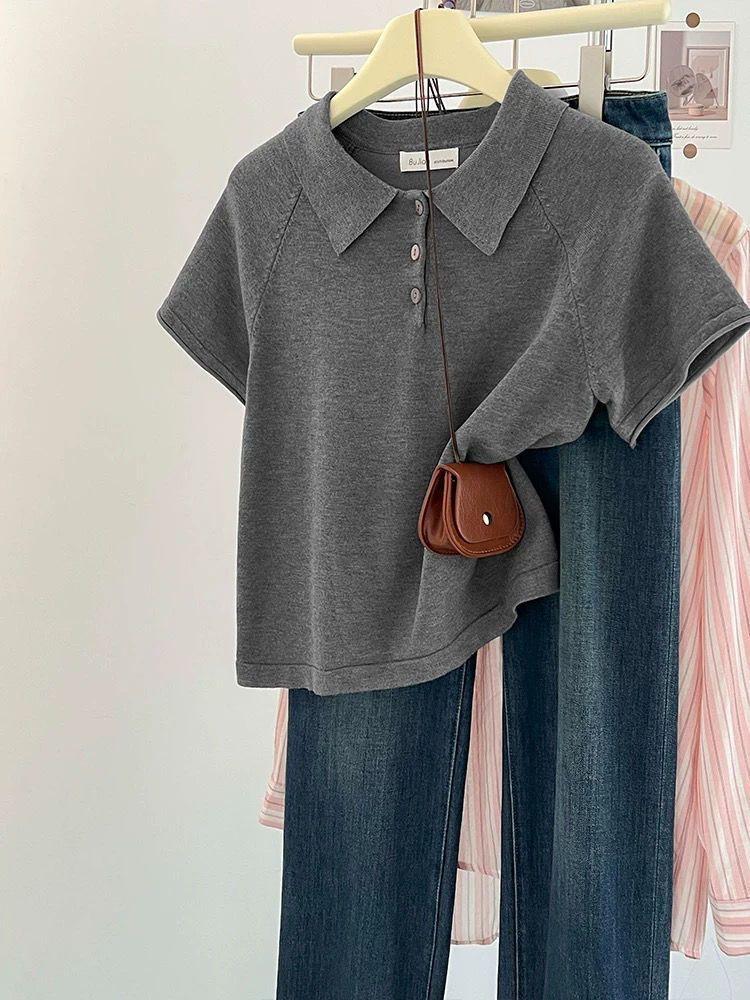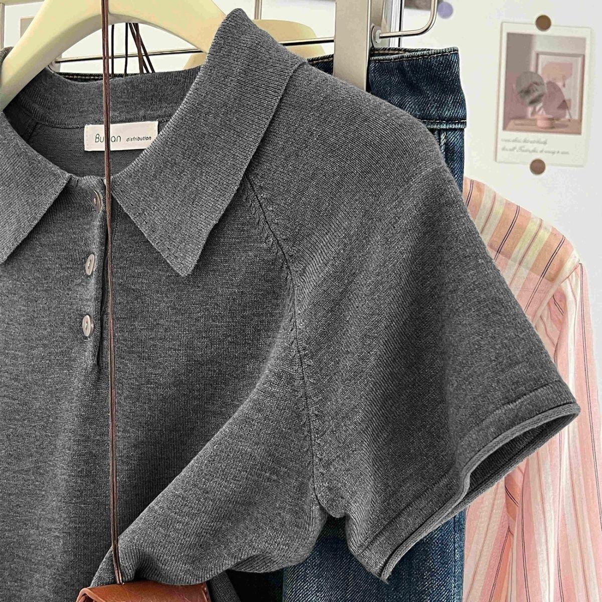 Camiseta de manga corta de seda helada con cuello polo gris estilo coreano para mujer, diseño de verano con sentido, pequeña, holgada, corta, tejida, top chic
