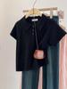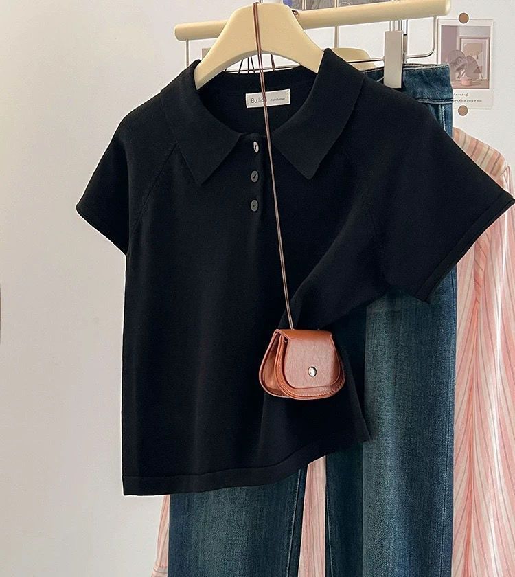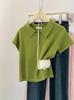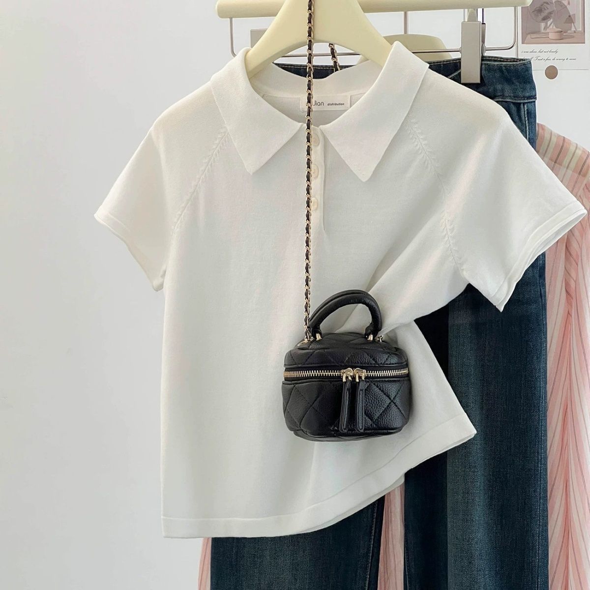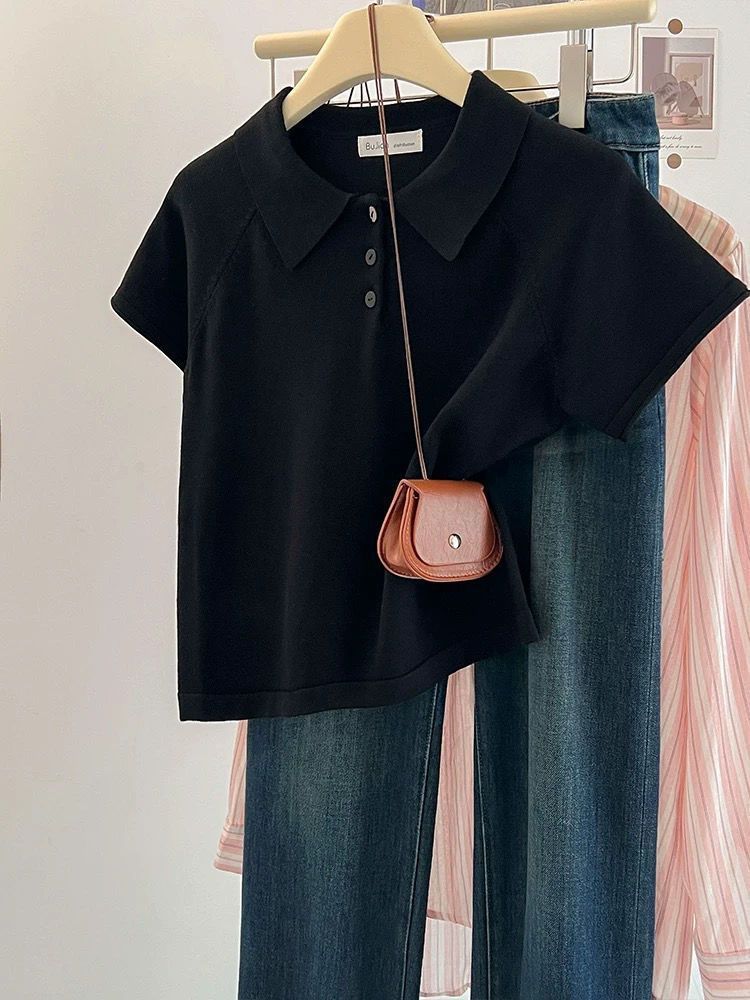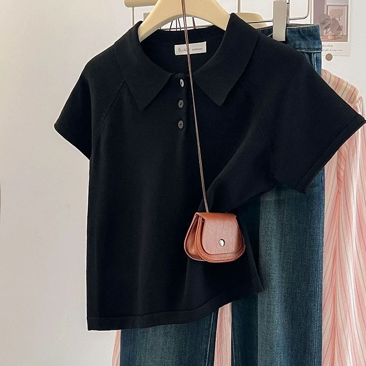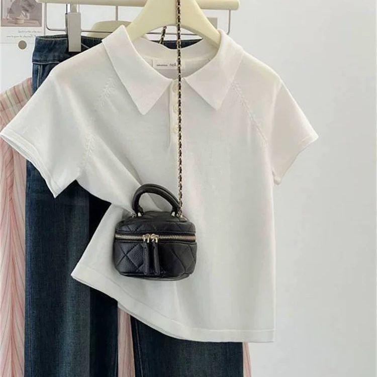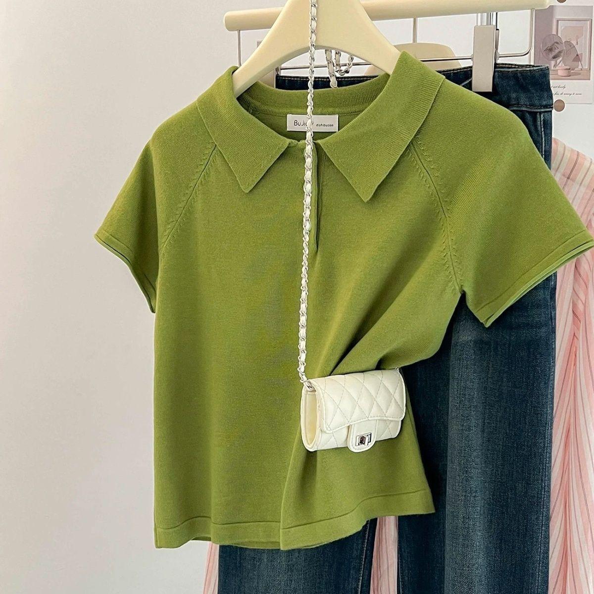 Camiseta de manga corta de seda helada con cuello polo gris estilo coreano para mujer, diseño de verano con sentido, pequeña, holgada, corta, tejida, top chic