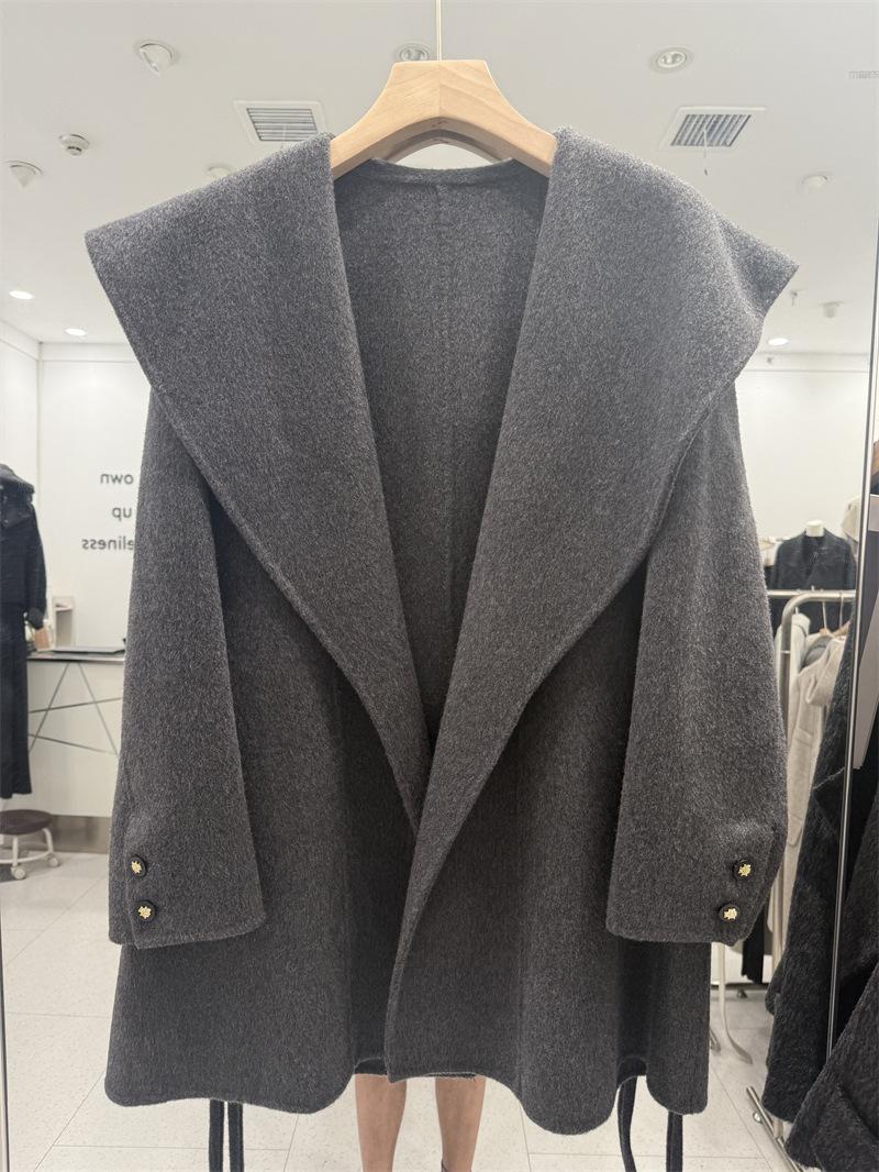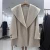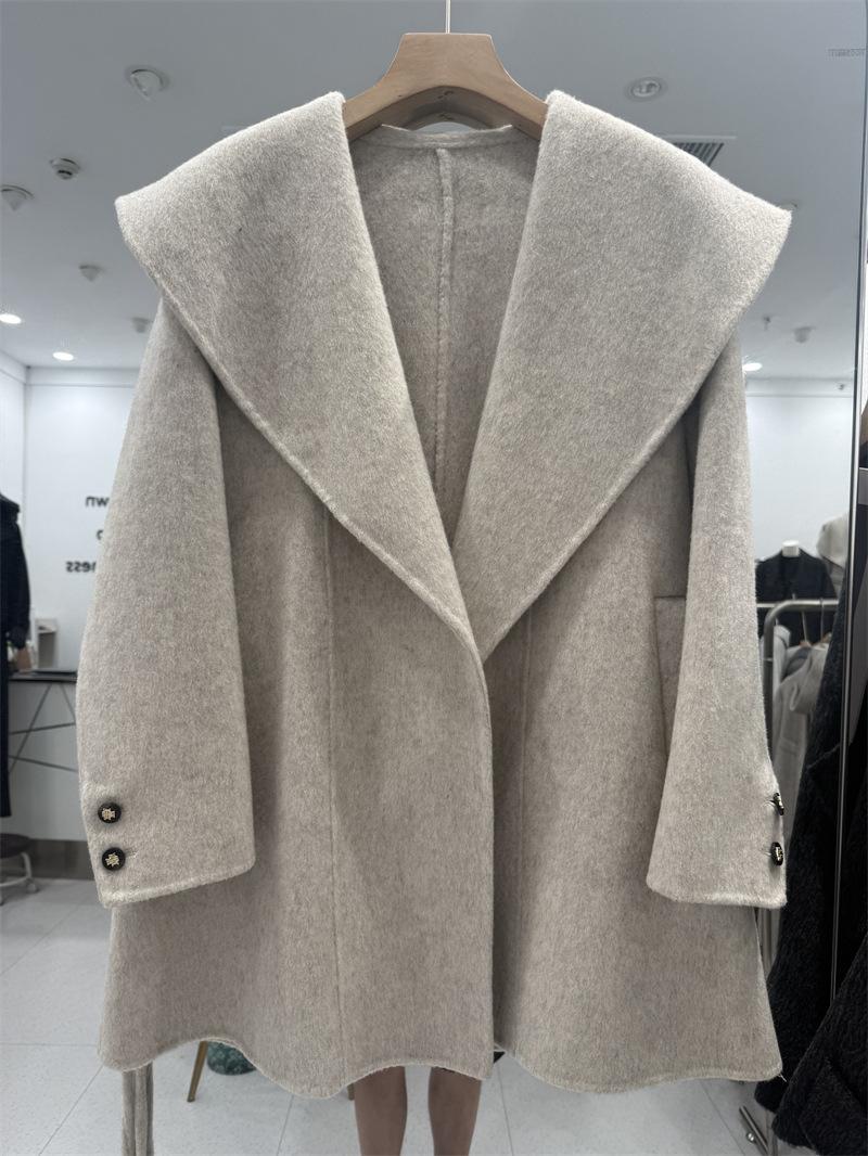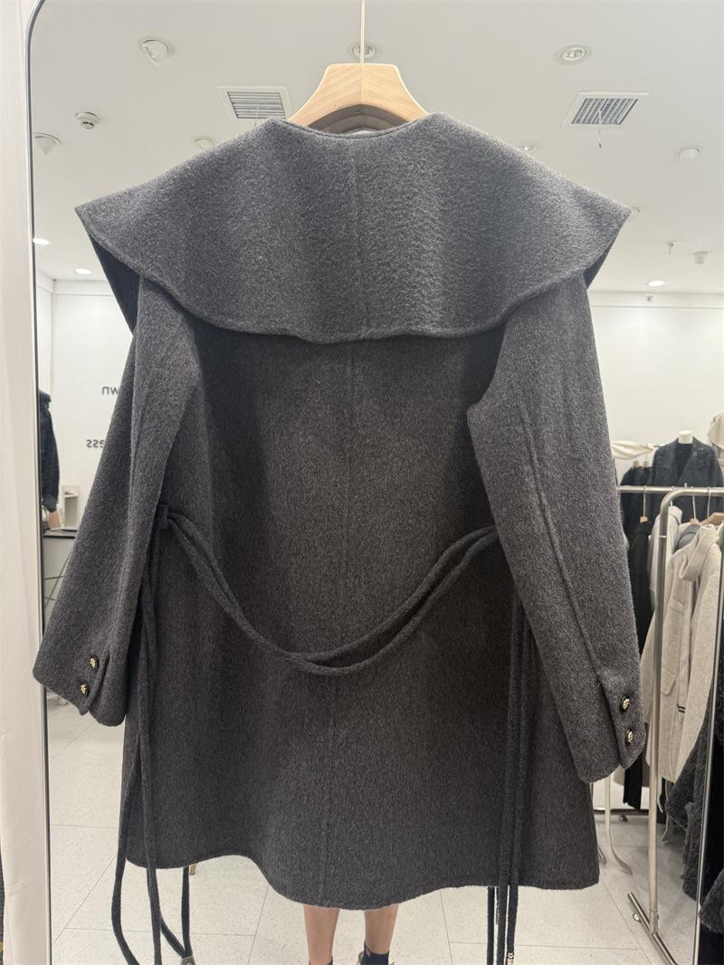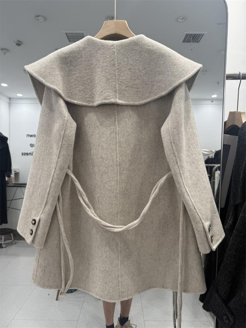 Abrigo de Lana de Doble Cara para Mujer de Largo Medio 2025 Otoño/Invierno Nuevo Estilo Coreano Temperamento Cinturón de Lazo Solapa Grande Abrigo de Lana para Mujer