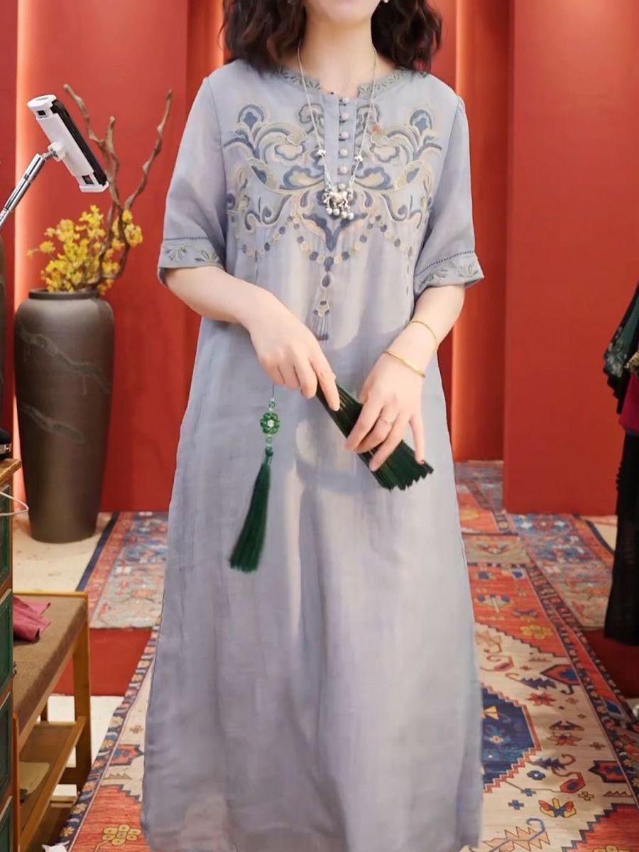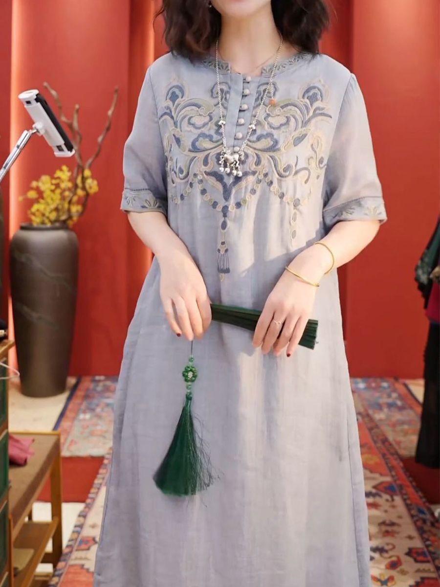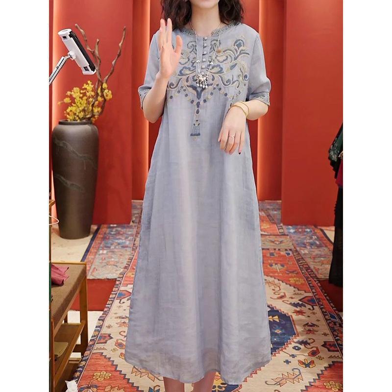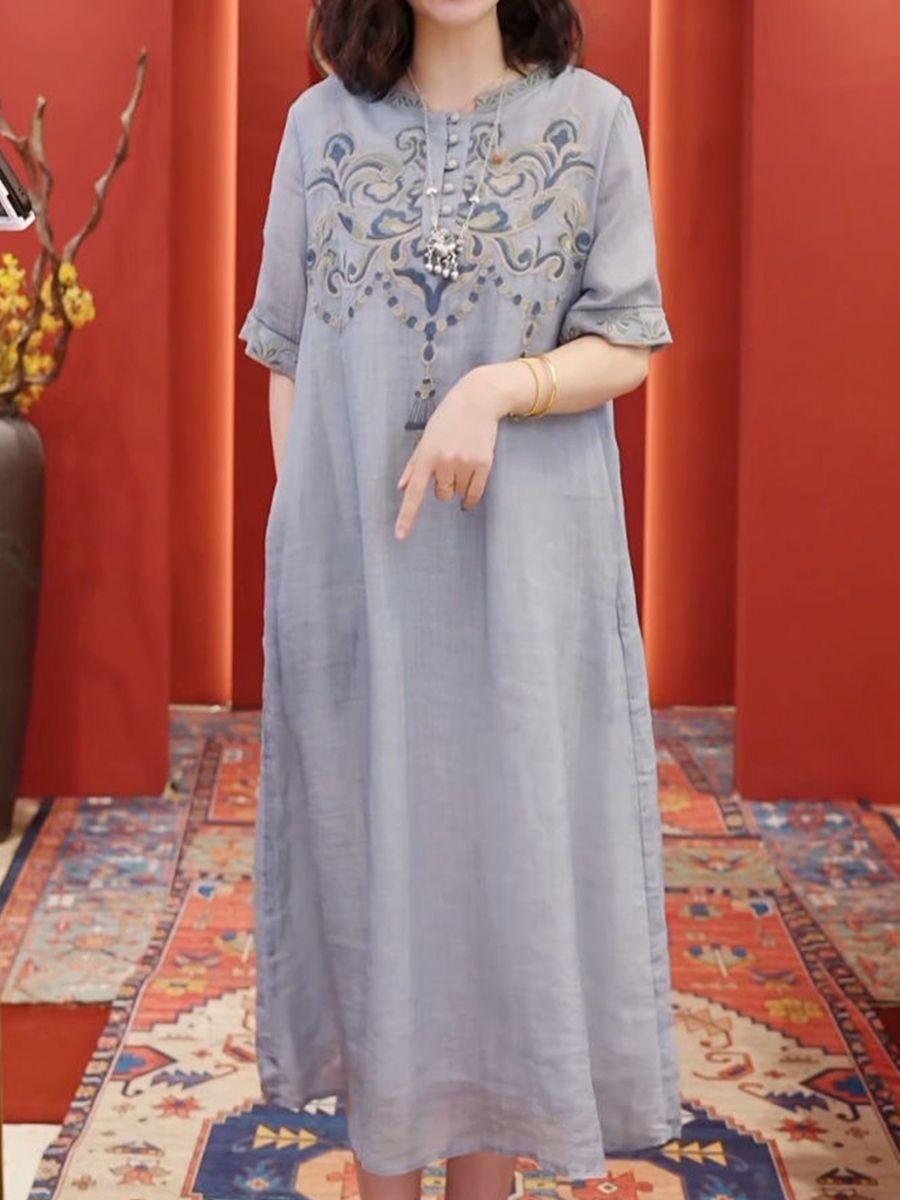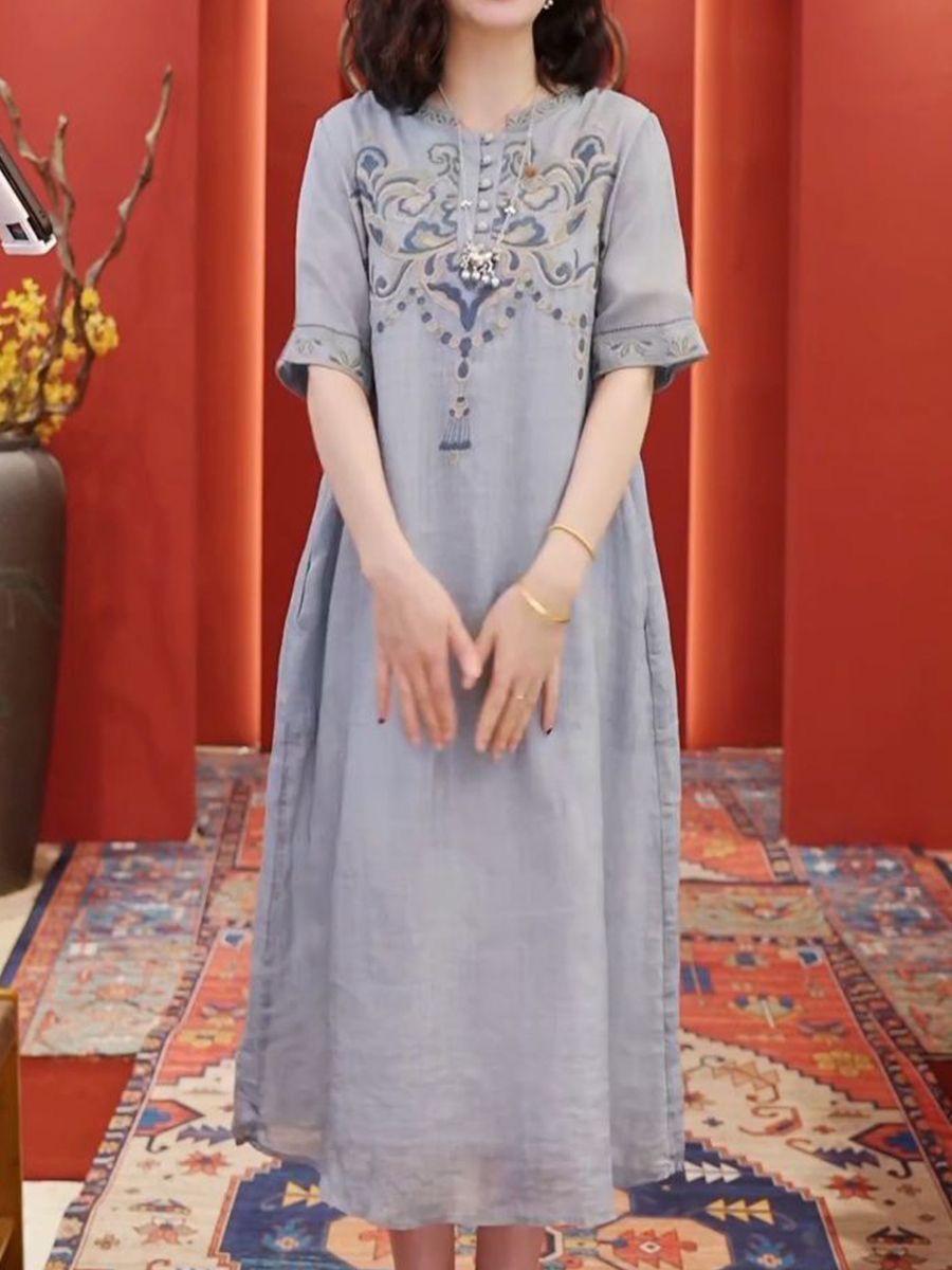 Vestido Primavera/Verano 2025 Algodón Lino Bordado Pesado Nuevo Estilo Cubre Vientre Suelto Adelgazante Talla Grande Moda Falda Temperamento Mujer