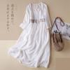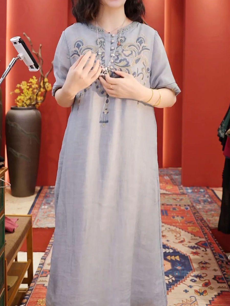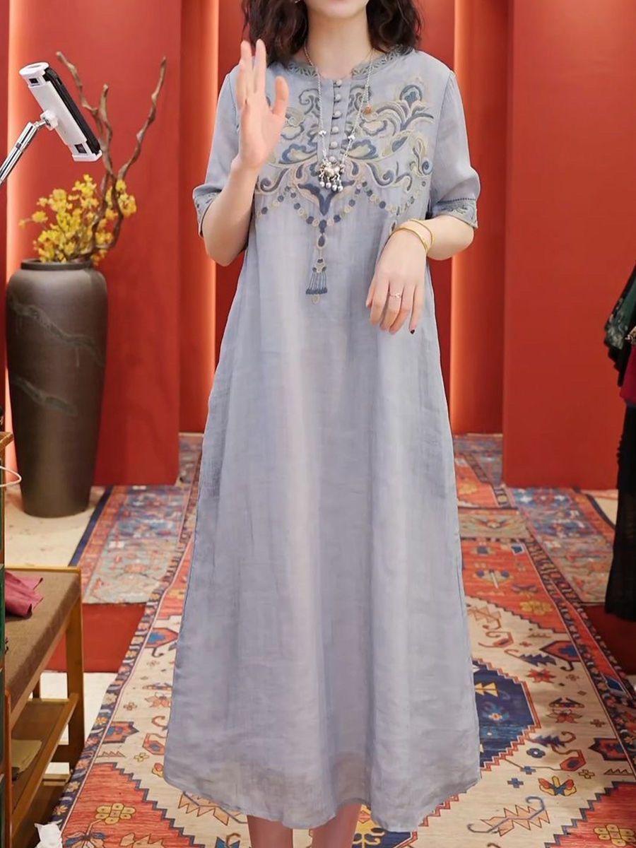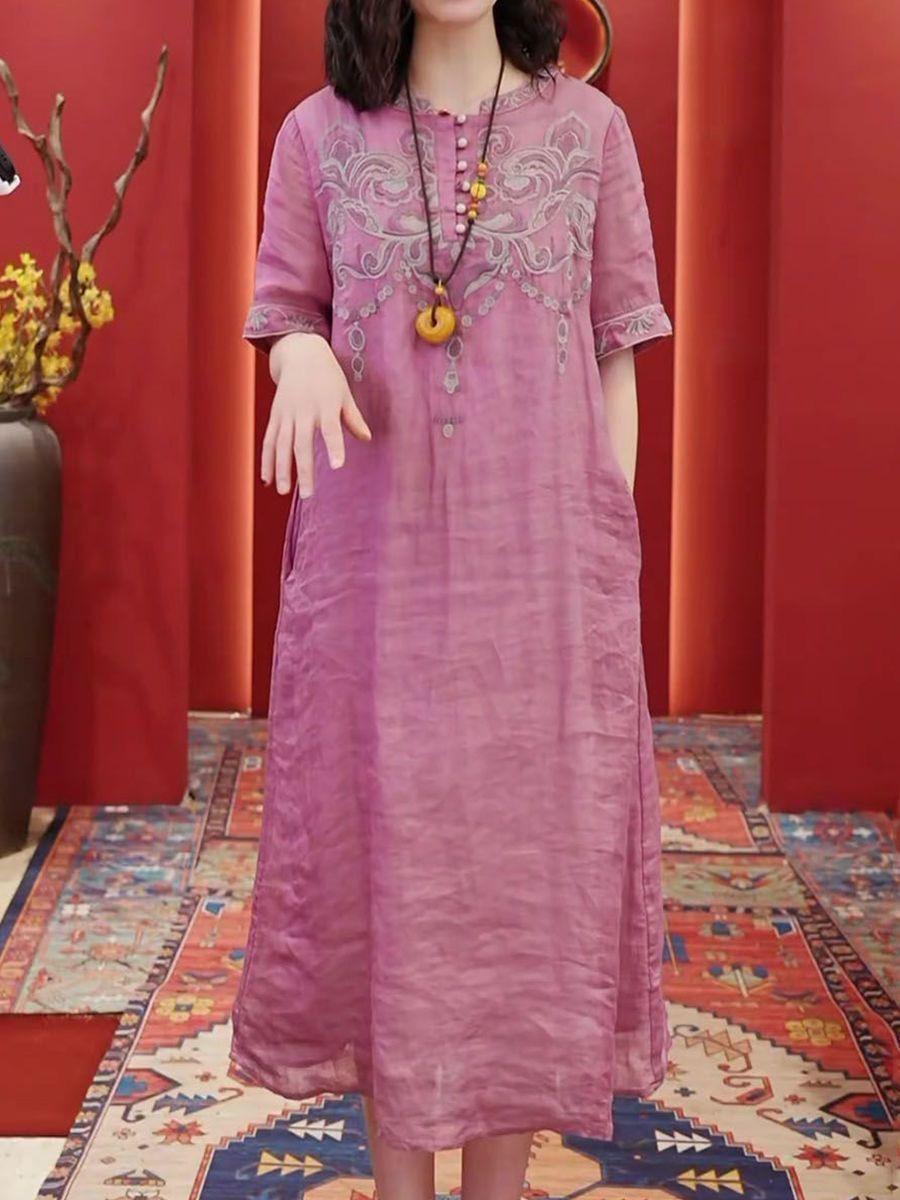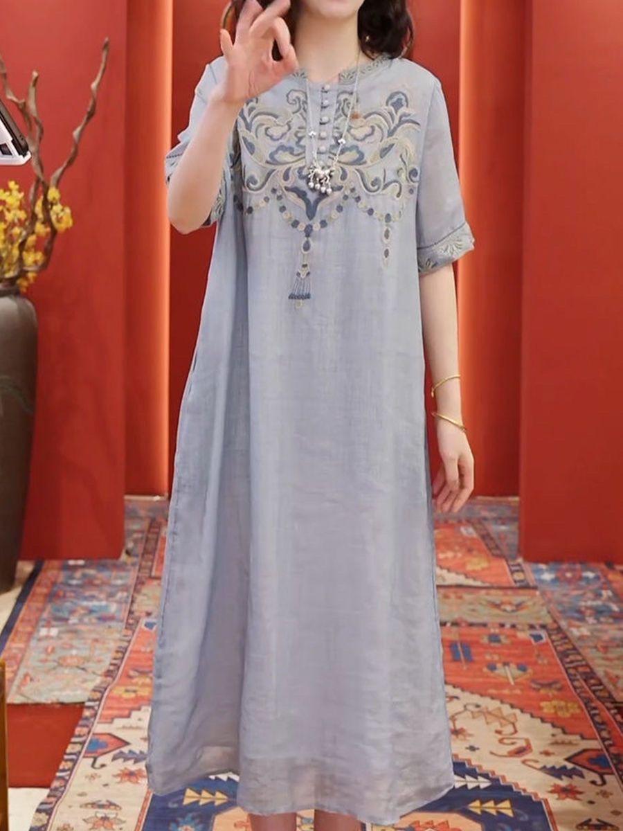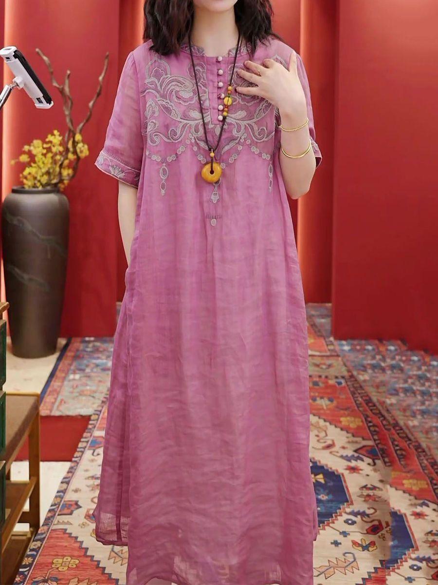Vestido Primavera/Verano 2025 Algodón Lino Bordado Pesado Nuevo Estilo Cubre Vientre Suelto Adelgazante Talla Grande Moda Falda Temperamento Mujer