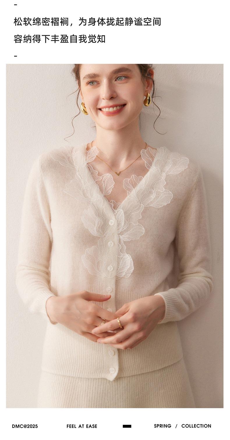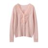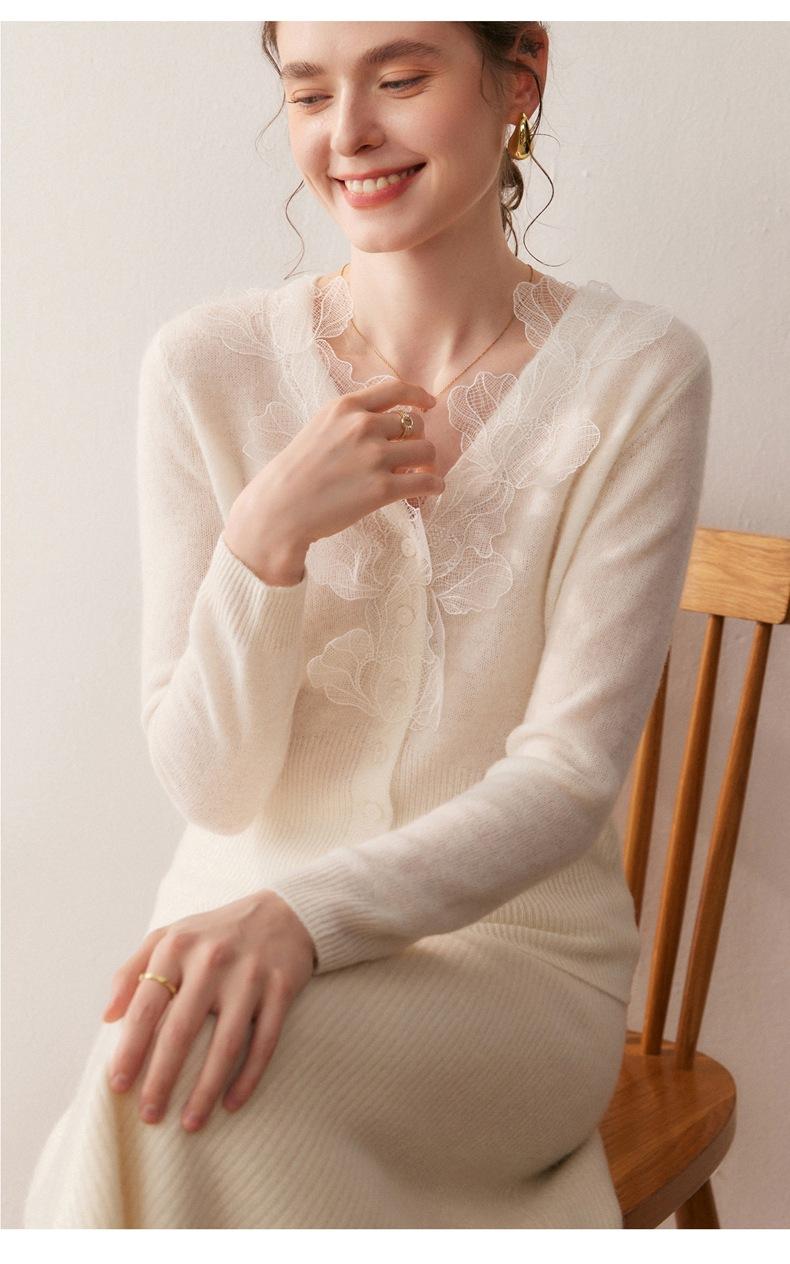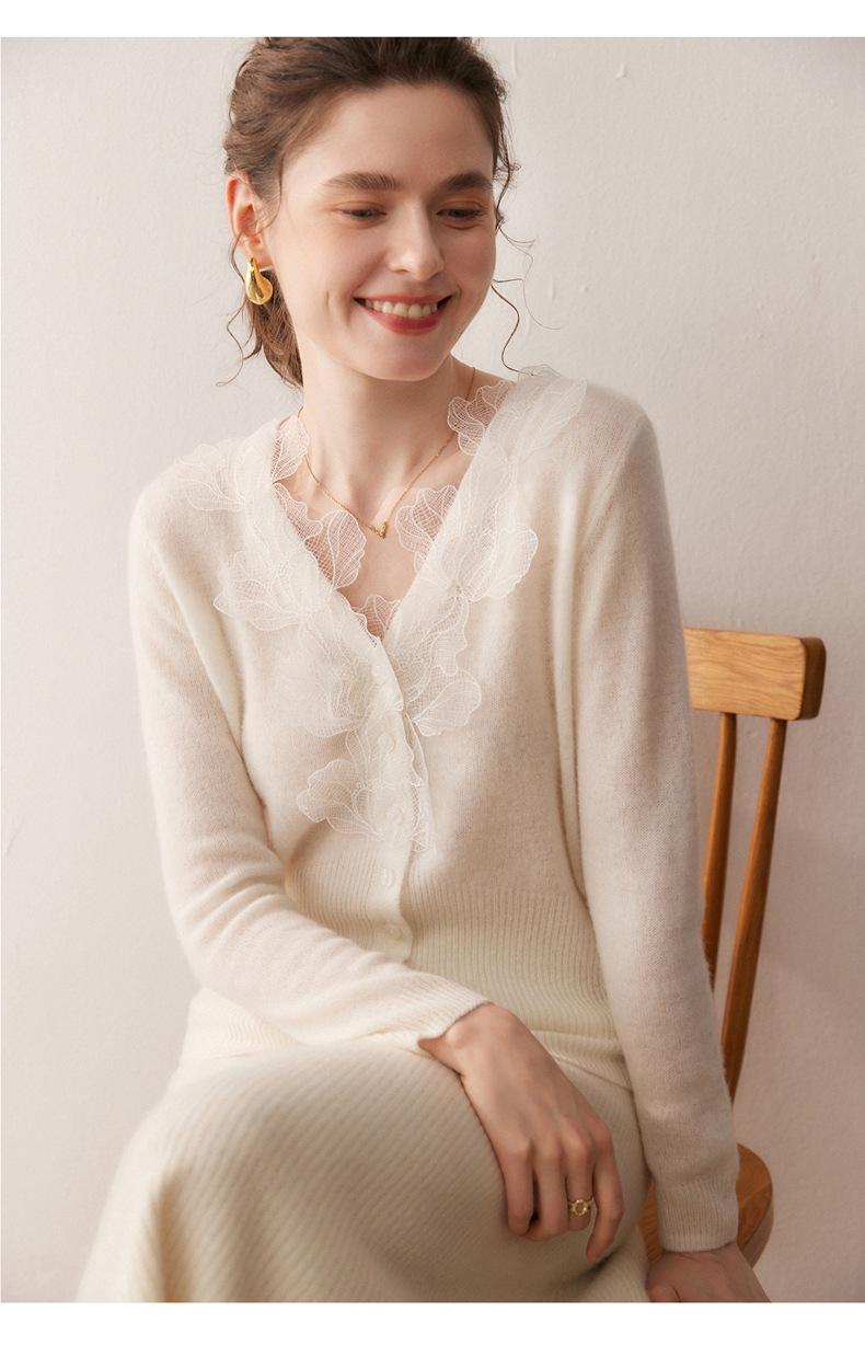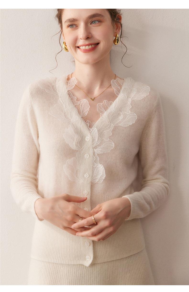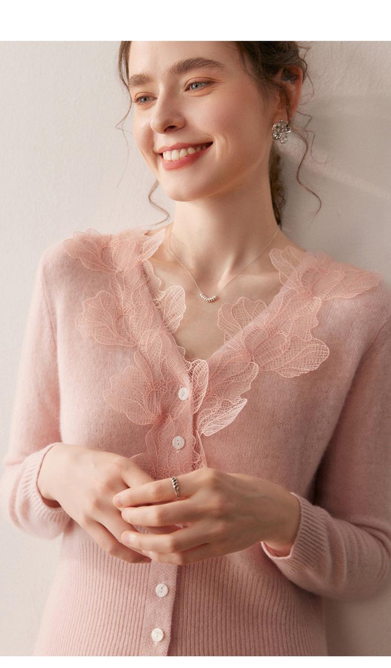 Cárdigan de Punto de Cachemira para Mujer de Encaje de Color Sólido Retro Francés Holgado Adelgazante Moda Versátil Top Suéter Ropa Exterior