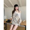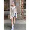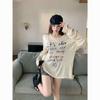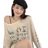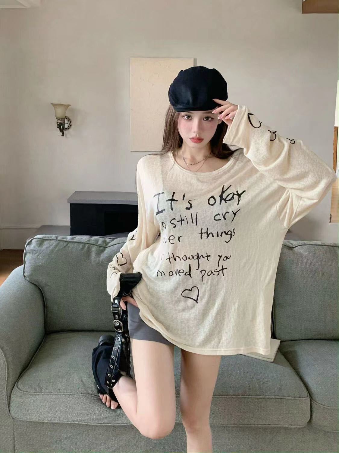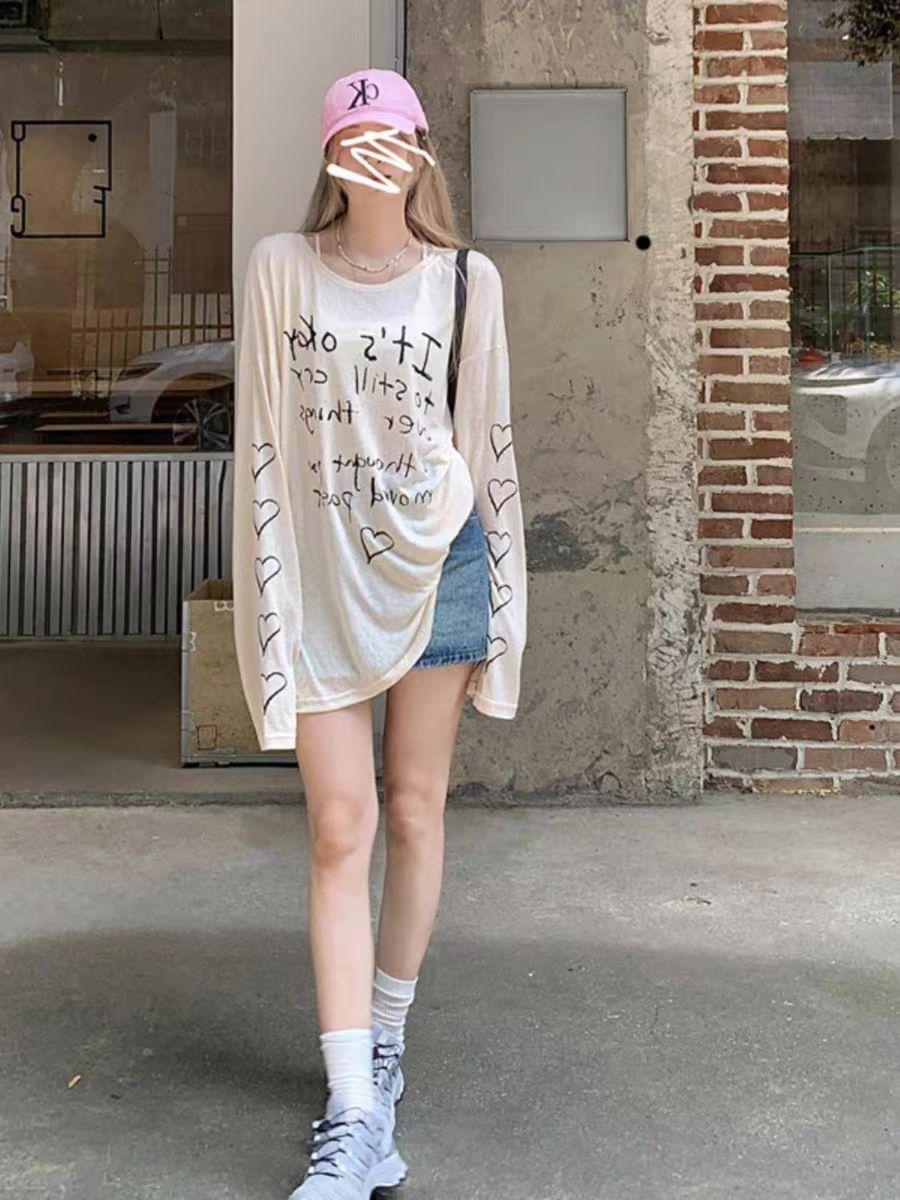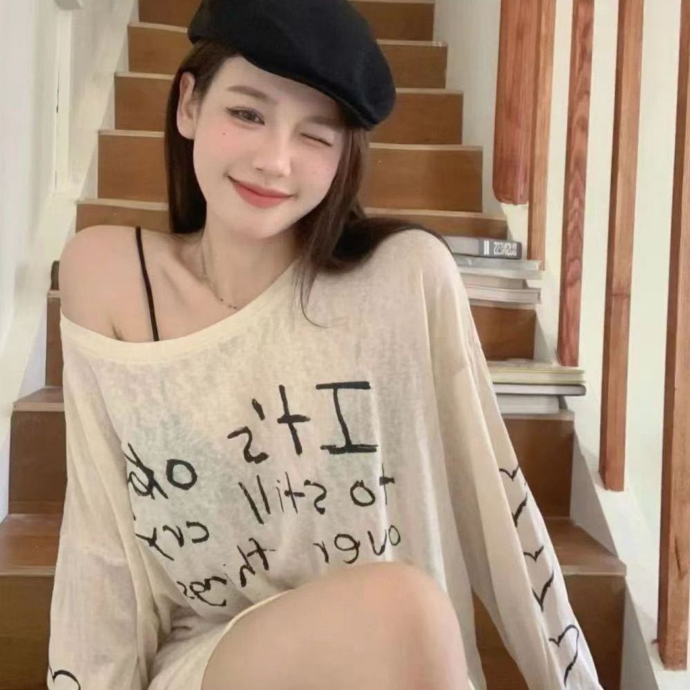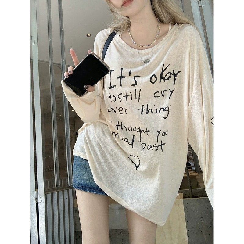 Camiseta de Manga Larga con Estampado de Letras Retro Americano para Mujer, Estilo Holgazán de Otoño, Delgada, Suelta, Tipo Cárdigan para Aire Acondicionado