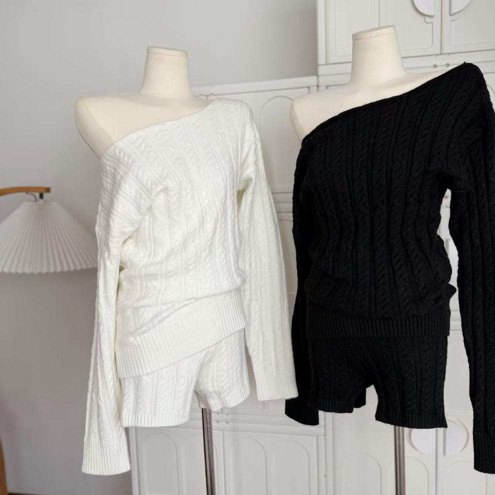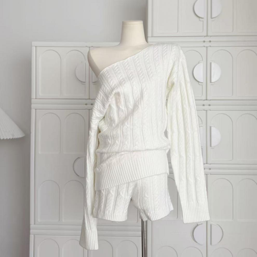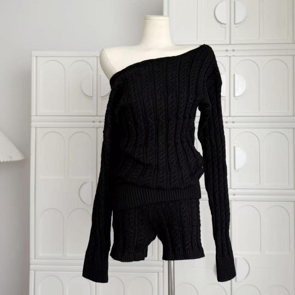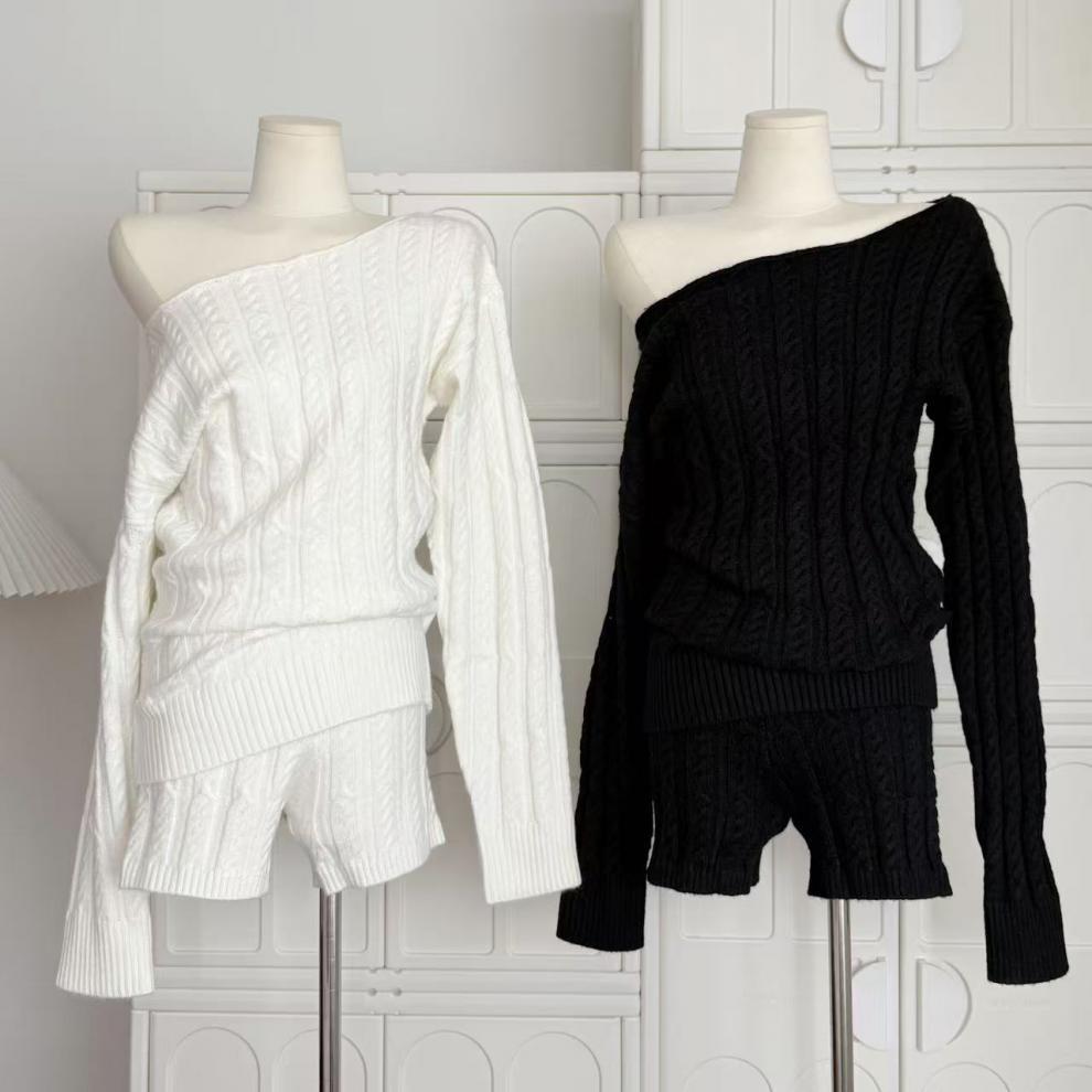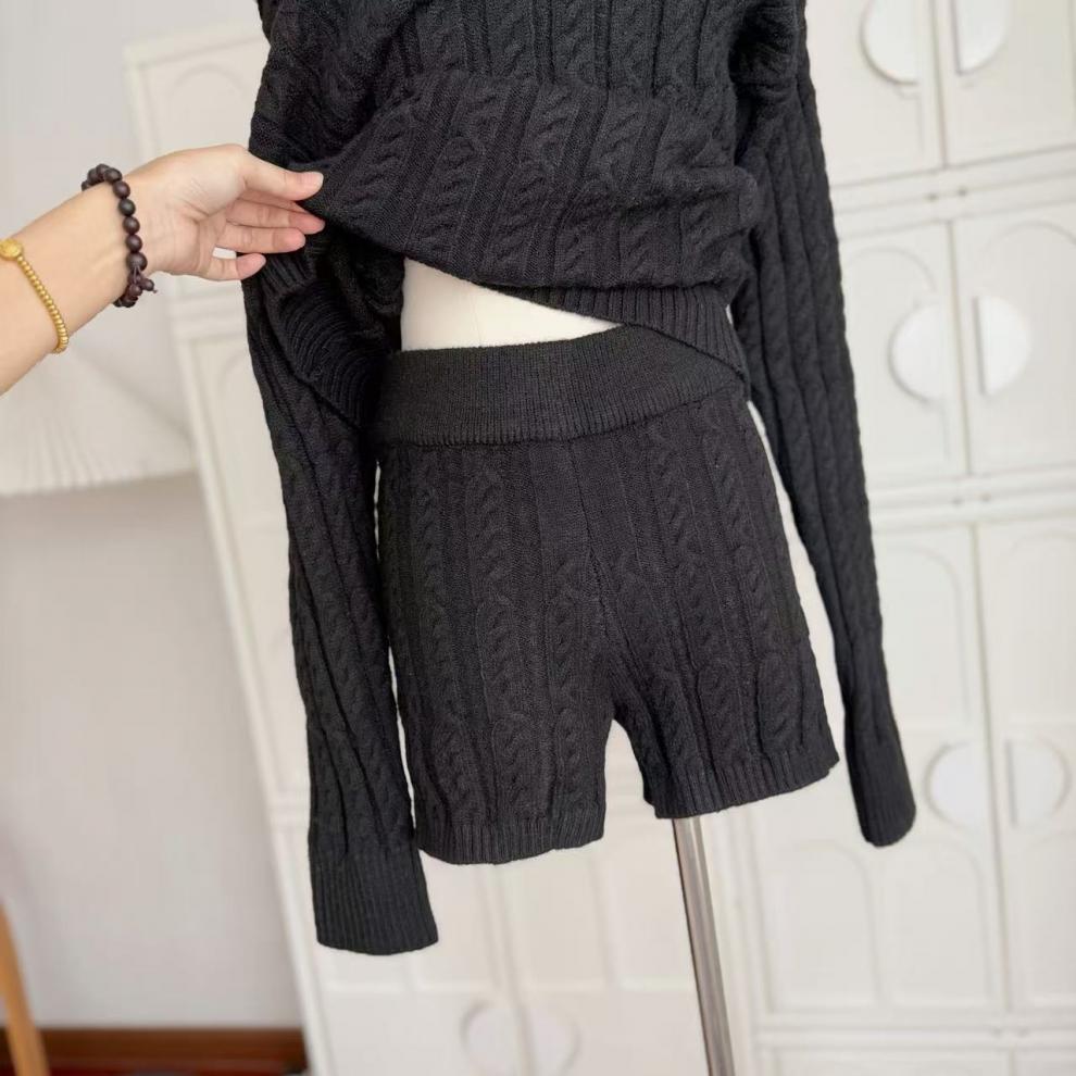 Conjunto de atuendo fresco y atrevido suéter de punto de cable de un hombro otoño 2025 nuevos shorts de punto