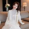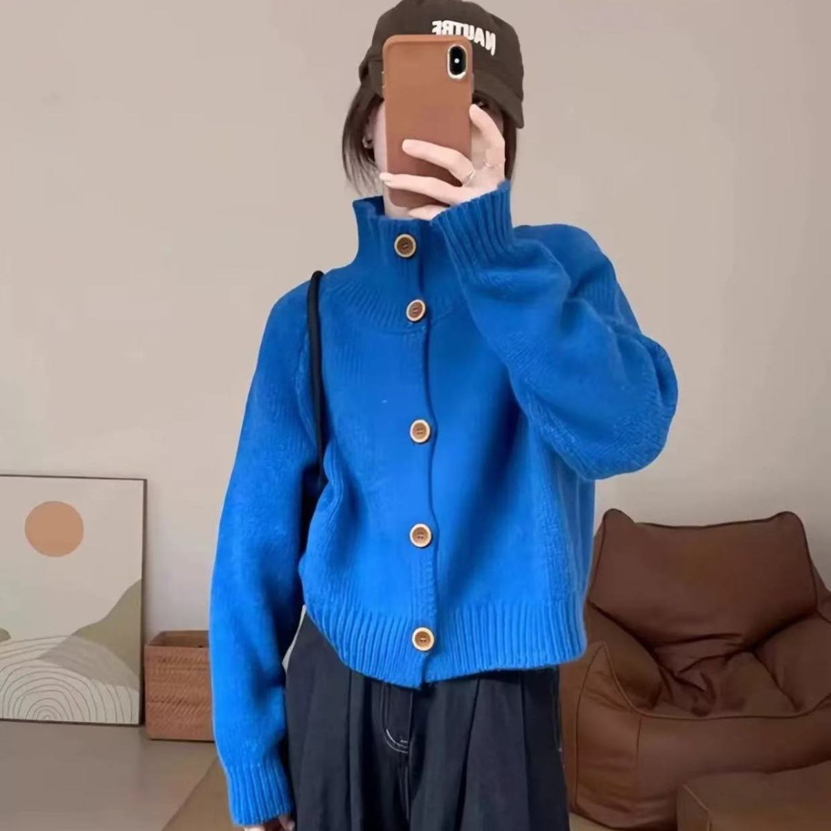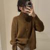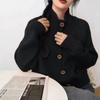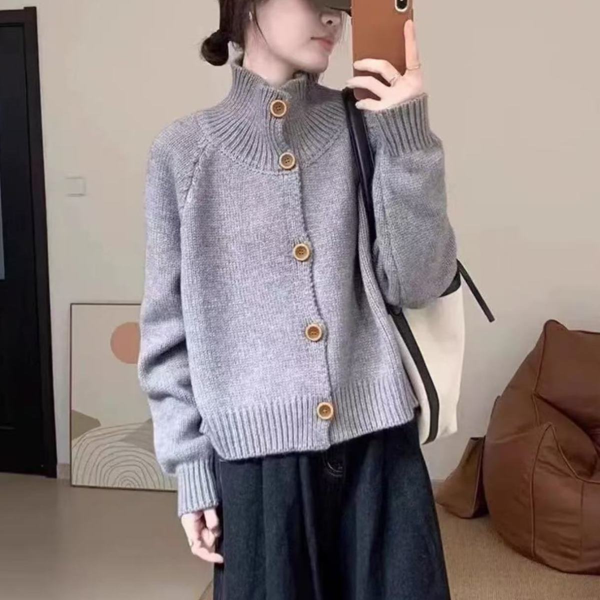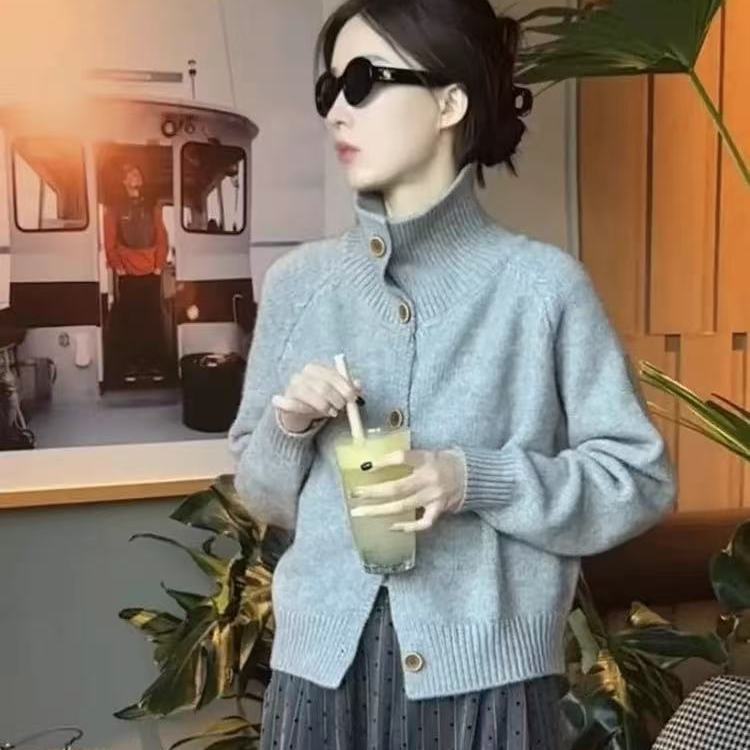 2025 Otoño/Invierno Caliente Cárdigan Suéter de Punto Retro Coreano Marrón Hebilla Cuello Alto Petite de Alta Gama