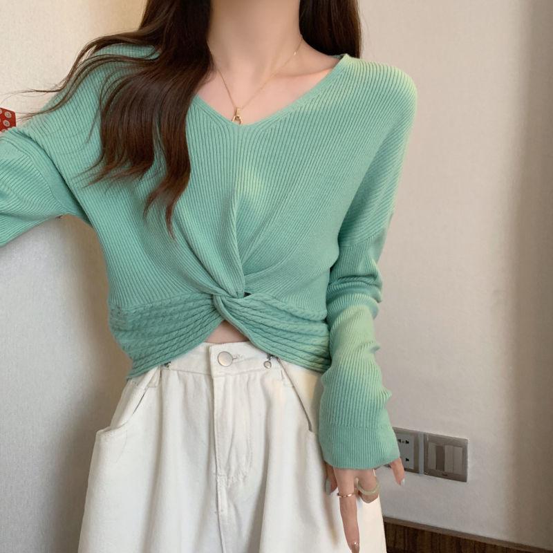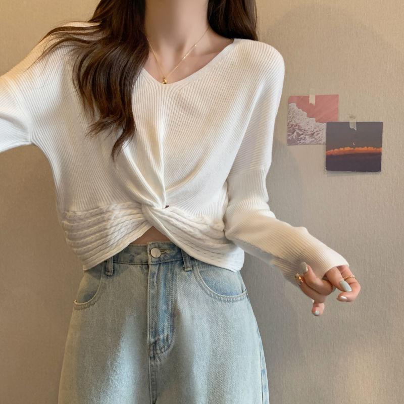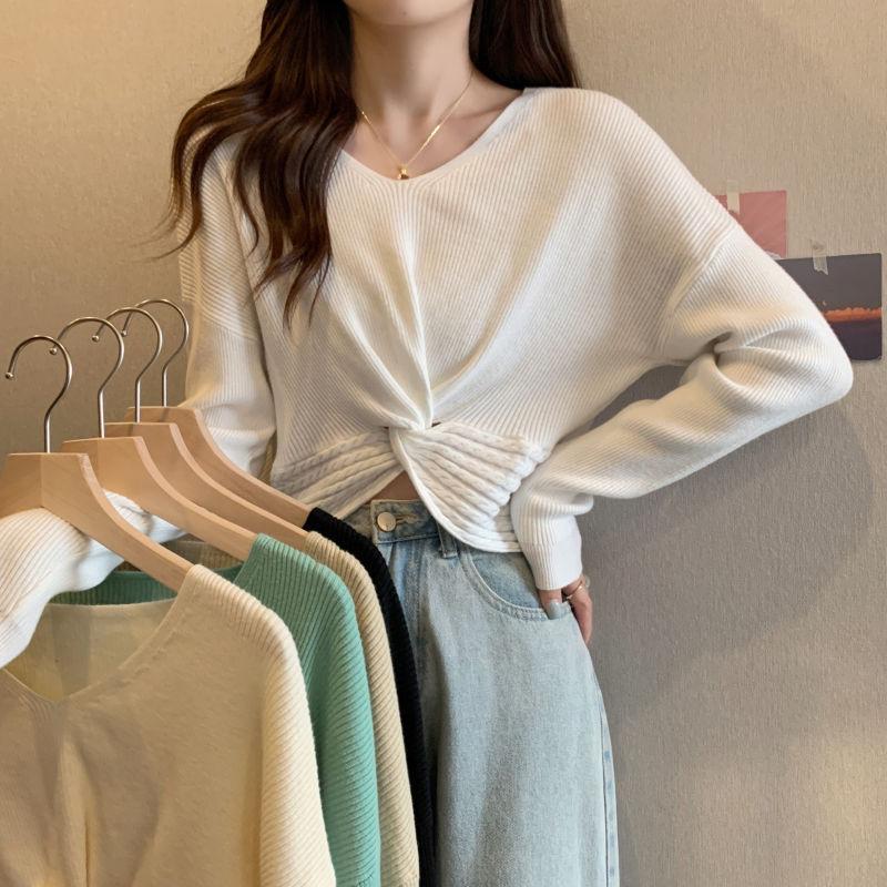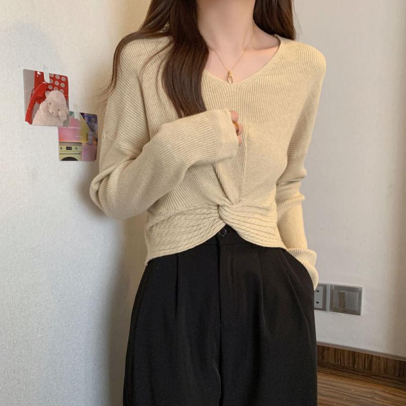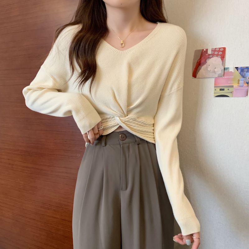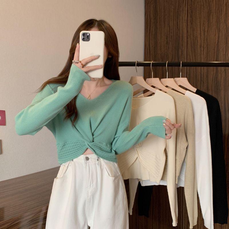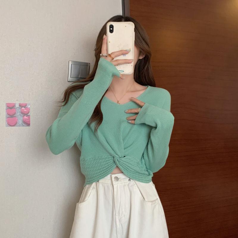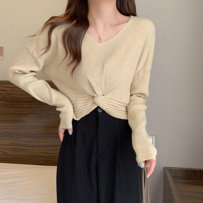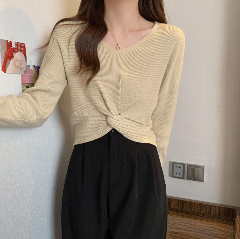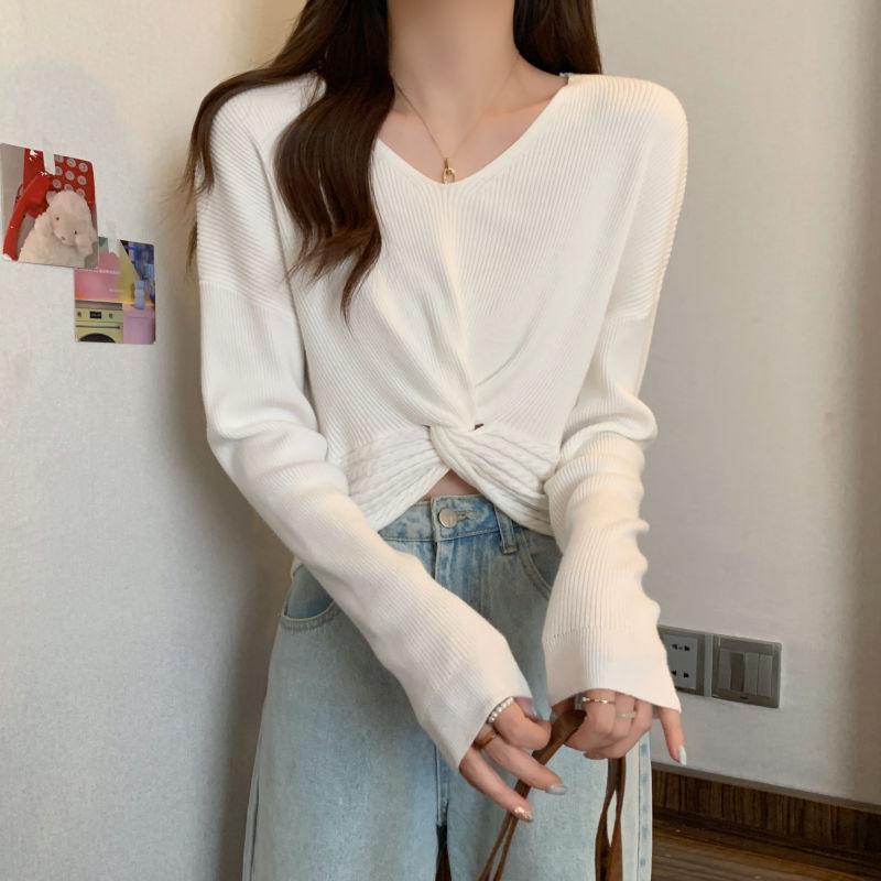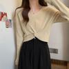 Suéter de punto de manga larga con cuello en V retorcido con sentido del diseño para mujer, camisa básica de moda de otoño, ropa interior, top corto chic de hombro recto