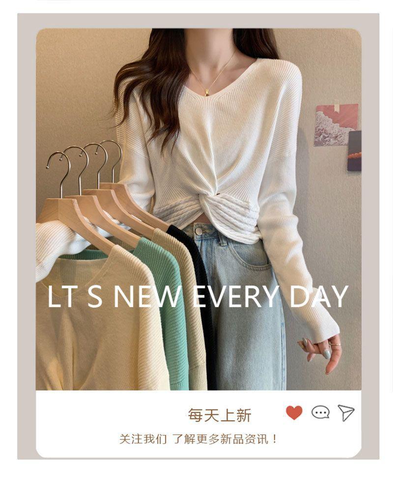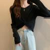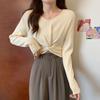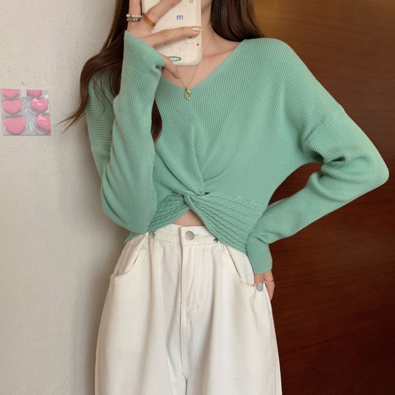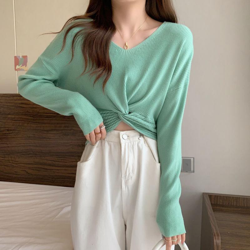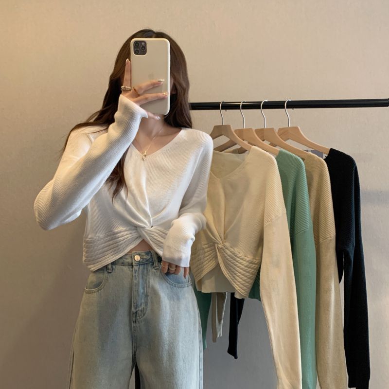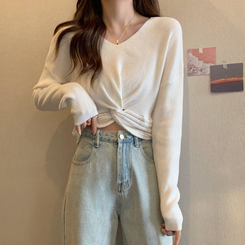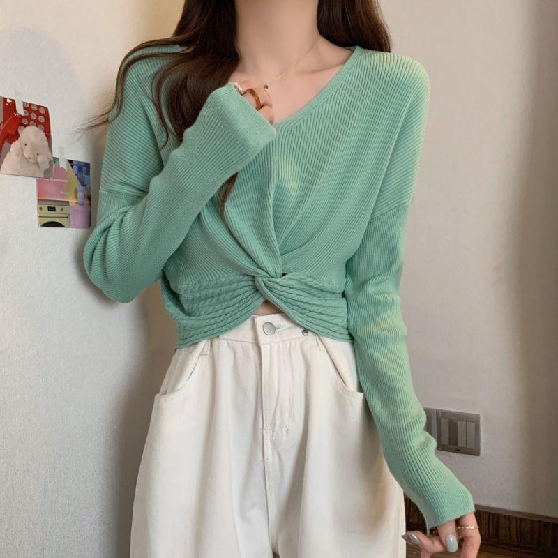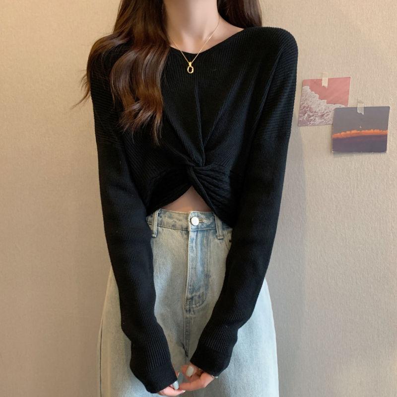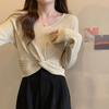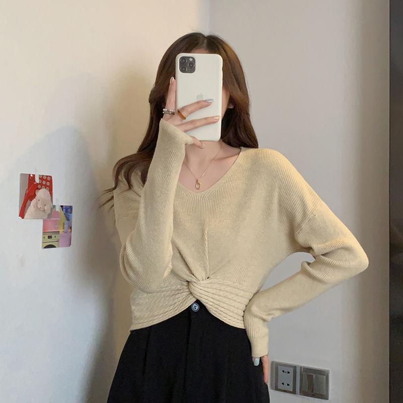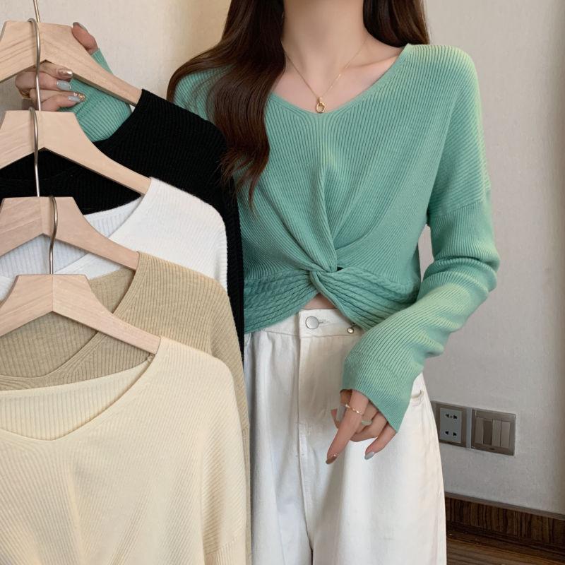 Suéter de punto de manga larga con cuello en V retorcido con sentido del diseño para mujer, camisa básica de moda de otoño, ropa interior, top corto chic de hombro recto