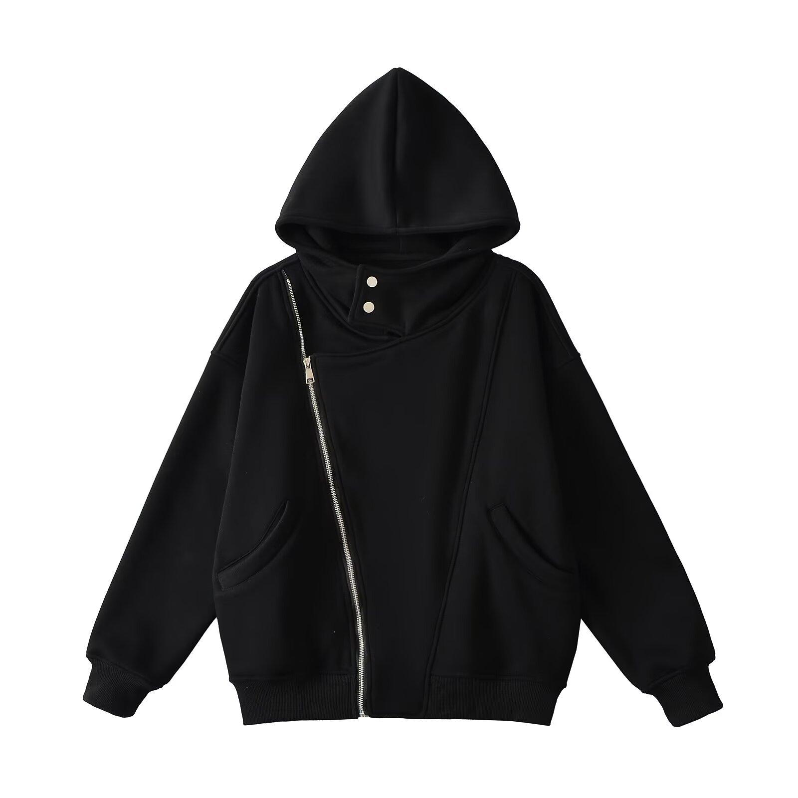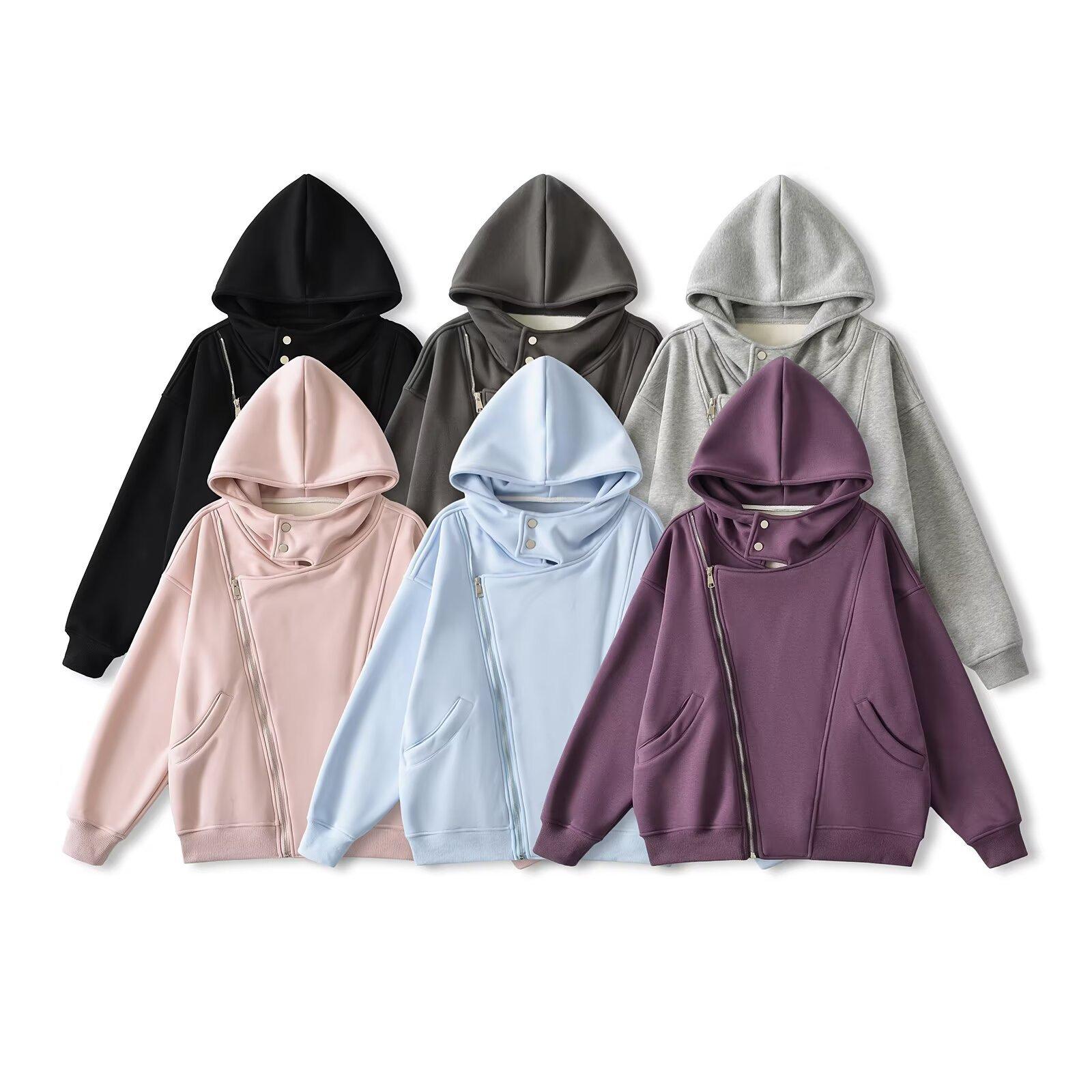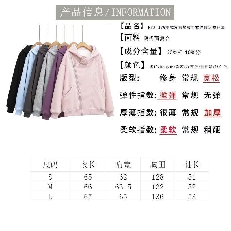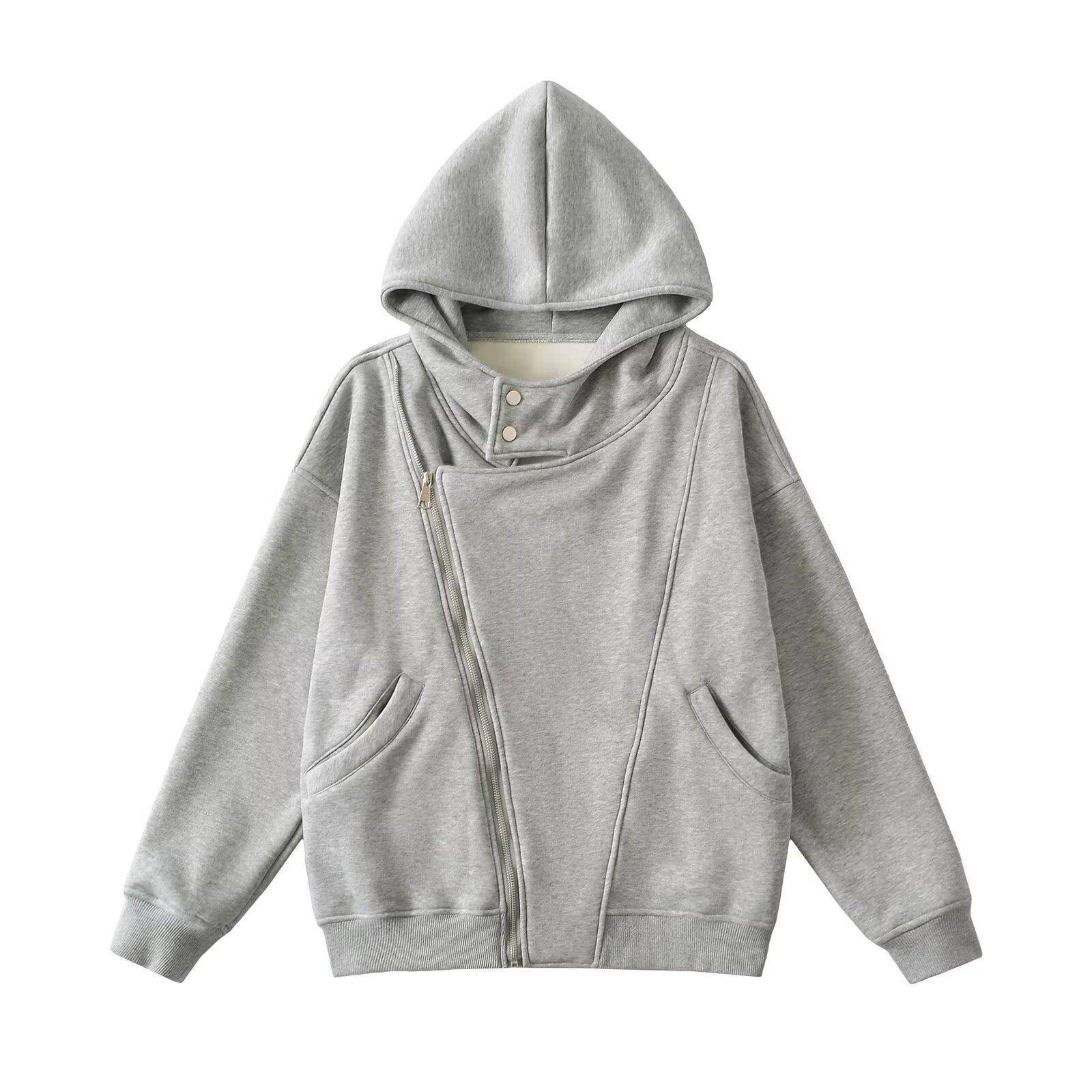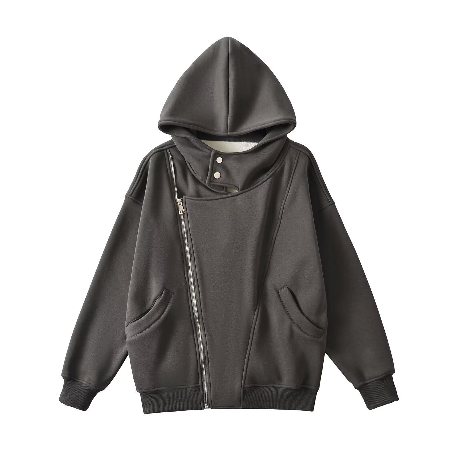 Estilo Americano Estilo Perezoso Cremallera Inclinada con Capucha Forrado de Fleece Cálido Suéter Chaqueta Otoño e Invierno Sentido del Diseño Cárdigan Holgado Top