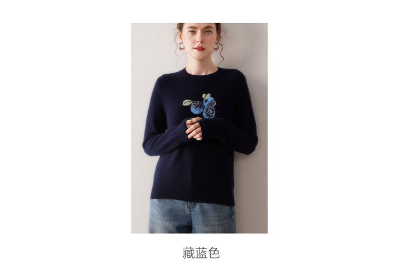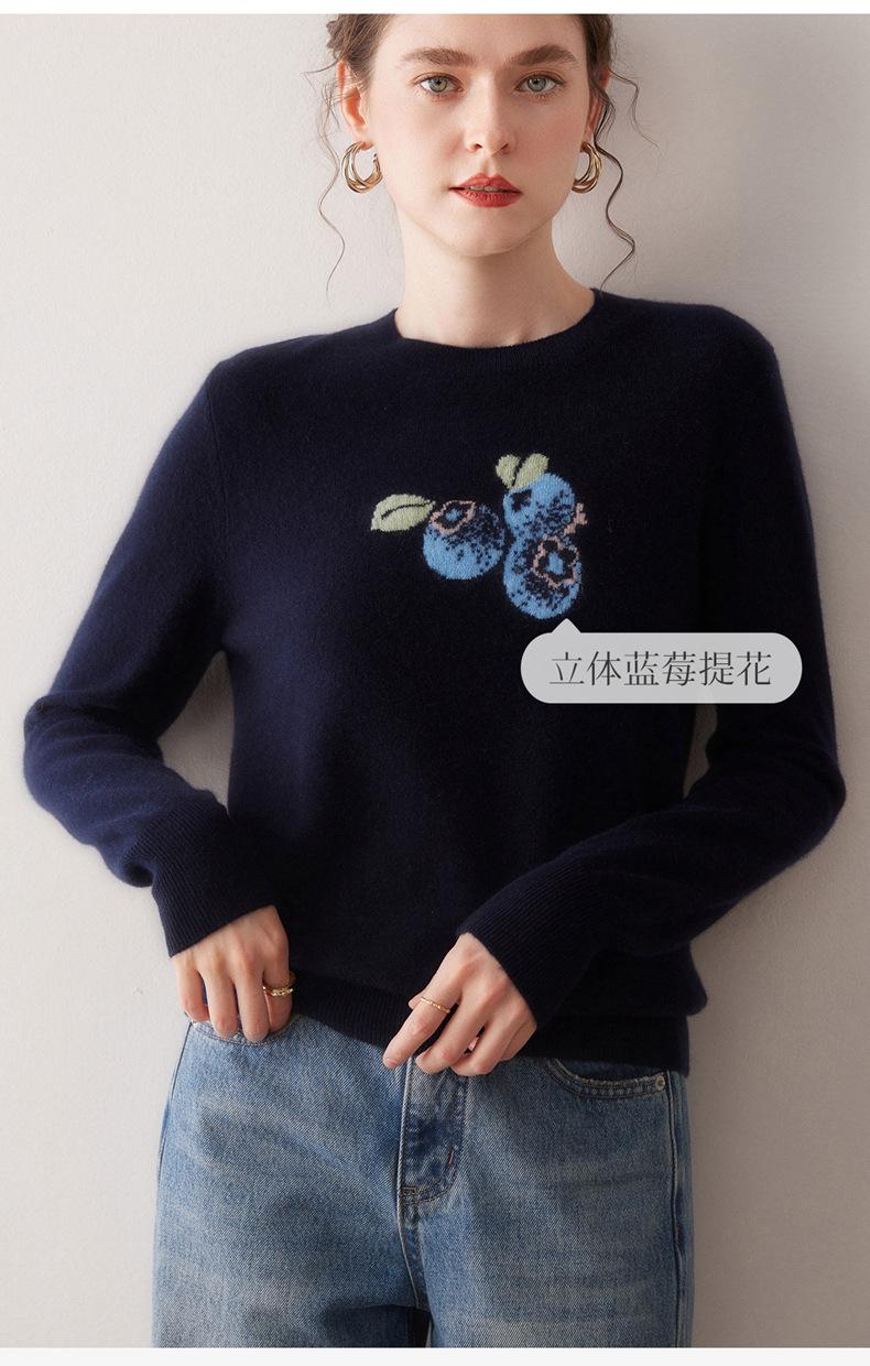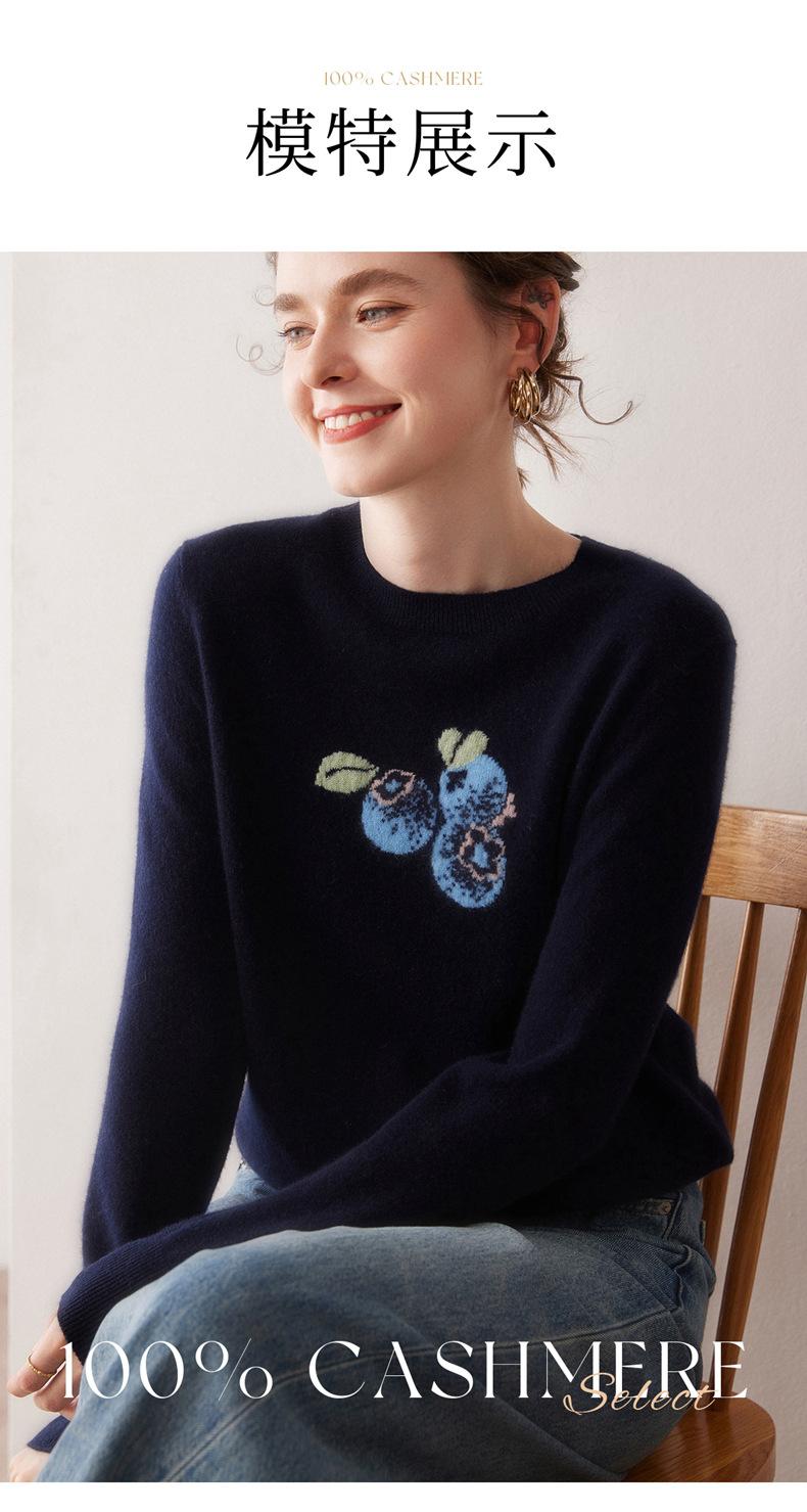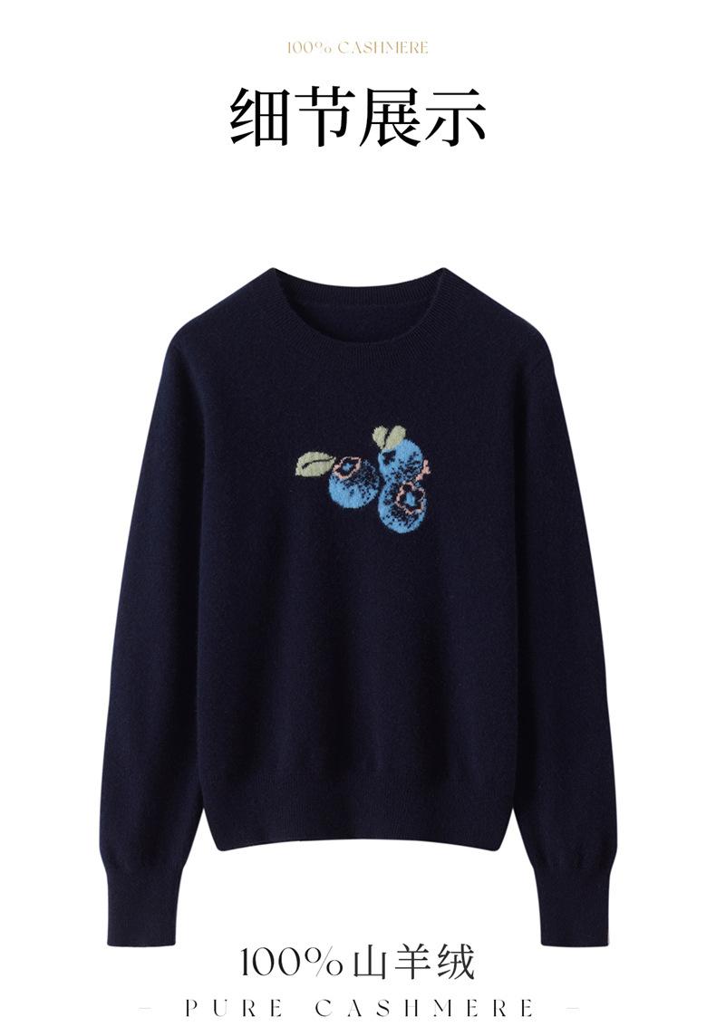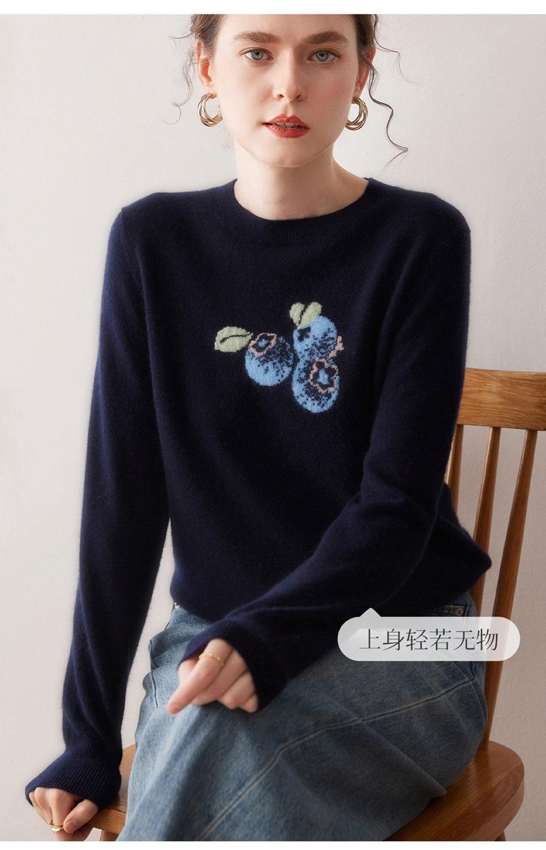 Suéter de Cachemira Mujer 100% Cachemira Pura Otoño e Invierno Nuevo Jersey de Cuello Redondo Jacquard de Arándanos Manga Larga Tejido Suéter Básico