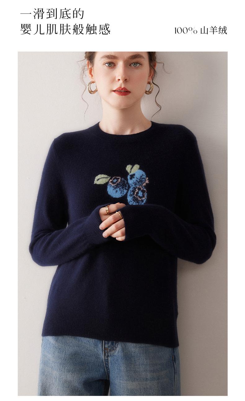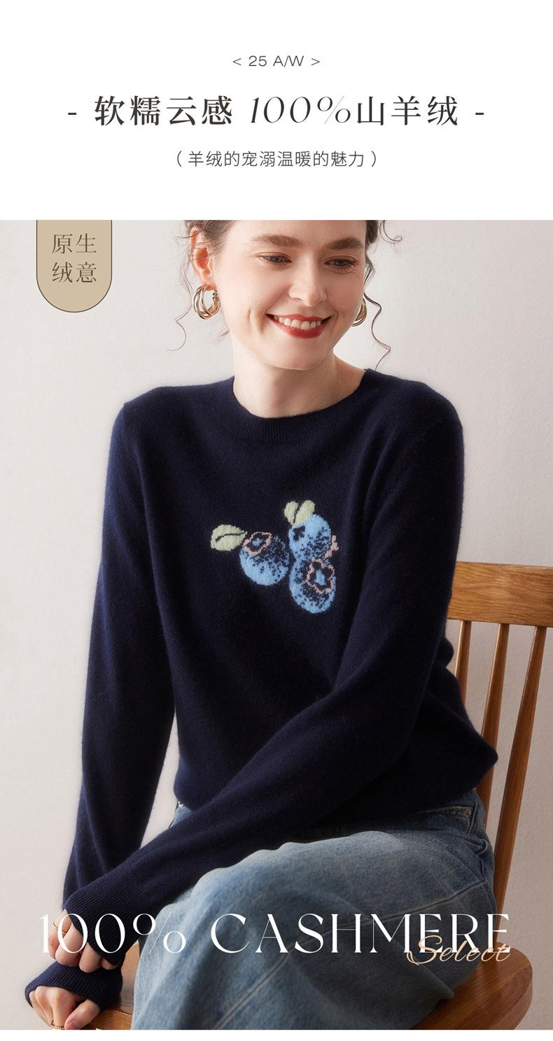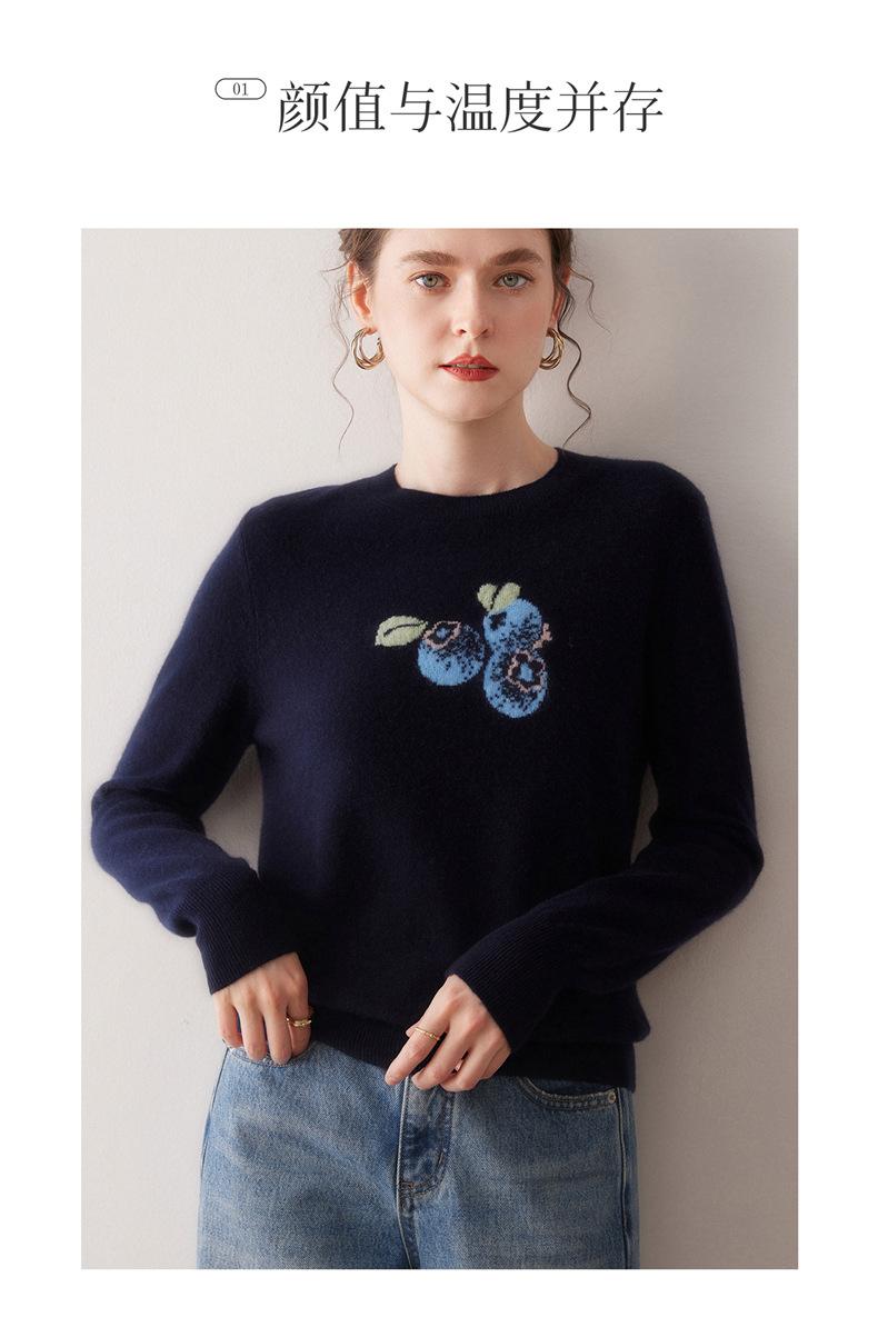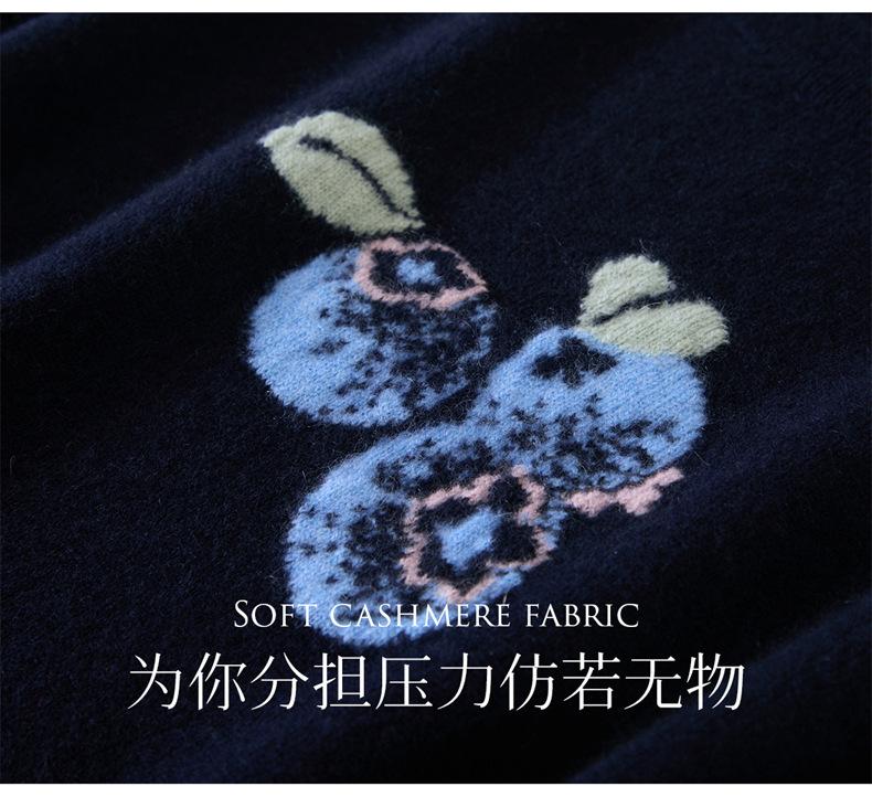 Suéter de Cachemira Mujer 100% Cachemira Pura Otoño e Invierno Nuevo Jersey de Cuello Redondo Jacquard de Arándanos Manga Larga Tejido Suéter Básico
