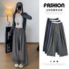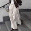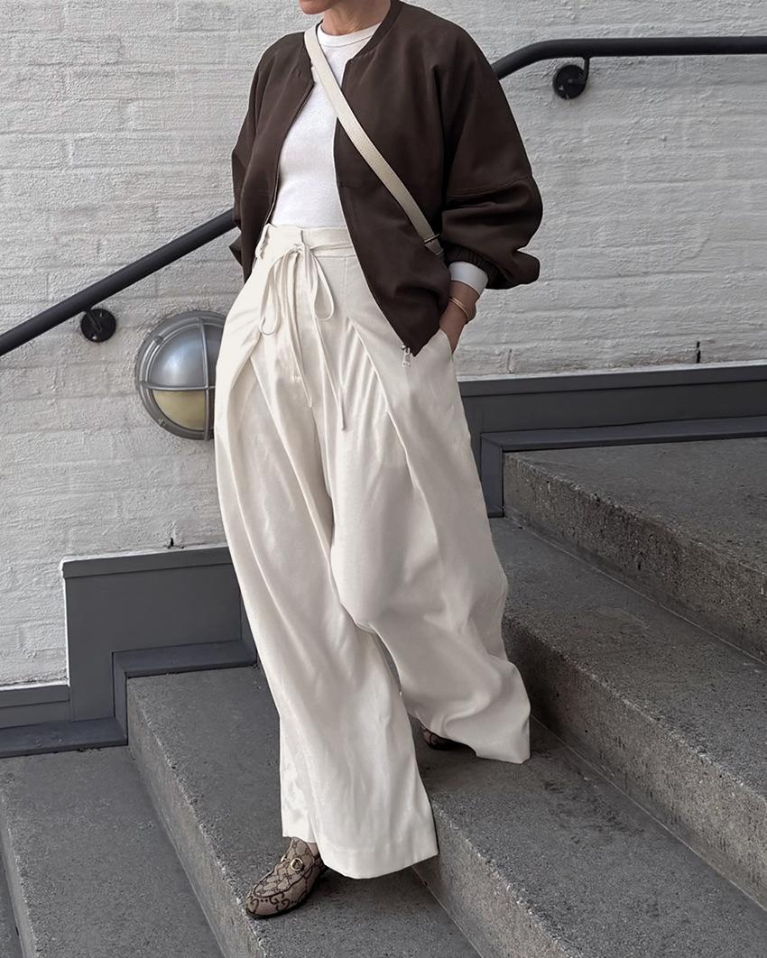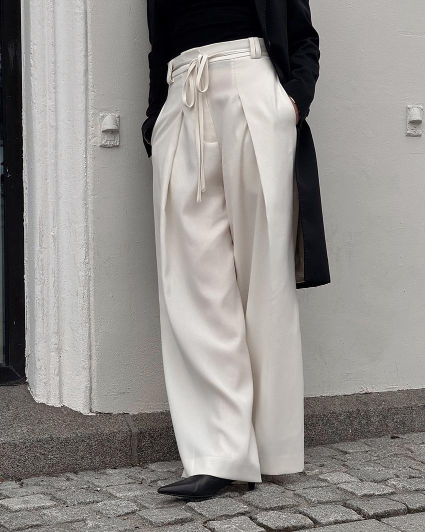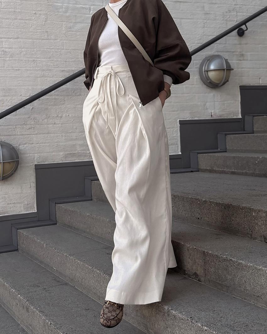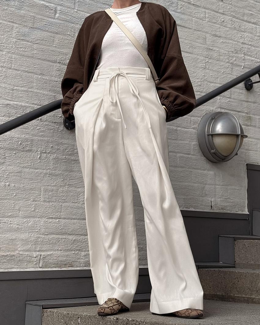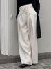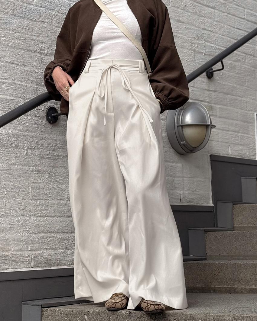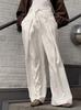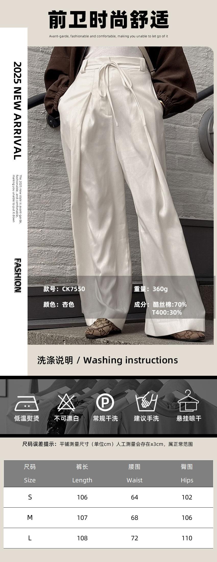 Diseño europeo y americano pantalones plisados de pierna ancha con cordón de cintura alta para mujer, otoño, modernos, versátiles, color albaricoque, pantalones de traje holgados al por mayor