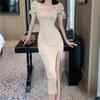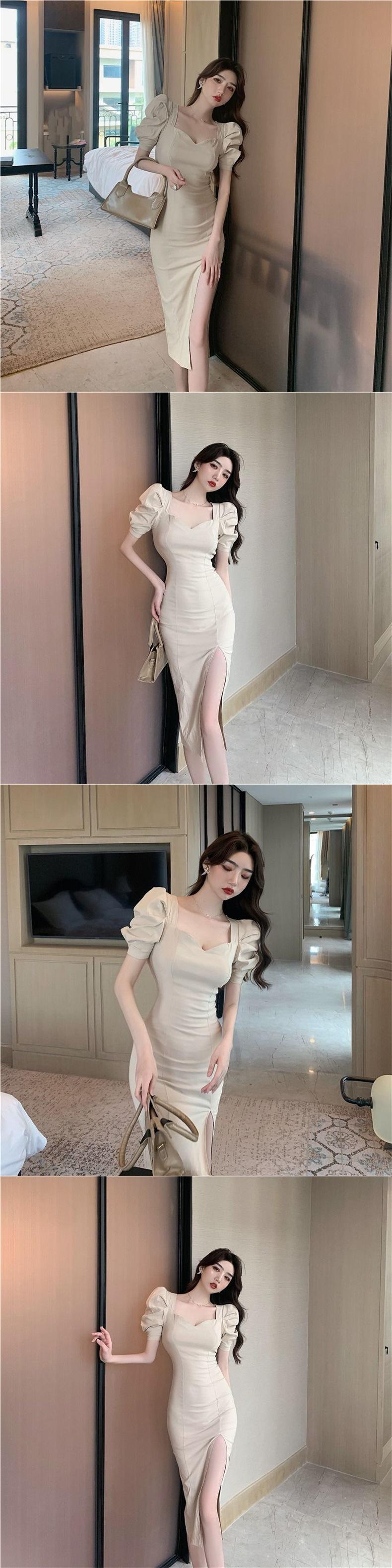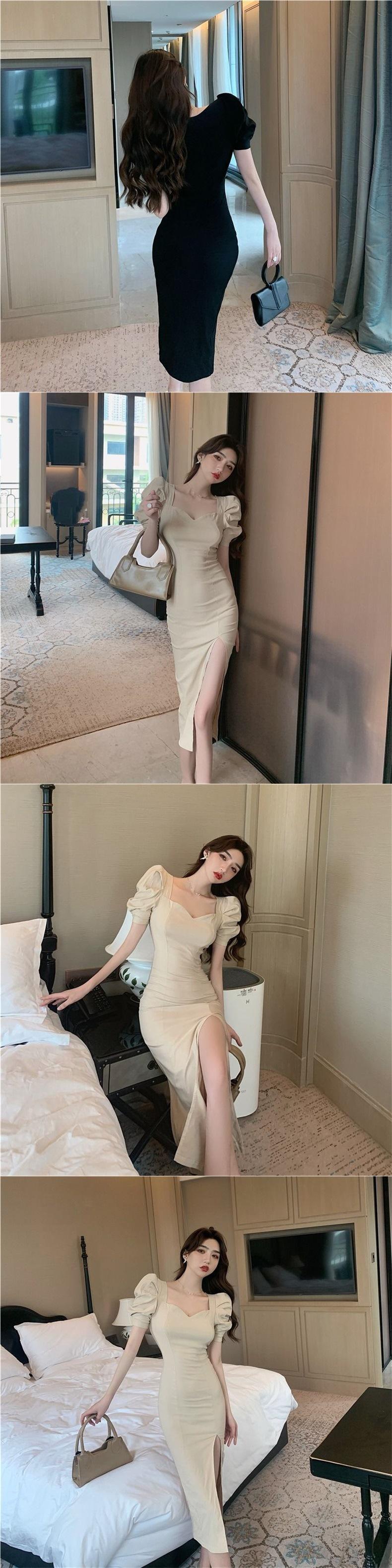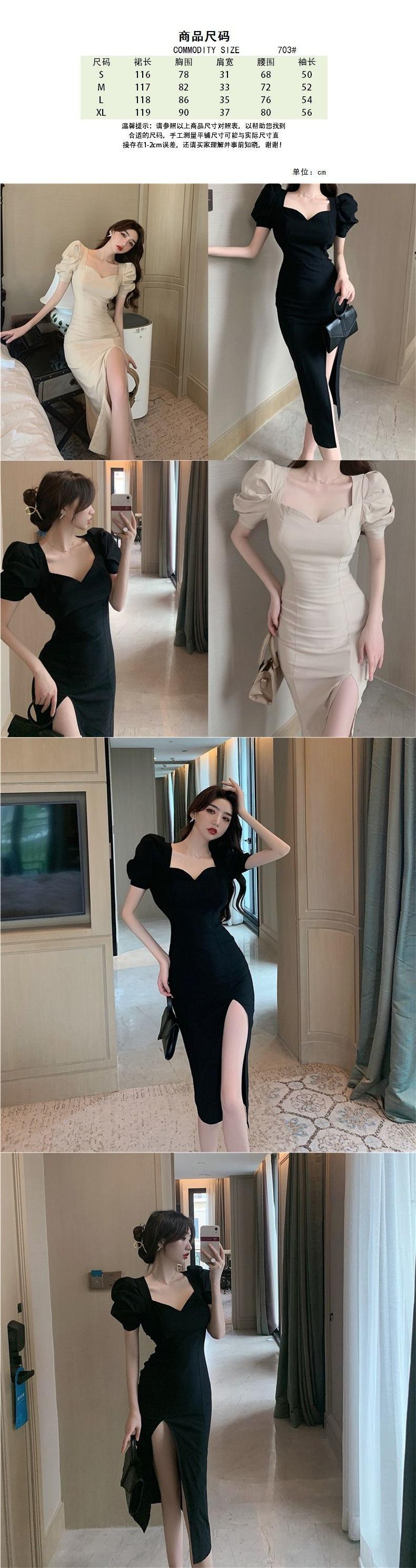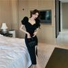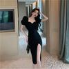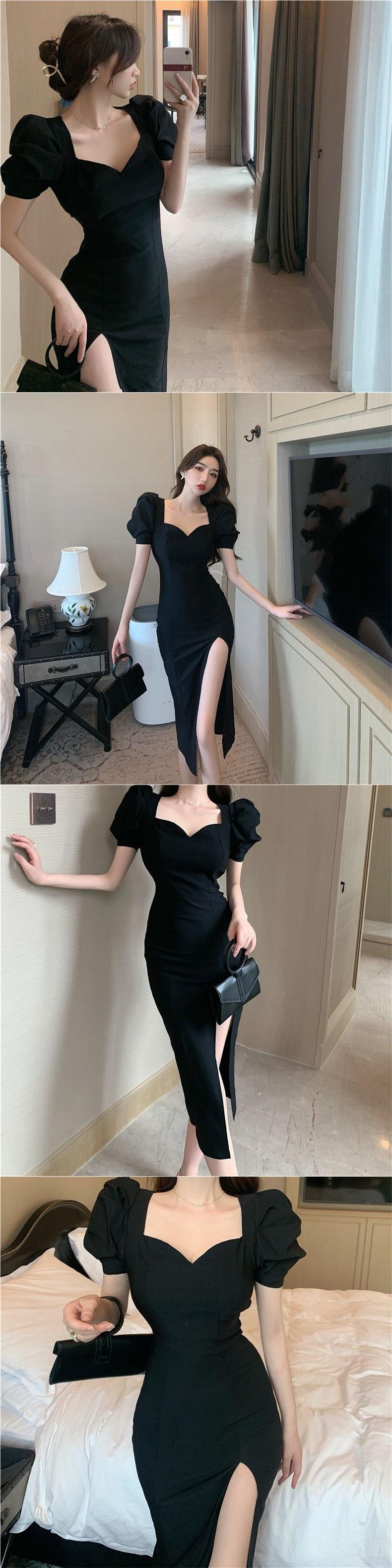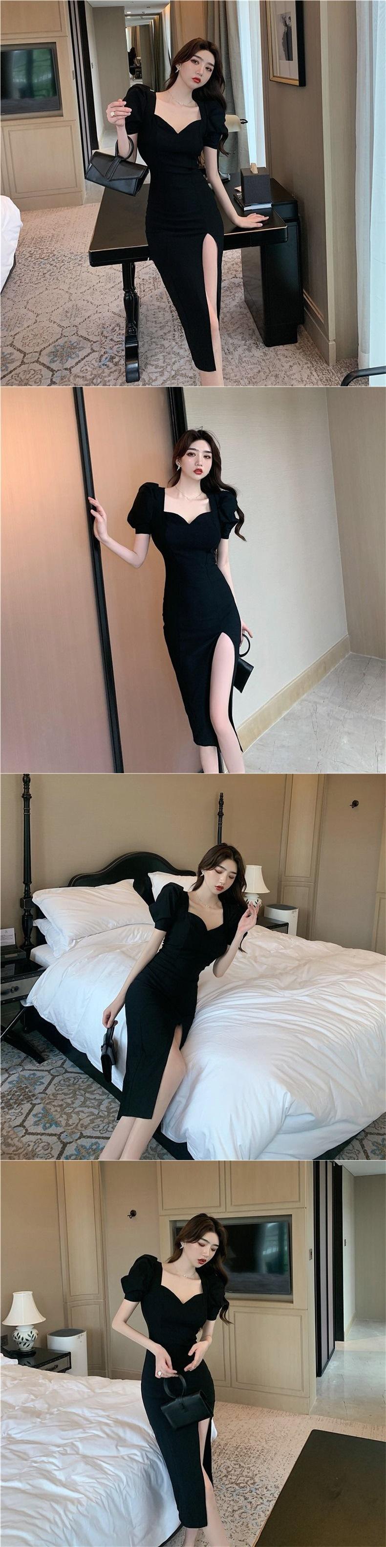 Vestido Dulce y Fresco Verano 2025 Nuevo Manga Abullonada Francesa Adelgazante Negro Falda Larga con Abertura Mujer