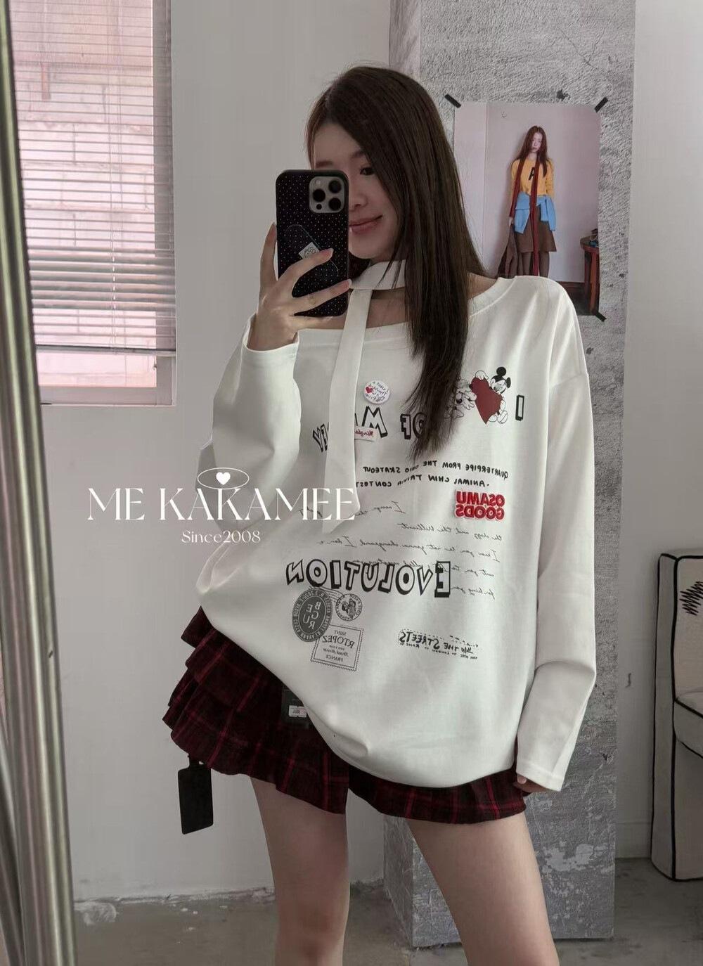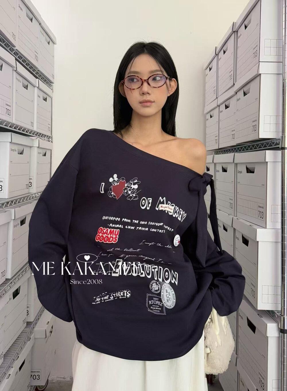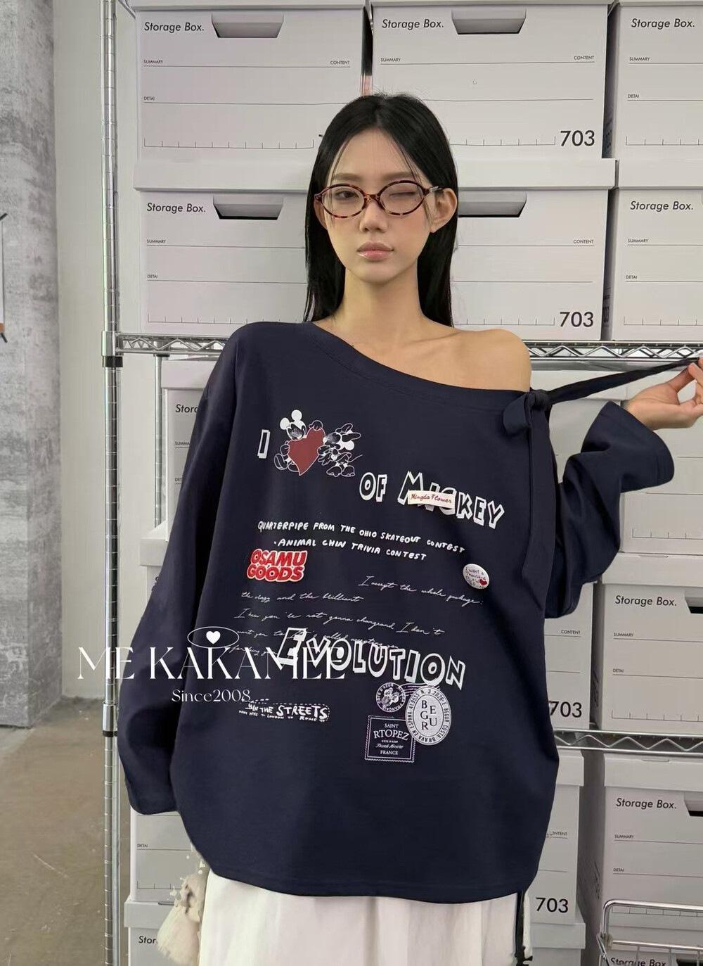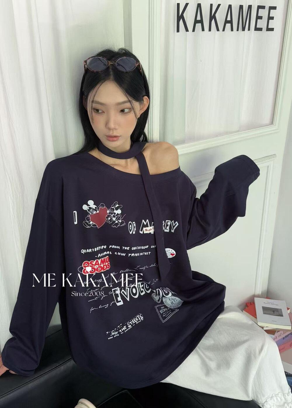 ME KAKAMEE trece líneas otoño caricatura MQ correa para el cuello hombro diagonal holgada camiseta de manga larga (con corbata) 8866