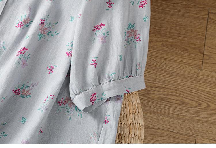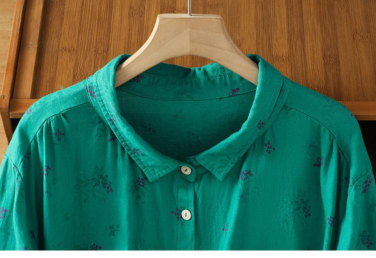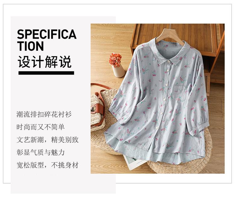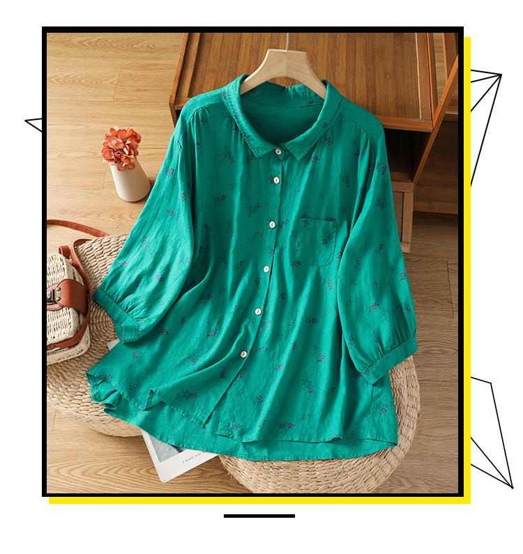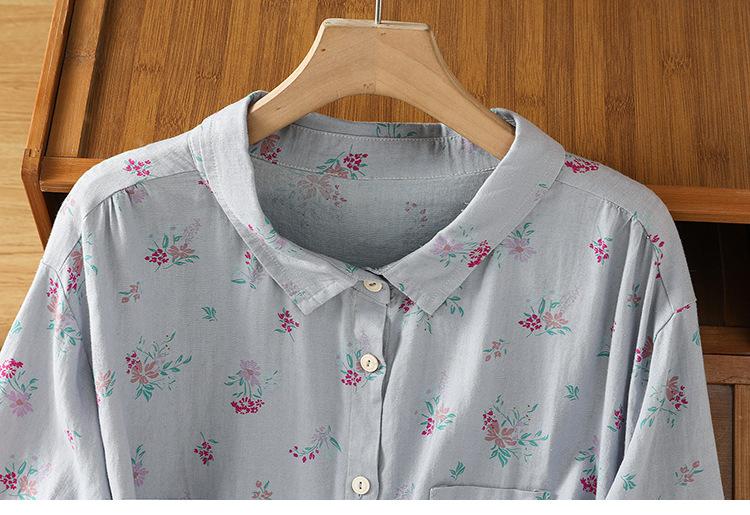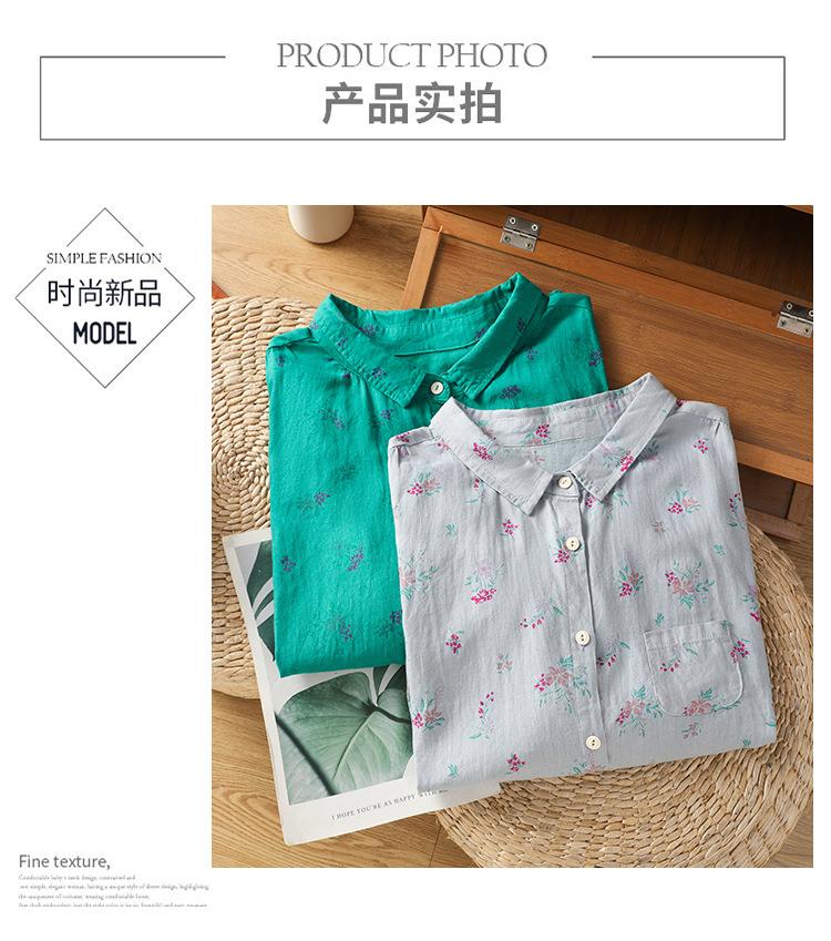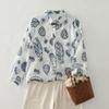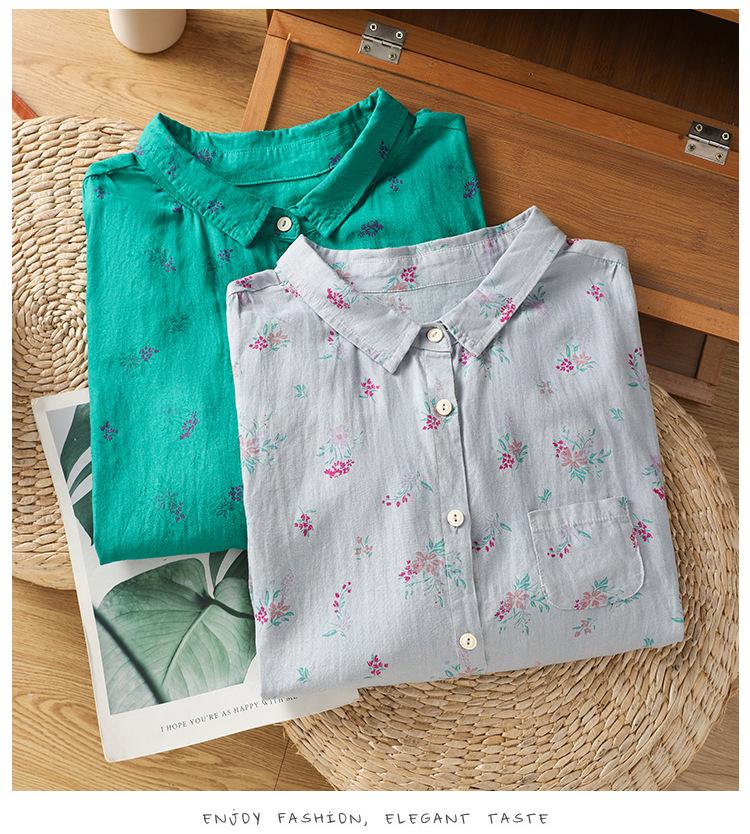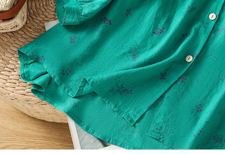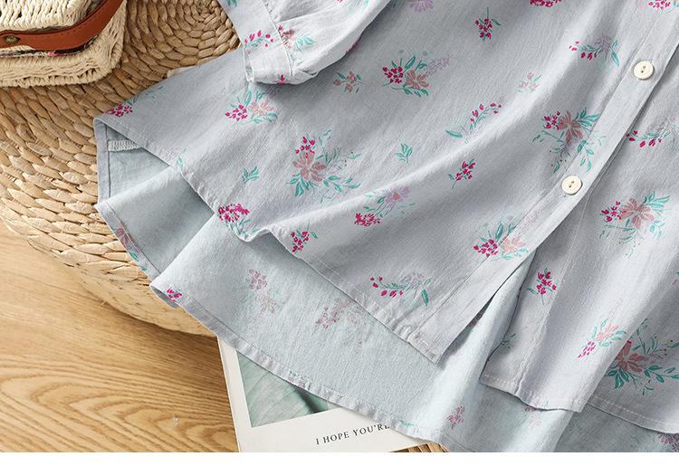 Nuevo en stock foto real estampado literario retro camisa de lino de algodón para mujer camisa con solapa temperamento delgada manga corta top mujer