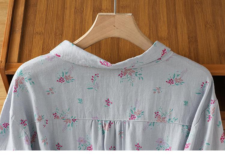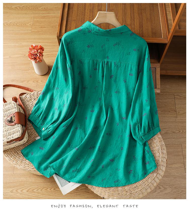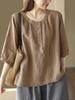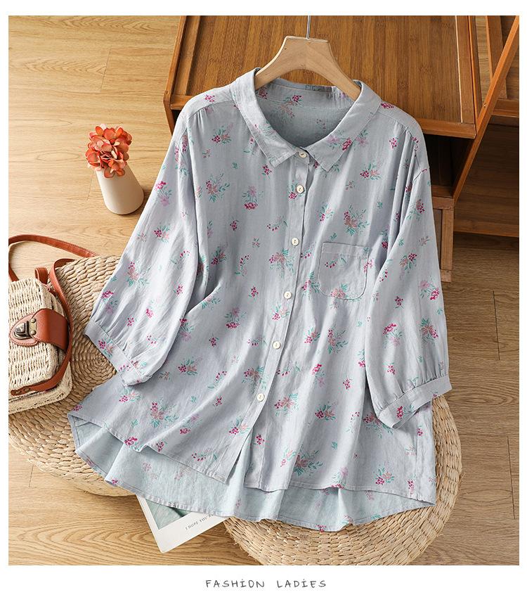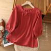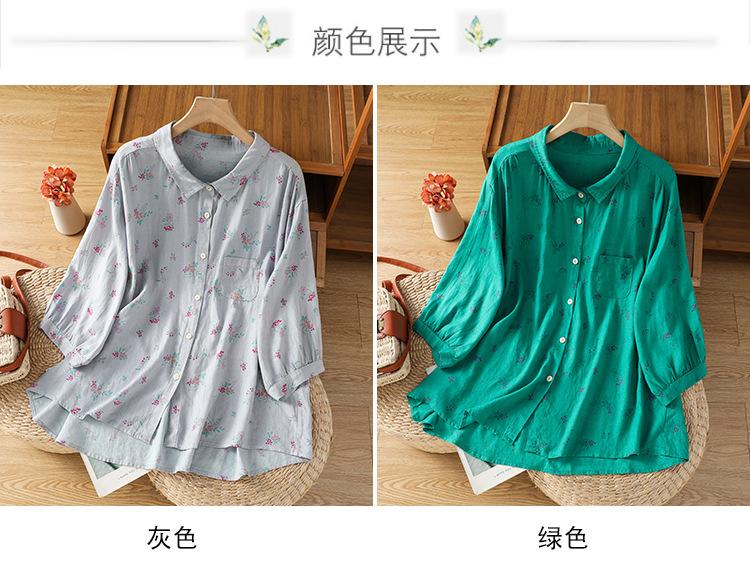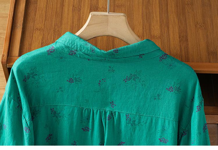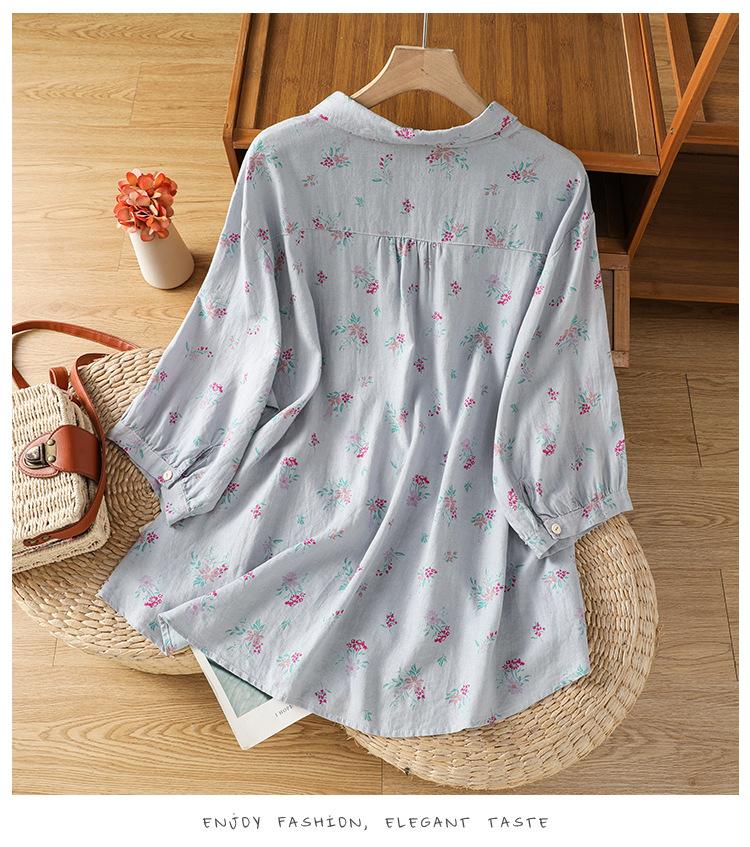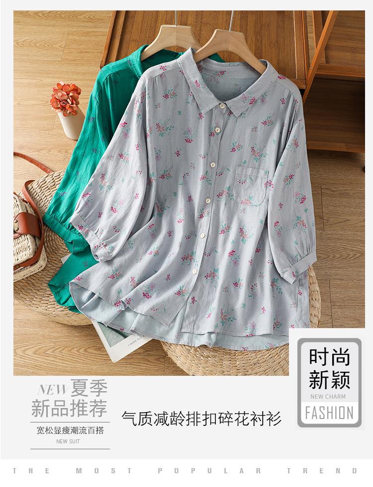 Nuevo en stock foto real estampado literario retro camisa de lino de algodón para mujer camisa con solapa temperamento delgada manga corta top mujer