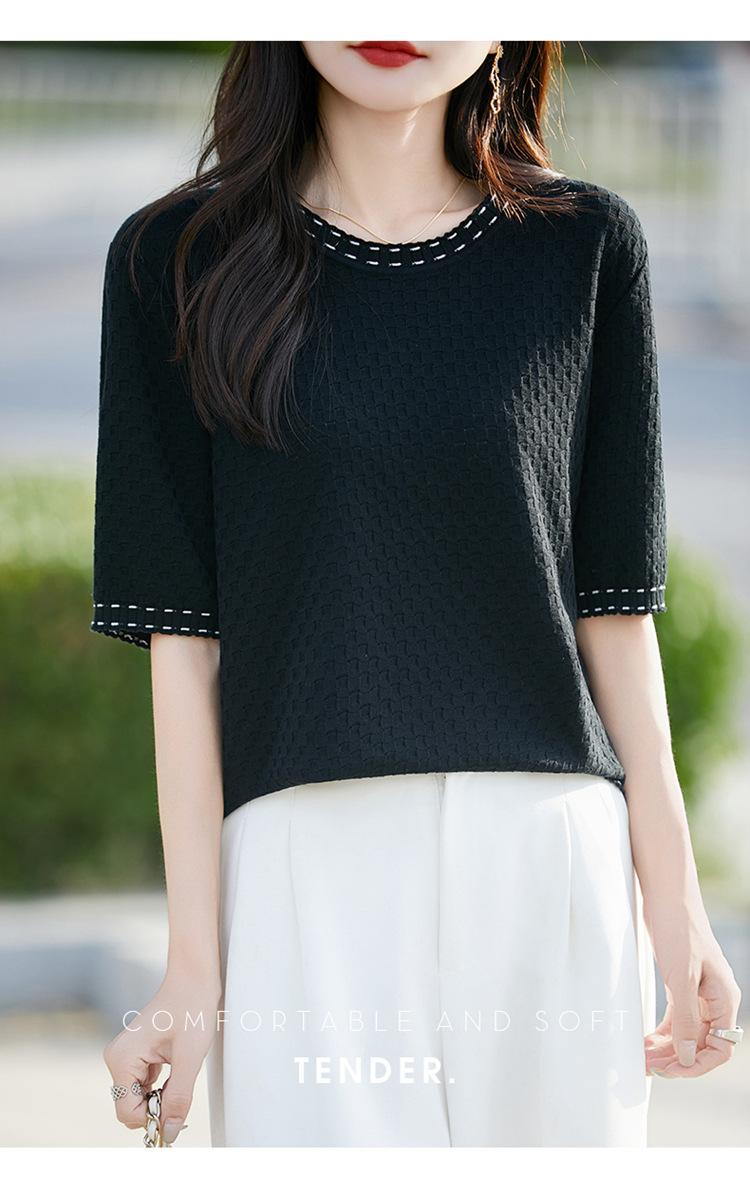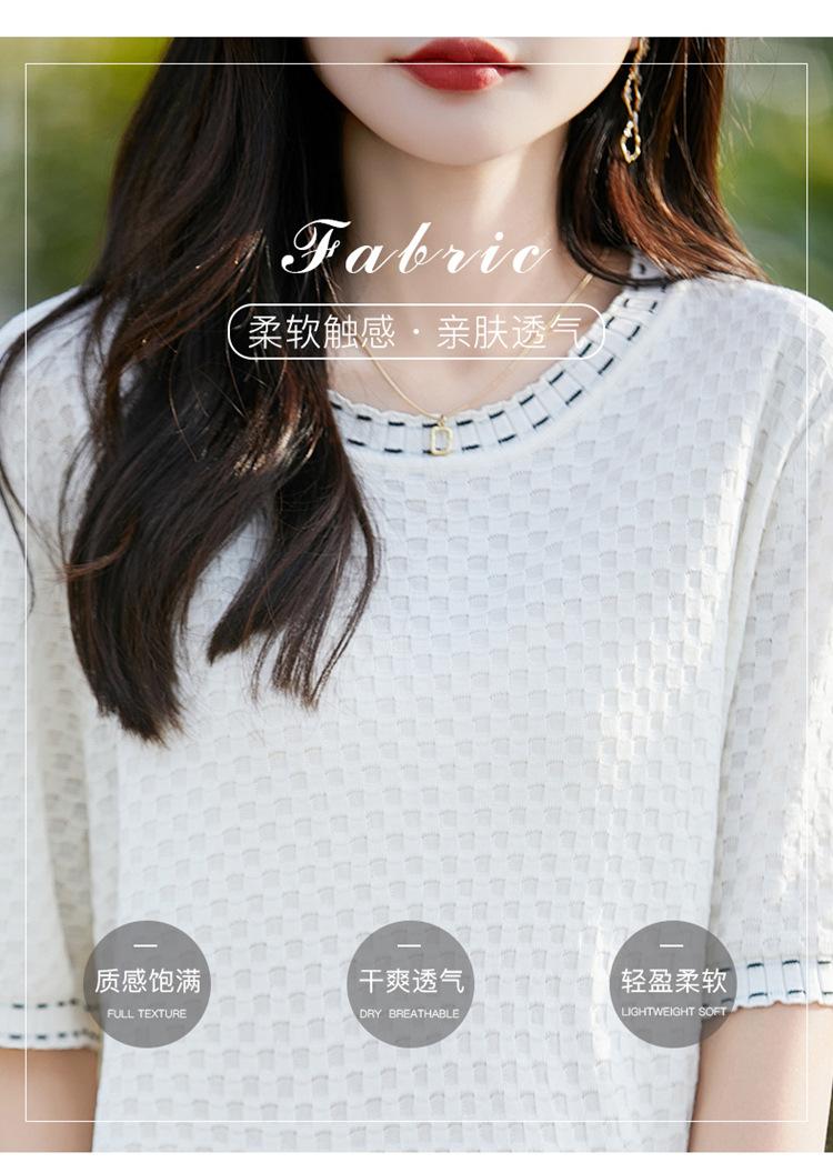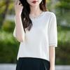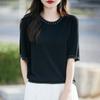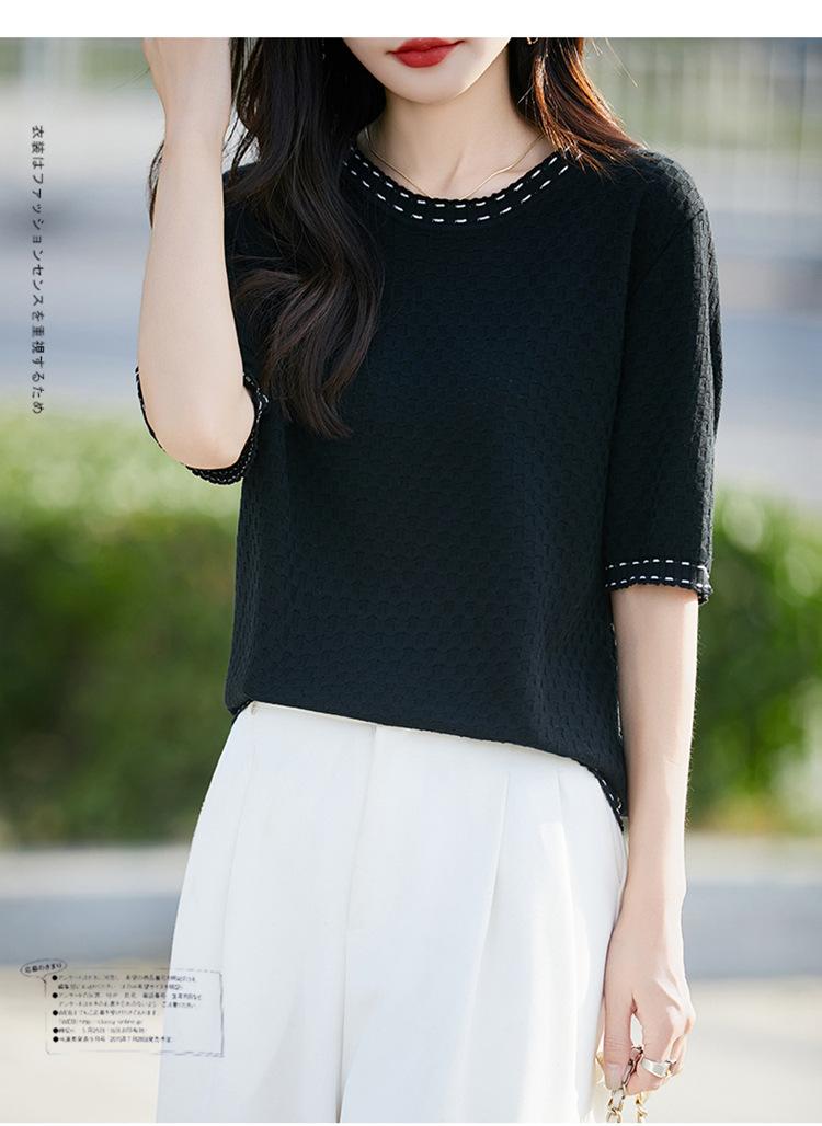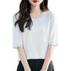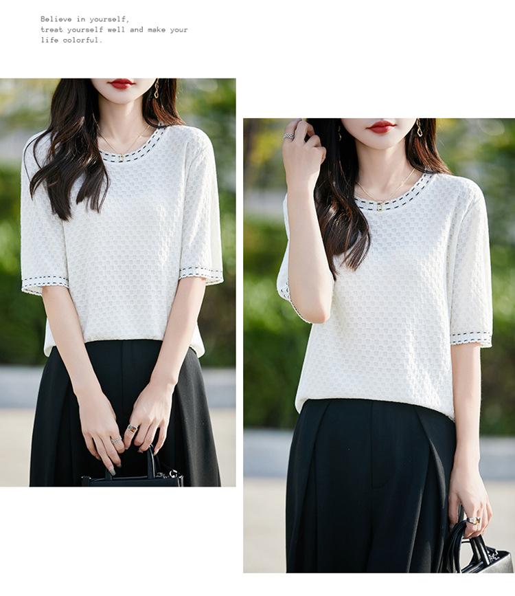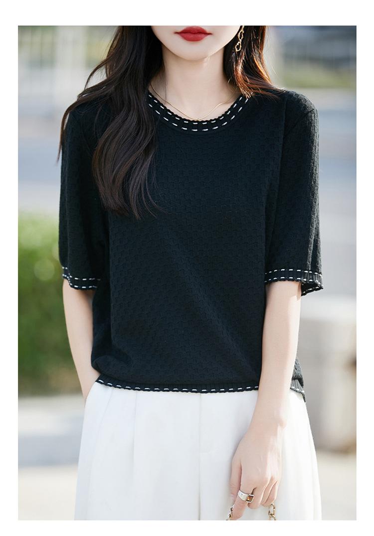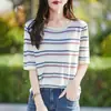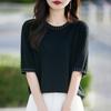 2025 Nuevo Verano Tencel Lyocell Cuello Redondo Tejido de Punto Camiseta Manga Tres Cuartos para Mujer Jersey de Color Contrastante Camiseta Básica